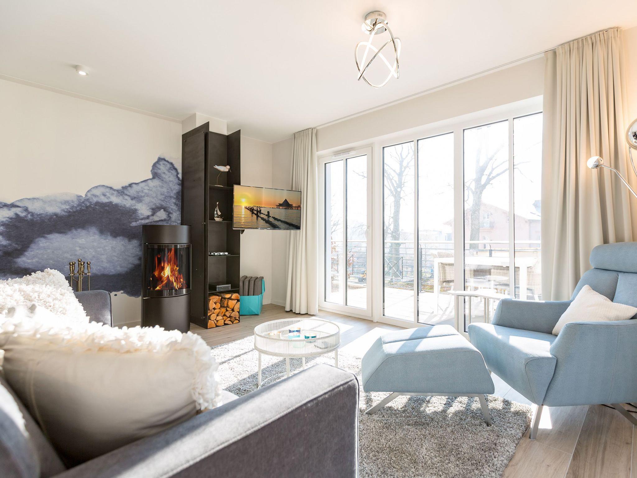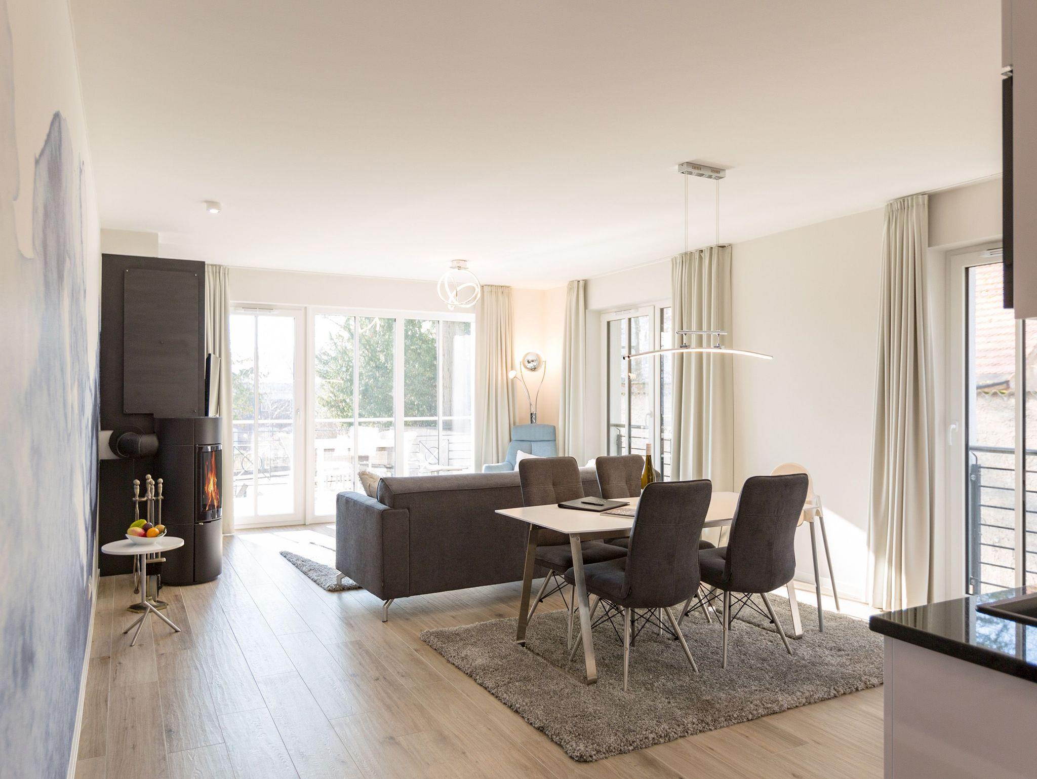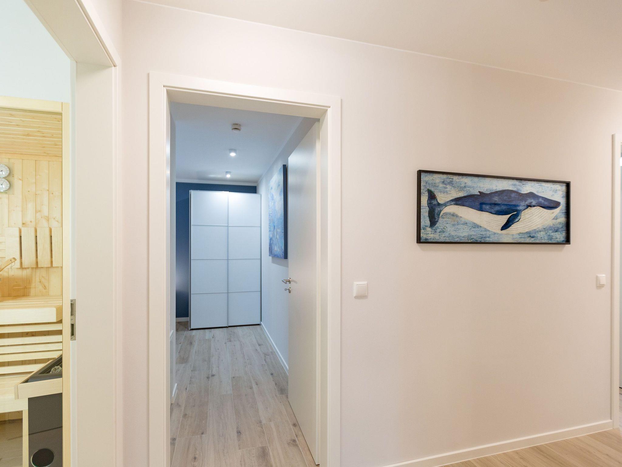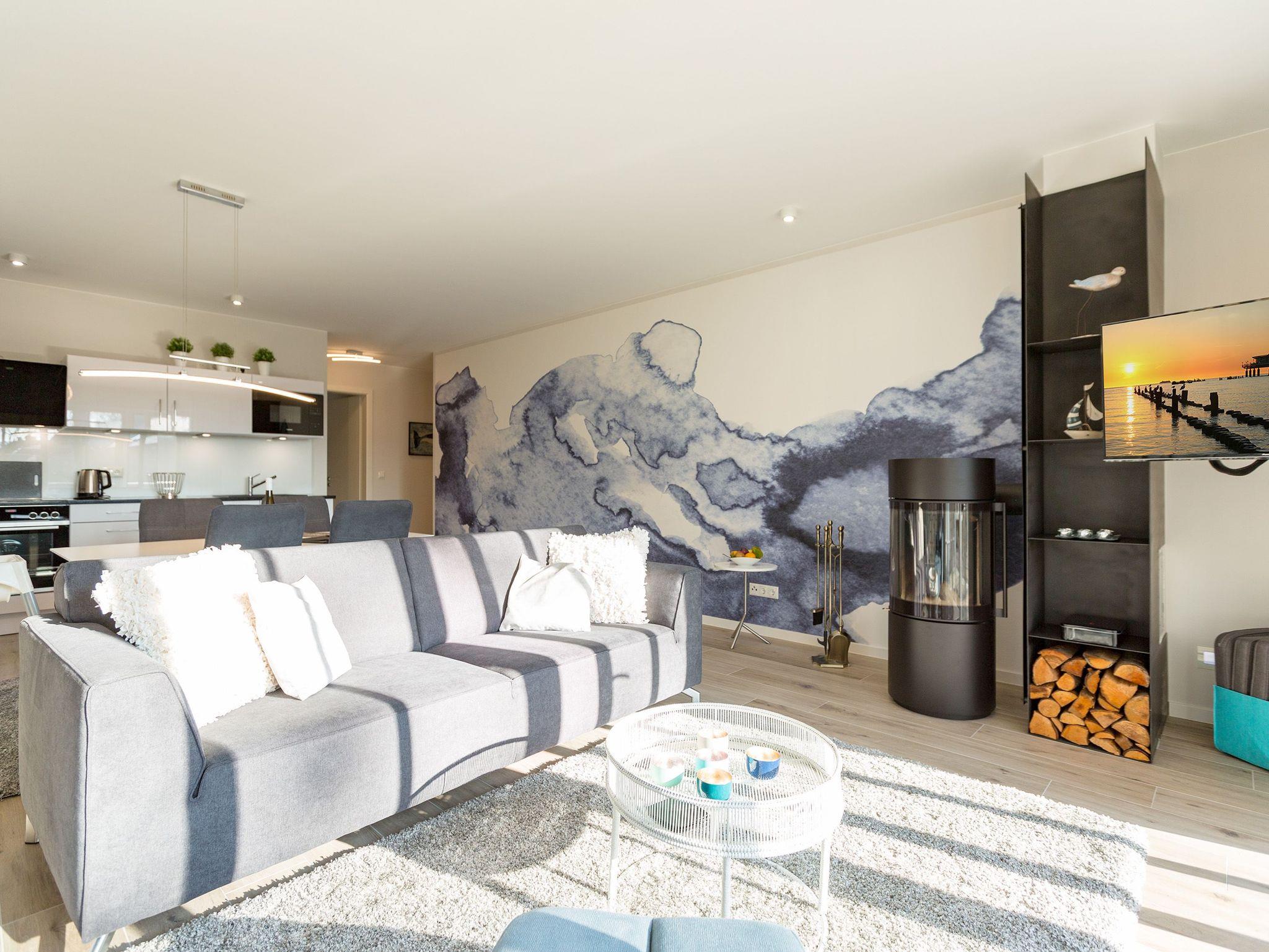 Urlauben wie im Paradies ? dieses Drei-Zimmer-Feriendomizil im Erdgeschoss macht den Traum von purer Entspannung wahr. Und das mit Stil. Die 84 Quadratmeter laden vier Personen und ein Kleinkind bis 3 Jahre (im Kinderreisebett) zum ausgiebigen Entspannen und Genießen ein. Viel Platz und viel Licht erwarten Sie. Die Einrichtung der gesamten Wohnung ist stylisch und modern. Nordisches Design verleiht dem Appartement eine edle und helle Atmosphäre. Das große Wohn-Ess-Zimmer ist ein wunderbarer Ort für gemeinsame Stunden beim Relaxen oder Essen. Ein komfortables Sofa mit Sessel ist für entspannte Fernsehzeiten vor dem großen Flat-TV oder gemütliche Momente vor dem Kaminofen ideal geeignet. Fallenlassen, abschalten und neue Energie tanken. Das können Sie auch am schönen großen Esstisch. Kochen Sie in der offenen Küche gemeinsam. Die Küche ist mit allen Geräten und mit edlem Geschirr voll ausgestattet. Die Sonne können Sie nicht nur am Strand, sondern auch auf ihrer eigenen Terrasse (10 Quadratmeter) genießen. Die Südost-Ausrichtung sorgt dafür, dass Sie hier schon morgens zum Frühstück Sonne haben. Die Wohnung verfügt zudem über eine zweite, kleine Terrasse (3 Quadratmeter). Damit jeder genügend Platz für sich und seine Bedürfnisse hat, gibt es zwei Schlafzimmer und auch zwei Bäder. Einigen müssen Sie sich dann nur noch, wer welche Farbe bevorzugt. Ausgestattet sind beide Schlafzimmer mit bequemen Boxspringdoppelbetten (1,80 m x 2,00 m), geräumigen Schränken und einem Flat-TV. In beiden Bädern gibt es eine Dusche, einen Waschtisch und ein WC. Zum absoluten Wellness-Highlight wird dieses Urlaubsdomizil durch die Finnische Sauna in einem der Bäder. So können Sie den Urlaub auch bei schlechtem Wetter oder im Winter genießen. Für Ihr Auto ist in der Tiefgarage ein Stellplatz reserviert. Und bei Ankunft sind auch die Betten bereits bezogen und Handtücher liegen bereit.