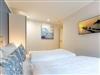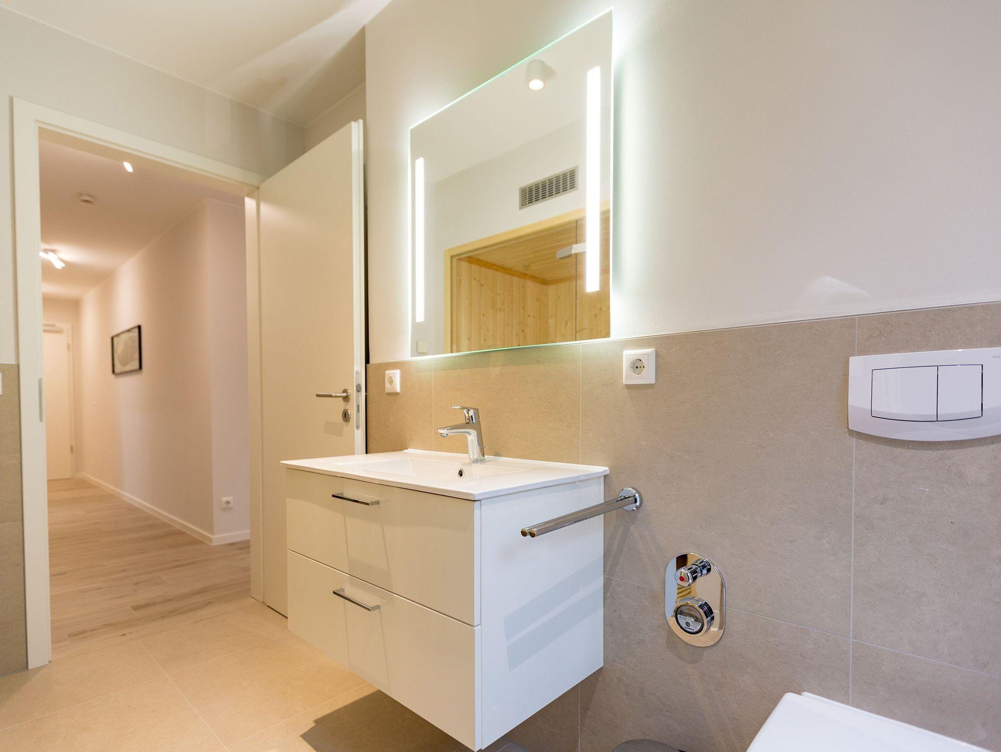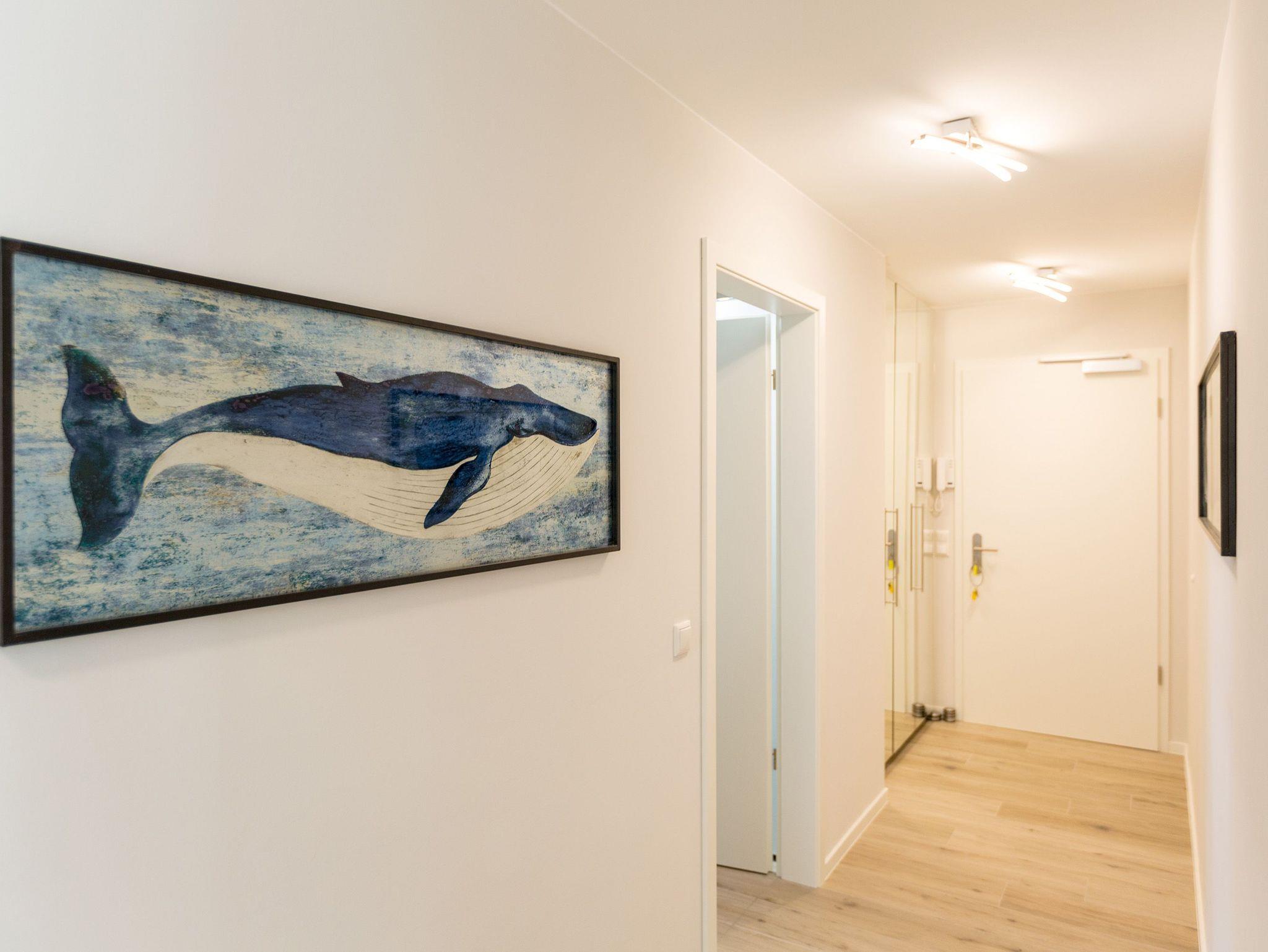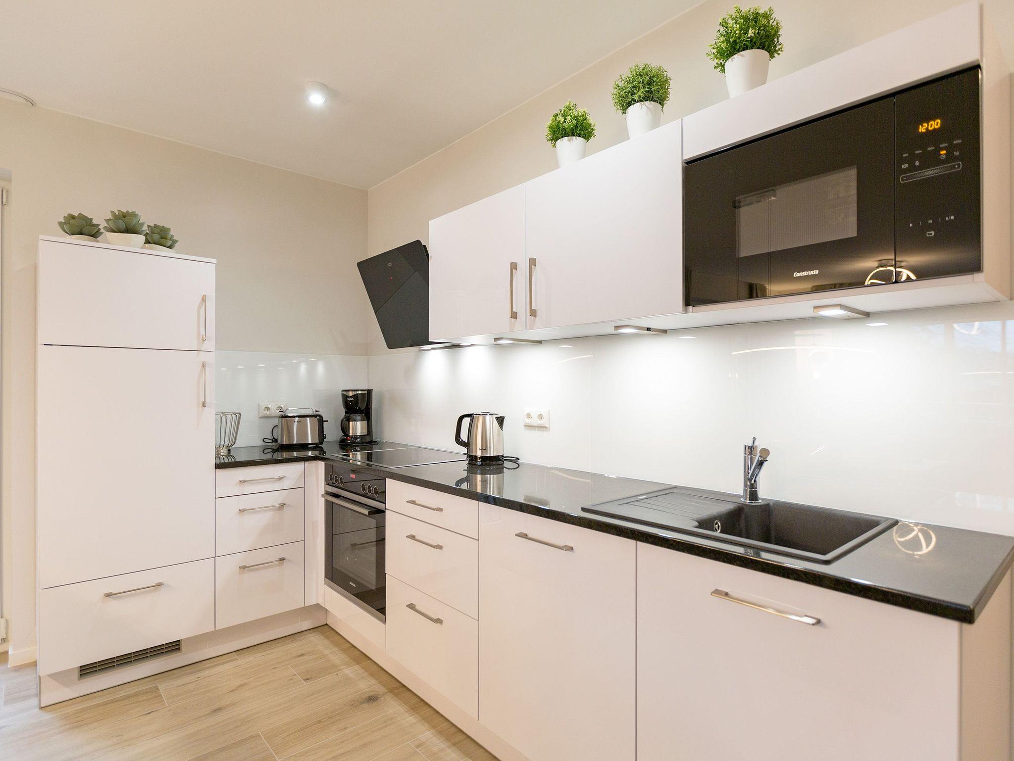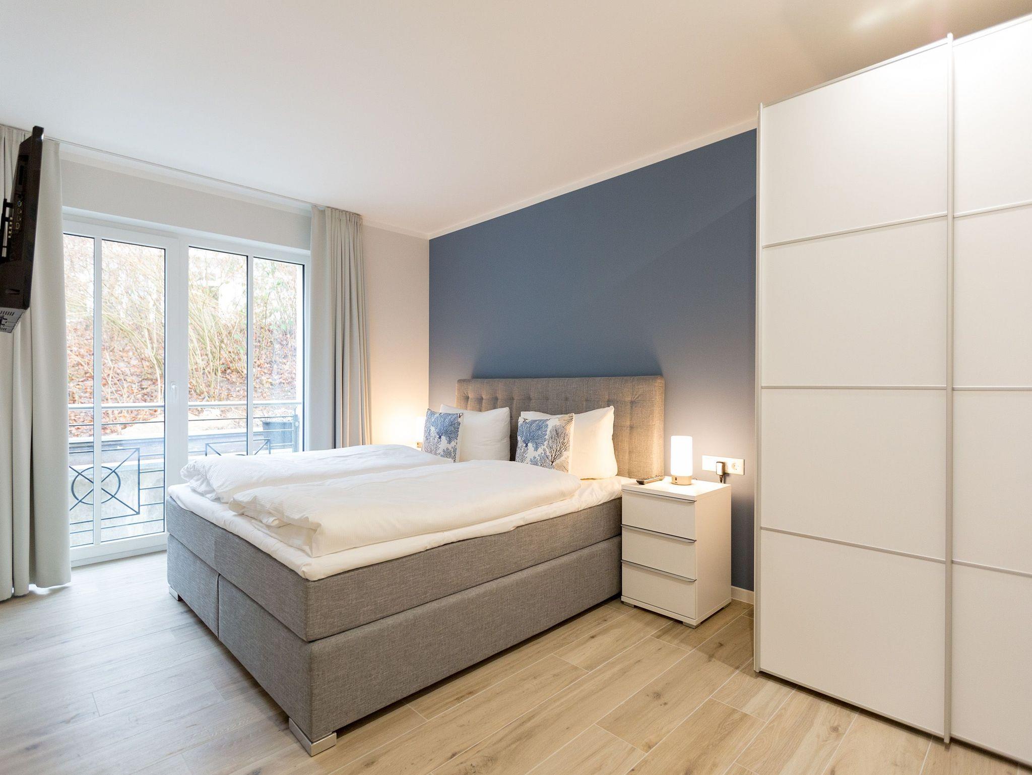 Urlauben wie im Paradies ? dieses Drei-Zimmer-Feriendomizil im Erdgeschoss macht den Traum von purer Entspannung wahr. Und das mit Stil. Die 84 Quadratmeter laden vier Personen und ein Kleinkind bis 3 Jahre (im Kinderreisebett) zum ausgiebigen Entspannen und Genießen ein. Viel Platz und viel Licht erwarten Sie. Die Einrichtung der gesamten Wohnung ist stylisch und modern. Nordisches Design verleiht dem Appartement eine edle und helle Atmosphäre. Das große Wohn-Ess-Zimmer ist ein wunderbarer Ort für gemeinsame Stunden beim Relaxen oder Essen. Ein komfortables Sofa mit Sessel ist für entspannte Fernsehzeiten vor dem großen Flat-TV oder gemütliche Momente vor dem Kaminofen ideal geeignet. Fallenlassen, abschalten und neue Energie tanken. Das können Sie auch am schönen großen Esstisch. Kochen Sie in der offenen Küche gemeinsam. Die Küche ist mit allen Geräten und mit edlem Geschirr voll ausgestattet. Die Sonne können Sie nicht nur am Strand, sondern auch auf ihrer eigenen Terrasse (10 Quadratmeter) genießen. Die Südost-Ausrichtung sorgt dafür, dass Sie hier schon morgens zum Frühstück Sonne haben. Die Wohnung verfügt zudem über eine zweite, kleine Terrasse (3 Quadratmeter). Damit jeder genügend Platz für sich und seine Bedürfnisse hat, gibt es zwei Schlafzimmer und auch zwei Bäder. Einigen müssen Sie sich dann nur noch, wer welche Farbe bevorzugt. Ausgestattet sind beide Schlafzimmer mit bequemen Boxspringdoppelbetten (1,80 m x 2,00 m), geräumigen Schränken und einem Flat-TV. In beiden Bädern gibt es eine Dusche, einen Waschtisch und ein WC. Zum absoluten Wellness-Highlight wird dieses Urlaubsdomizil durch die Finnische Sauna in einem der Bäder. So können Sie den Urlaub auch bei schlechtem Wetter oder im Winter genießen. Für Ihr Auto ist in der Tiefgarage ein Stellplatz reserviert. Und bei Ankunft sind auch die Betten bereits bezogen und Handtücher liegen bereit.