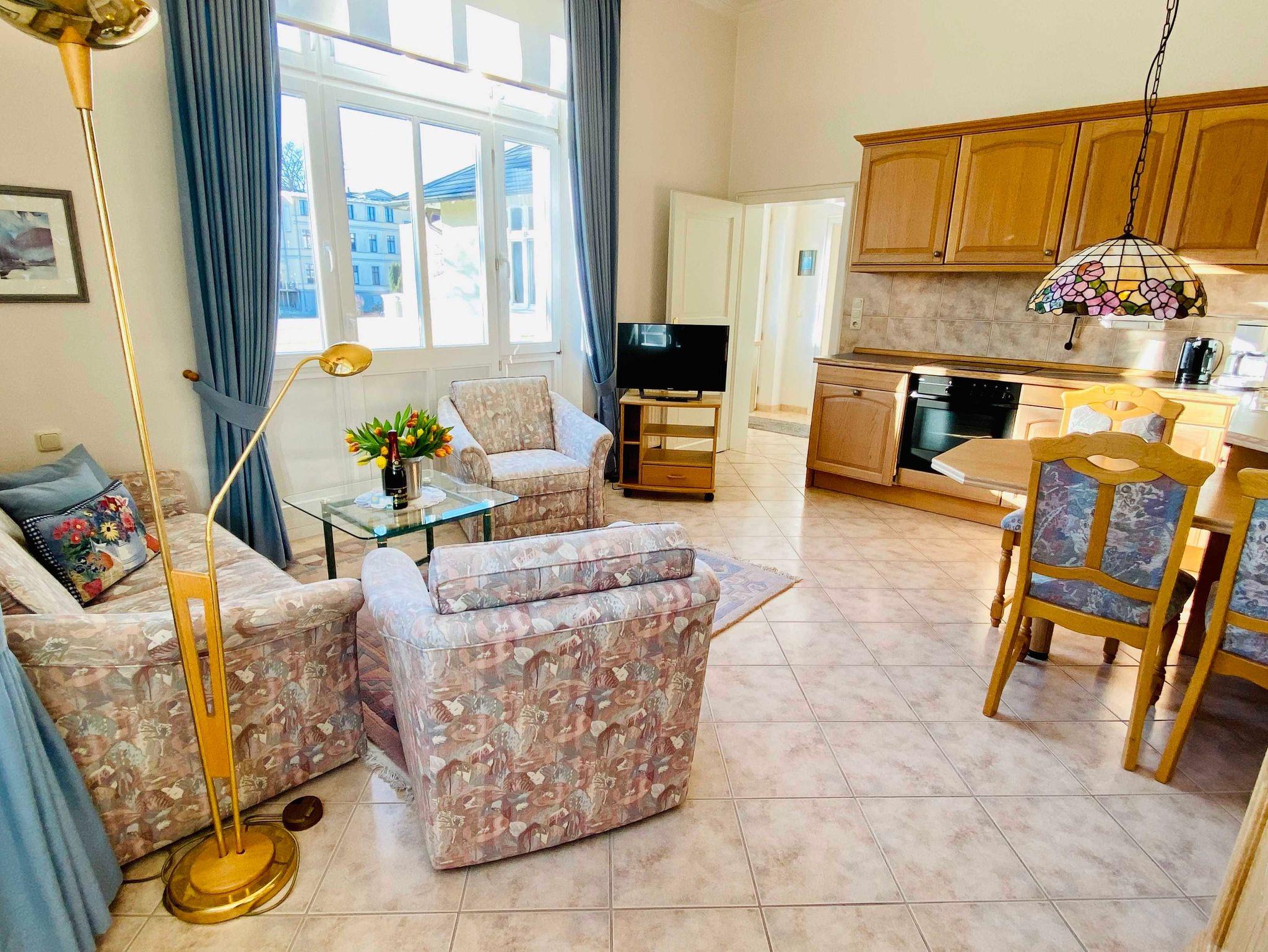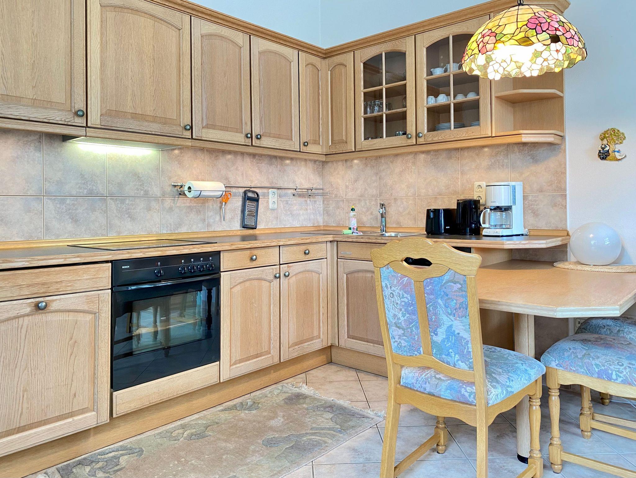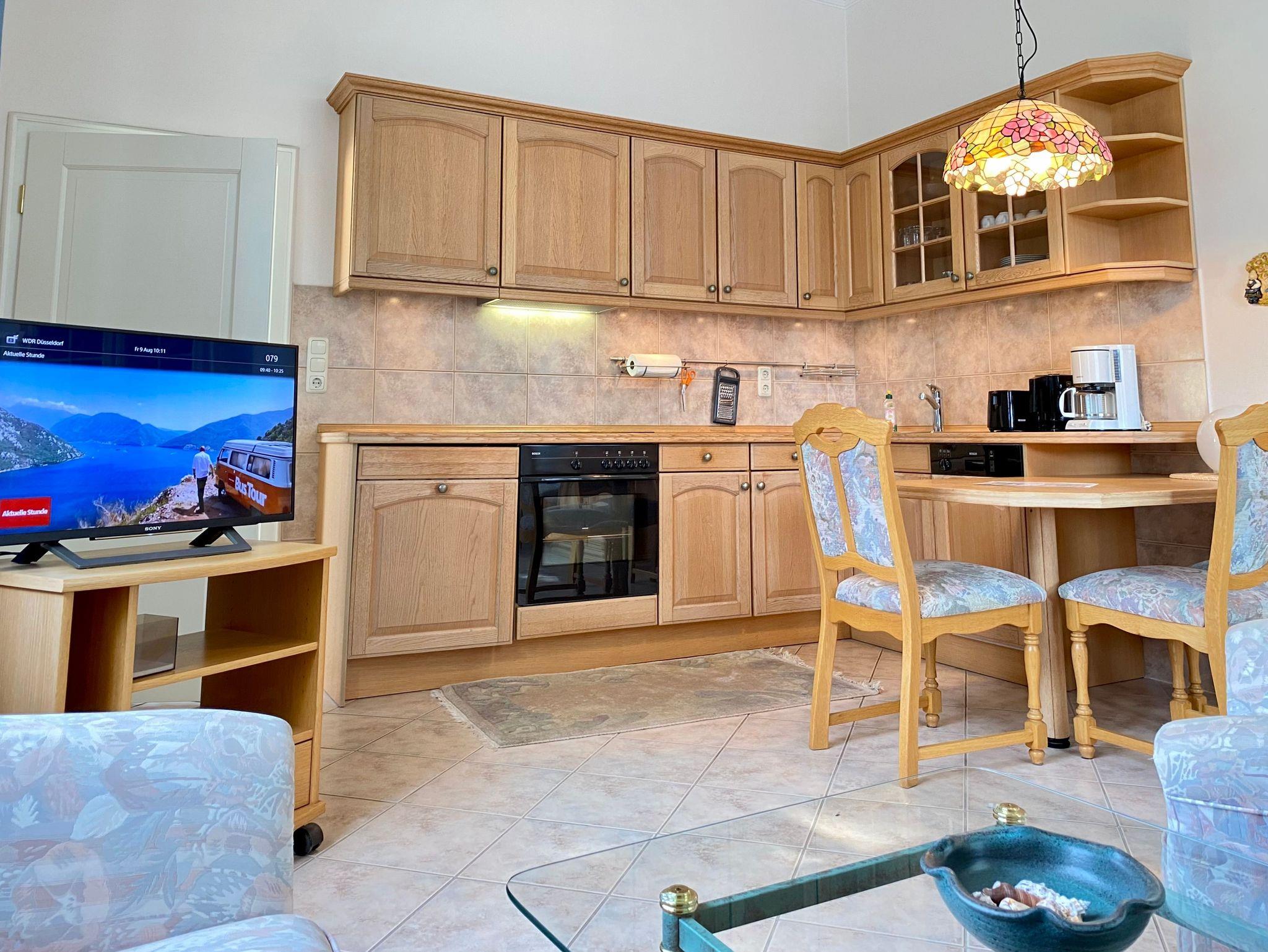 Das gemütliche Wohnzimmer ist mit einer Sitzcouch, ein Sessel und ein kleinen Esstisch und kompletten Küchenzeile ausgestattet. Es gibt ein Schlafzimmer mit Doppelbett und Kleiderschrank. Die Wohnung hat kleines Bad mit Dusche