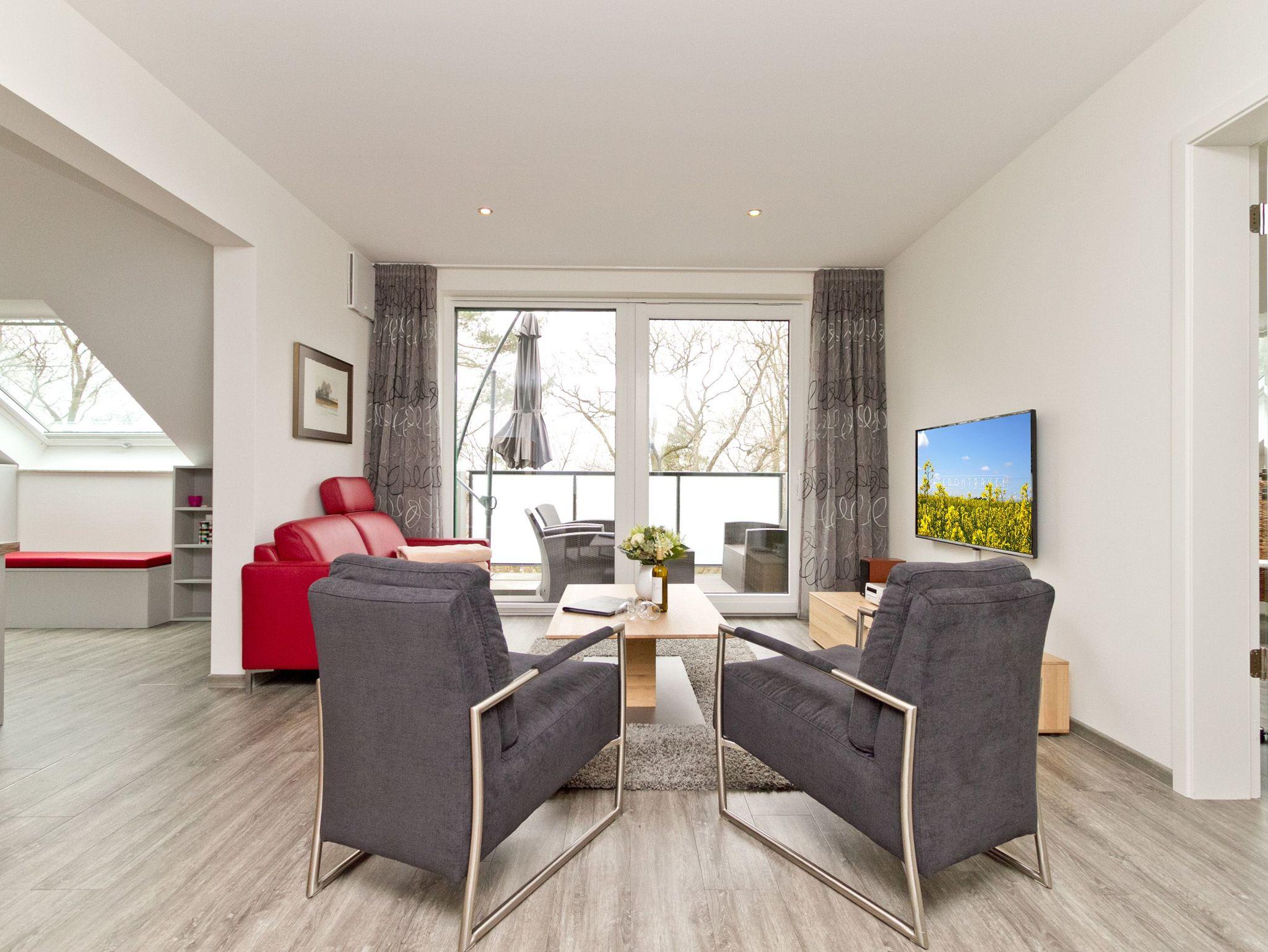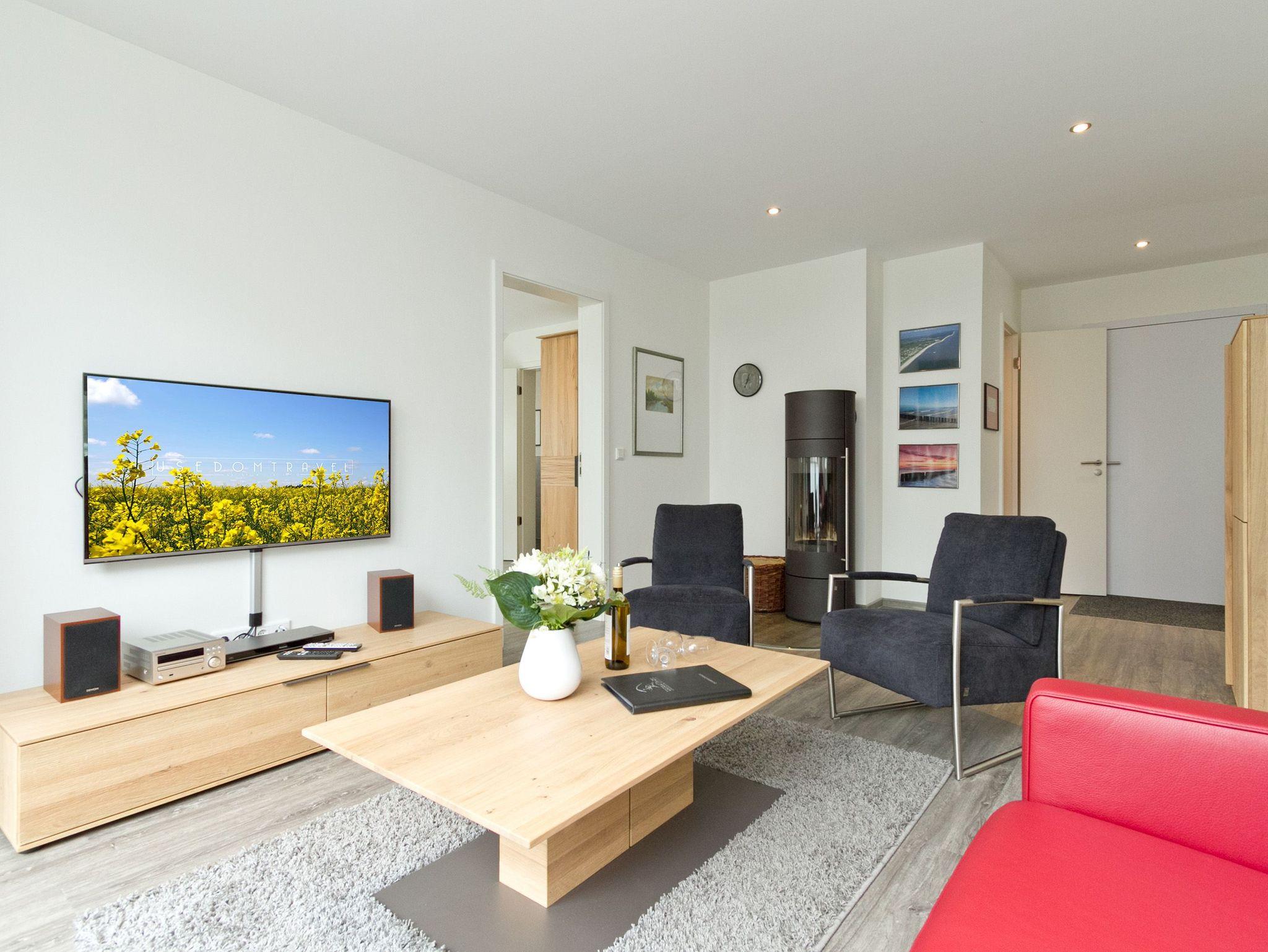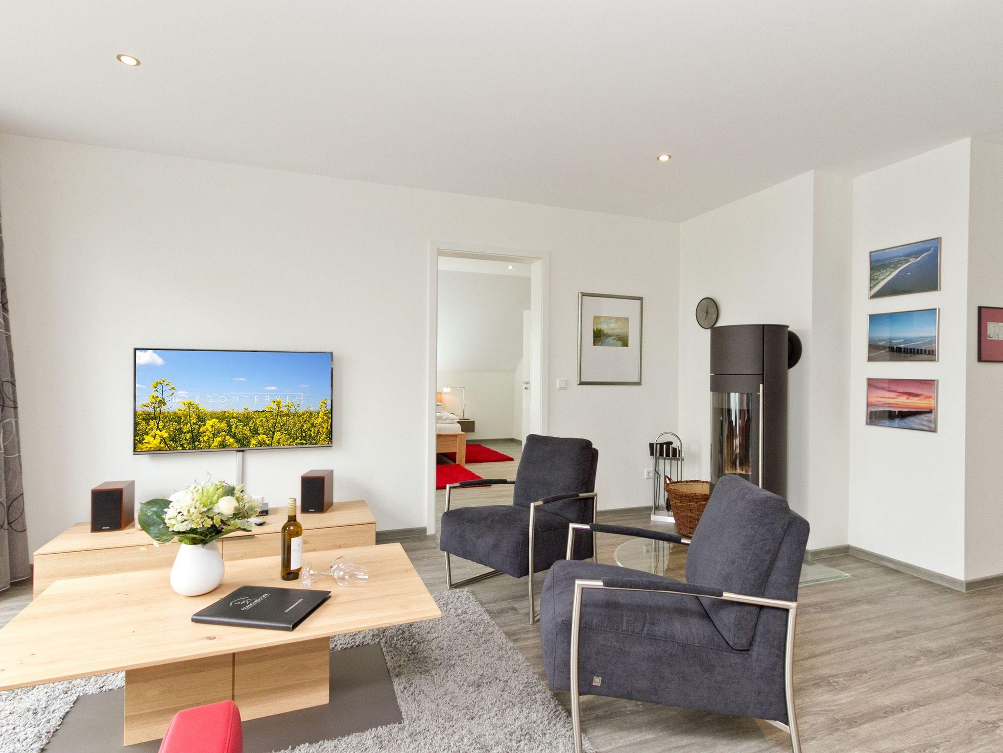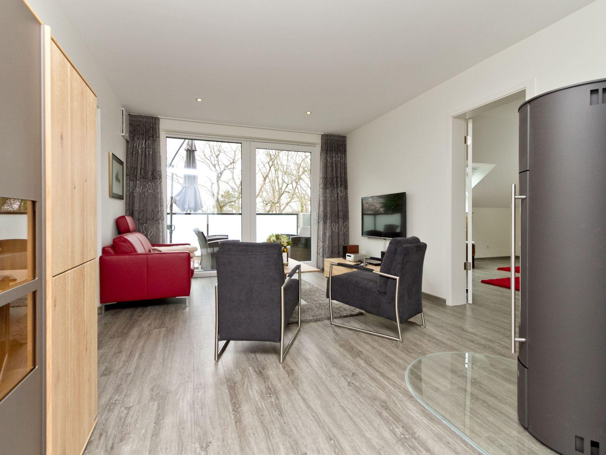 Hell, großzügig und modern ? das Appartement 17 im 2. Obergeschoss bietet auf 85 Quadratmetern entspannten und stylischen Wohnkomfort für vier Personen und ein Kleinkind im Kinderreisebett. Auch ihr Hund wird dieses schöne Urlaubsdomizil lieben. Denn hier darf er mit in den Urlaub. Eine absolute Wohlfühlzone ist das geräumige und offene Wohn-Esszimmer mit einem wunderschönen, gekälkten Holztisch, einem Echtholzkaminofen und einer gemütlichen Sofa-Sitzgruppe. Am großen Tisch finden alle für gemeinsame Mahlzeiten Platz. Genauso auf der roten Ledercouch und den Sesseln. Genießen Sie unvergessliche Momente zusammen. Ein Flat-TV mit DVD-Player sorgt für beste Heimkinounterhaltung. Die offene Küche ist hochmodern und mit Highend-Geräten wie einer Kochinsel mit Bora-Abzug ausgestattet. Geschirrspüler, Kühlschrank, Mikrowelle, Wasch-Trockner, Geschirr ? alles ist da. Vom Wohnzimmer aus haben Sie Zugang zu einem Balkon (8 Quadratmeter) mit Gartenmöbeln. Es gibt doch nichts Schöneres, als im Sommerurlaub unter freiem Himmel zu frühstücken. Das Appartement verfügt über zwei Schlafzimmer. Eines ist mit einem Doppelbett (1,80 m x 2,00 m), einem Flat-TV, einem Sideboard und einem Schrank ausgestattet. An dieses Zimmer schließt sich das Masterbad mit ebenerdiger, sehr großzügig geschnittener Dusche, Doppelwaschtisch und WC an. Im zweiten Schlafzimmer gibt es eine ausklappbare Schlafcouch (1,80 m x 2,00 m), ebenfalls einen Flat-TV, eine Kommode und einen Schrank für die Urlaubsgarderobe. Das zweite Schlafzimmer hat einen eigenen, kleinen Balkon (4 Quadratmeter). Ein separates Gäste-WC sorgt dafür, dass es bei dringenden Angelegenheiten keinen Stau gibt. Handtücher liegen für Sie bereit und auch die Betten sind bei Anreise bezogen. Auf Wunsch stellen wir für die kleinen Gäste ein Kinderreisebett (ohne zusätzliche Matratze [&] Bettzeug) und einen Kinderhochstuhl (gegen Aufpreis) zur Verfügung. Das WLAN-Netz ist kostenfrei nutzbar.