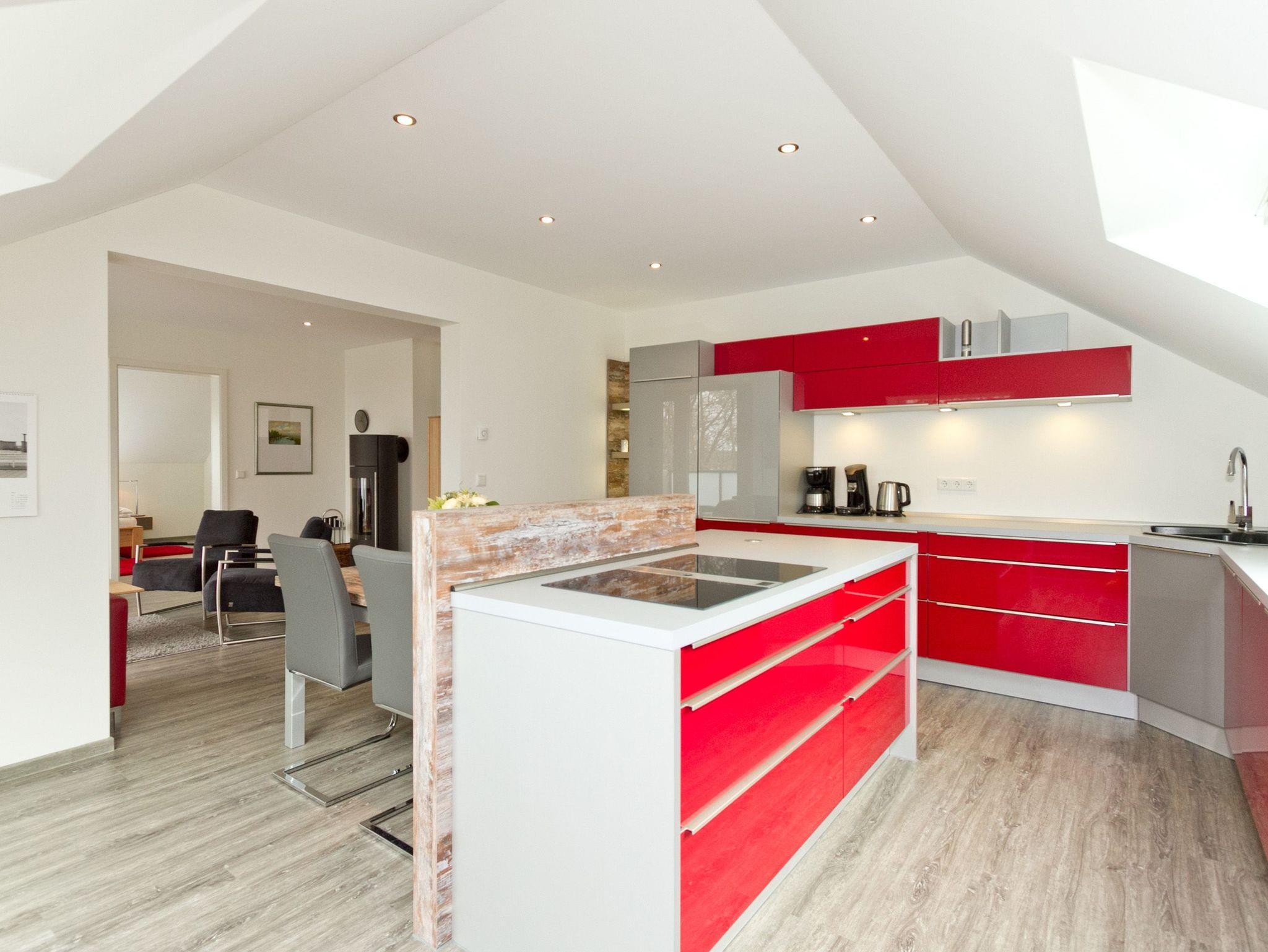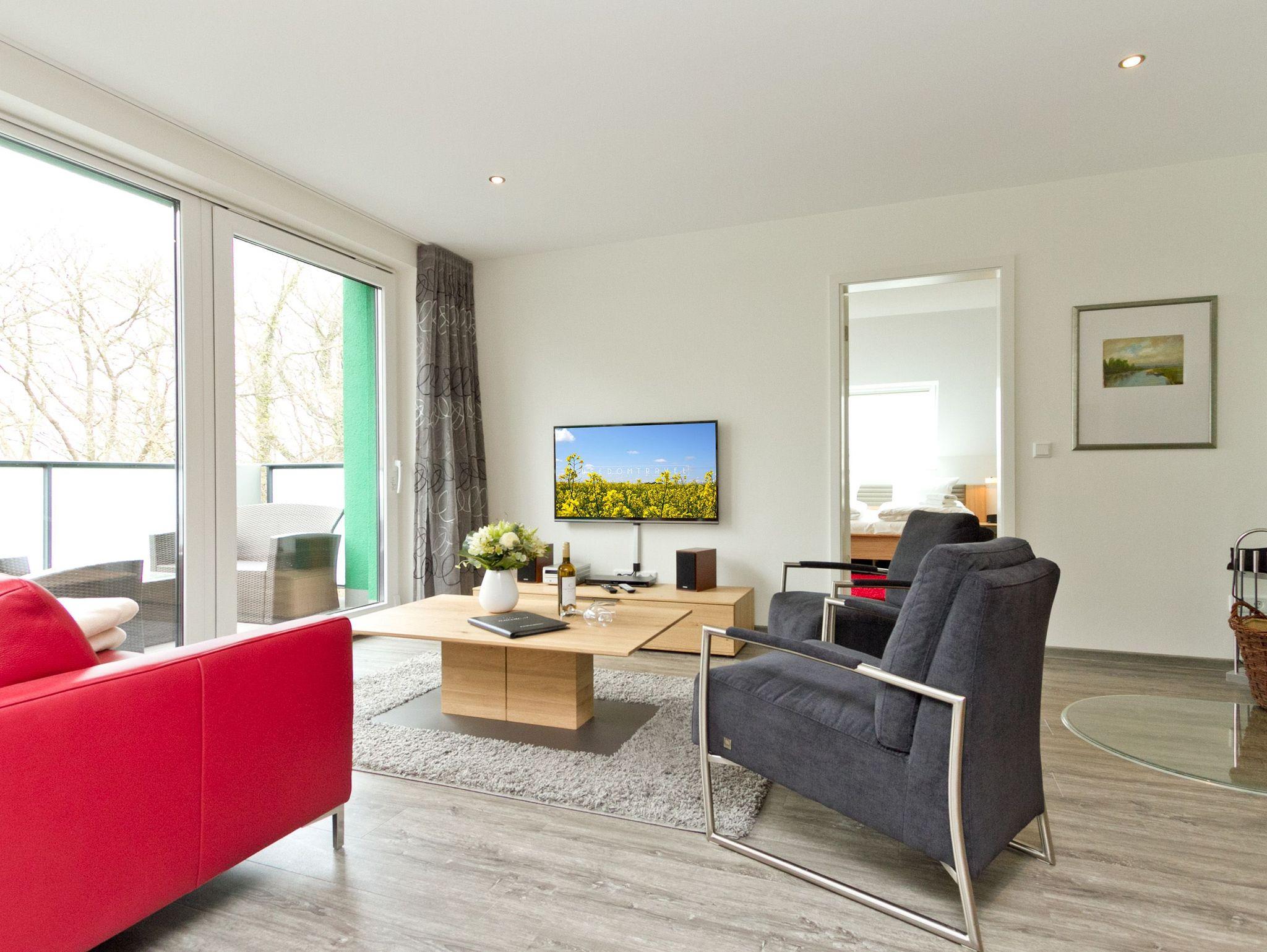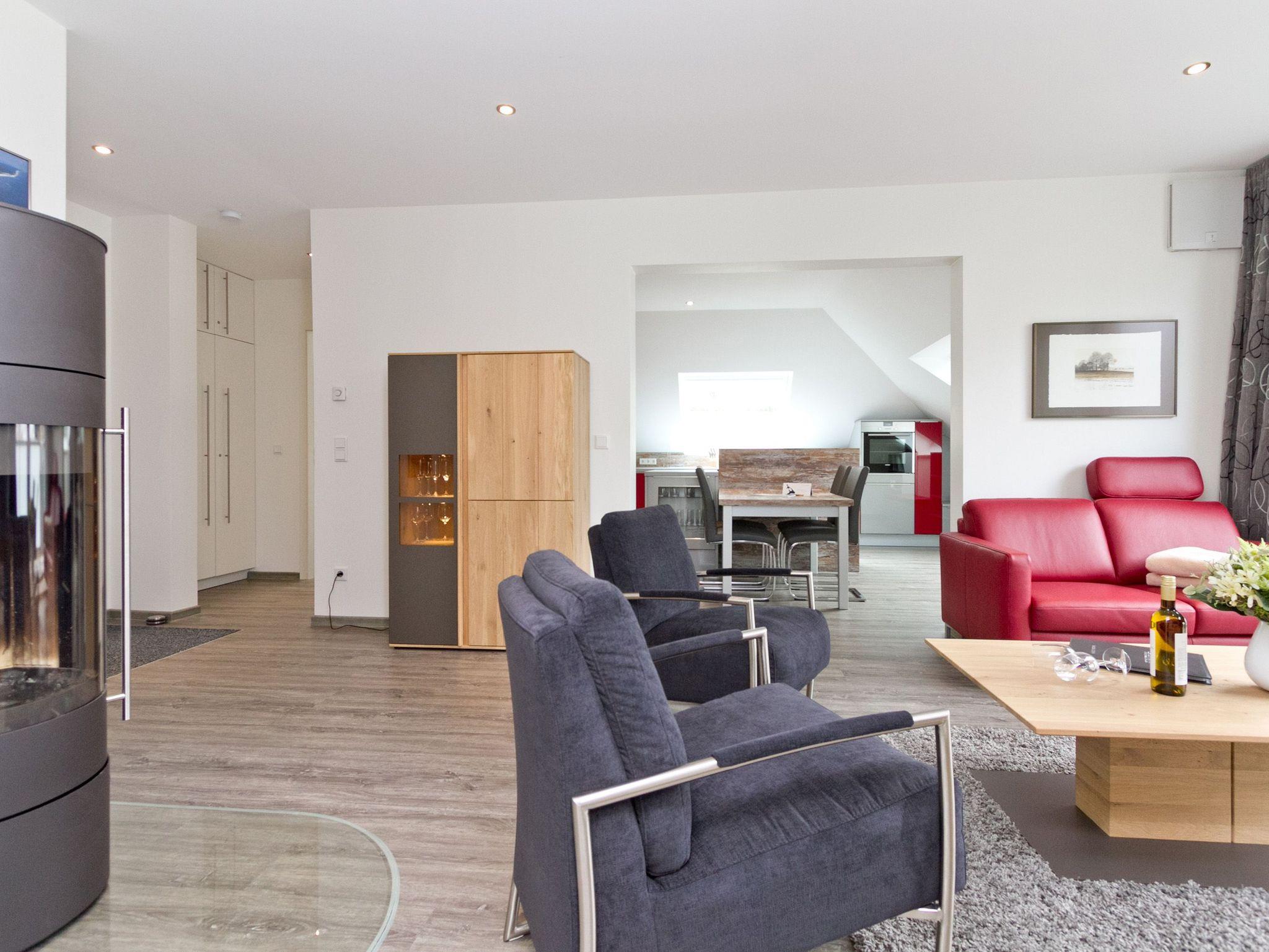 Hell, großzügig und modern ? das Appartement 17 im 2. Obergeschoss bietet auf 85 Quadratmetern entspannten und stylischen Wohnkomfort für vier Personen und ein Kleinkind im Kinderreisebett. Auch ihr Hund wird dieses schöne Urlaubsdomizil lieben. Denn hier darf er mit in den Urlaub. Eine absolute Wohlfühlzone ist das geräumige und offene Wohn-Esszimmer mit einem wunderschönen, gekälkten Holztisch, einem Echtholzkaminofen und einer gemütlichen Sofa-Sitzgruppe. Am großen Tisch finden alle für gemeinsame Mahlzeiten Platz. Genauso auf der roten Ledercouch und den Sesseln. Genießen Sie unvergessliche Momente zusammen. Ein Flat-TV mit DVD-Player sorgt für beste Heimkinounterhaltung. Die offene Küche ist hochmodern und mit Highend-Geräten wie einer Kochinsel mit Bora-Abzug ausgestattet. Geschirrspüler, Kühlschrank, Mikrowelle, Wasch-Trockner, Geschirr ? alles ist da. Vom Wohnzimmer aus haben Sie Zugang zu einem Balkon (8 Quadratmeter) mit Gartenmöbeln. Es gibt doch nichts Schöneres, als im Sommerurlaub unter freiem Himmel zu frühstücken. Das Appartement verfügt über zwei Schlafzimmer. Eines ist mit einem Doppelbett (1,80 m x 2,00 m), einem Flat-TV, einem Sideboard und einem Schrank ausgestattet. An dieses Zimmer schließt sich das Masterbad mit ebenerdiger, sehr großzügig geschnittener Dusche, Doppelwaschtisch und WC an. Im zweiten Schlafzimmer gibt es eine ausklappbare Schlafcouch (1,80 m x 2,00 m), ebenfalls einen Flat-TV, eine Kommode und einen Schrank für die Urlaubsgarderobe. Das zweite Schlafzimmer hat einen eigenen, kleinen Balkon (4 Quadratmeter). Ein separates Gäste-WC sorgt dafür, dass es bei dringenden Angelegenheiten keinen Stau gibt. Handtücher liegen für Sie bereit und auch die Betten sind bei Anreise bezogen. Auf Wunsch stellen wir für die kleinen Gäste ein Kinderreisebett (ohne zusätzliche Matratze [&] Bettzeug) und einen Kinderhochstuhl (gegen Aufpreis) zur Verfügung. Das WLAN-Netz ist kostenfrei nutzbar.