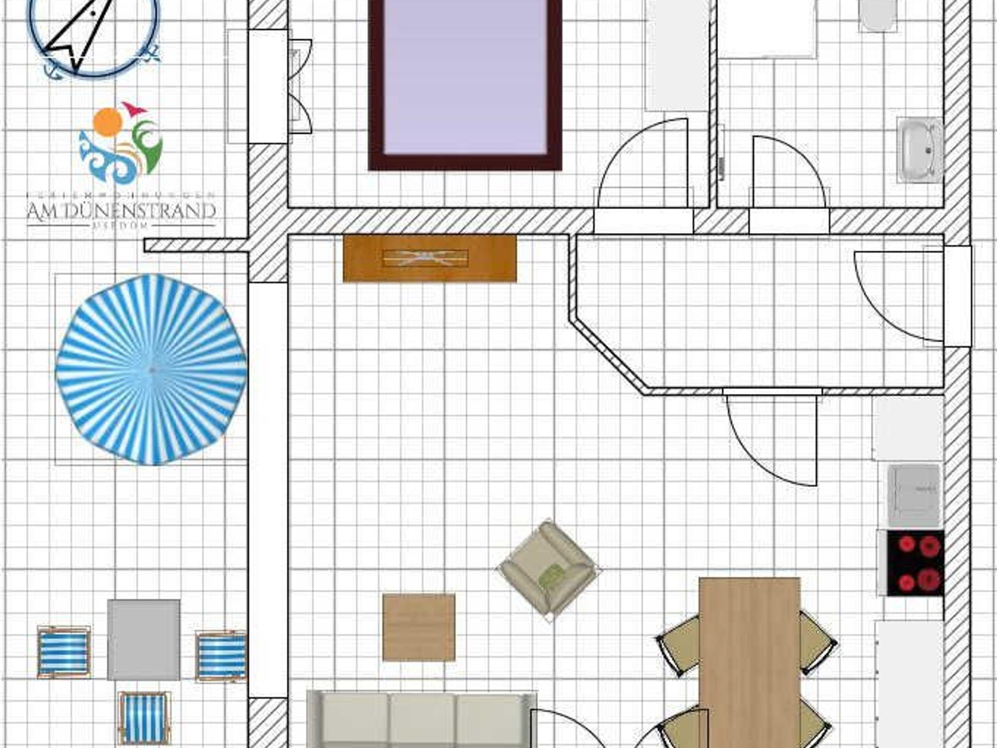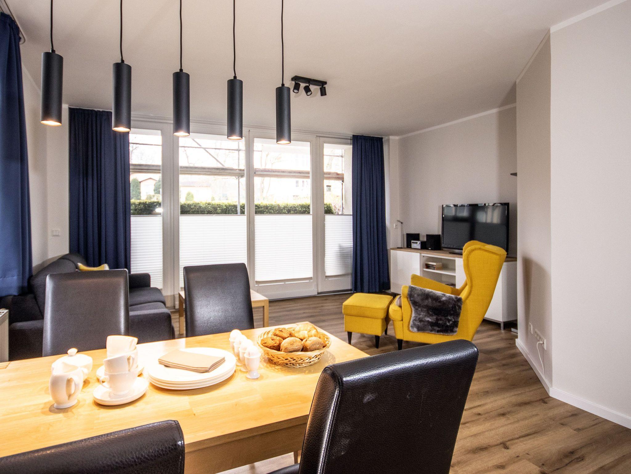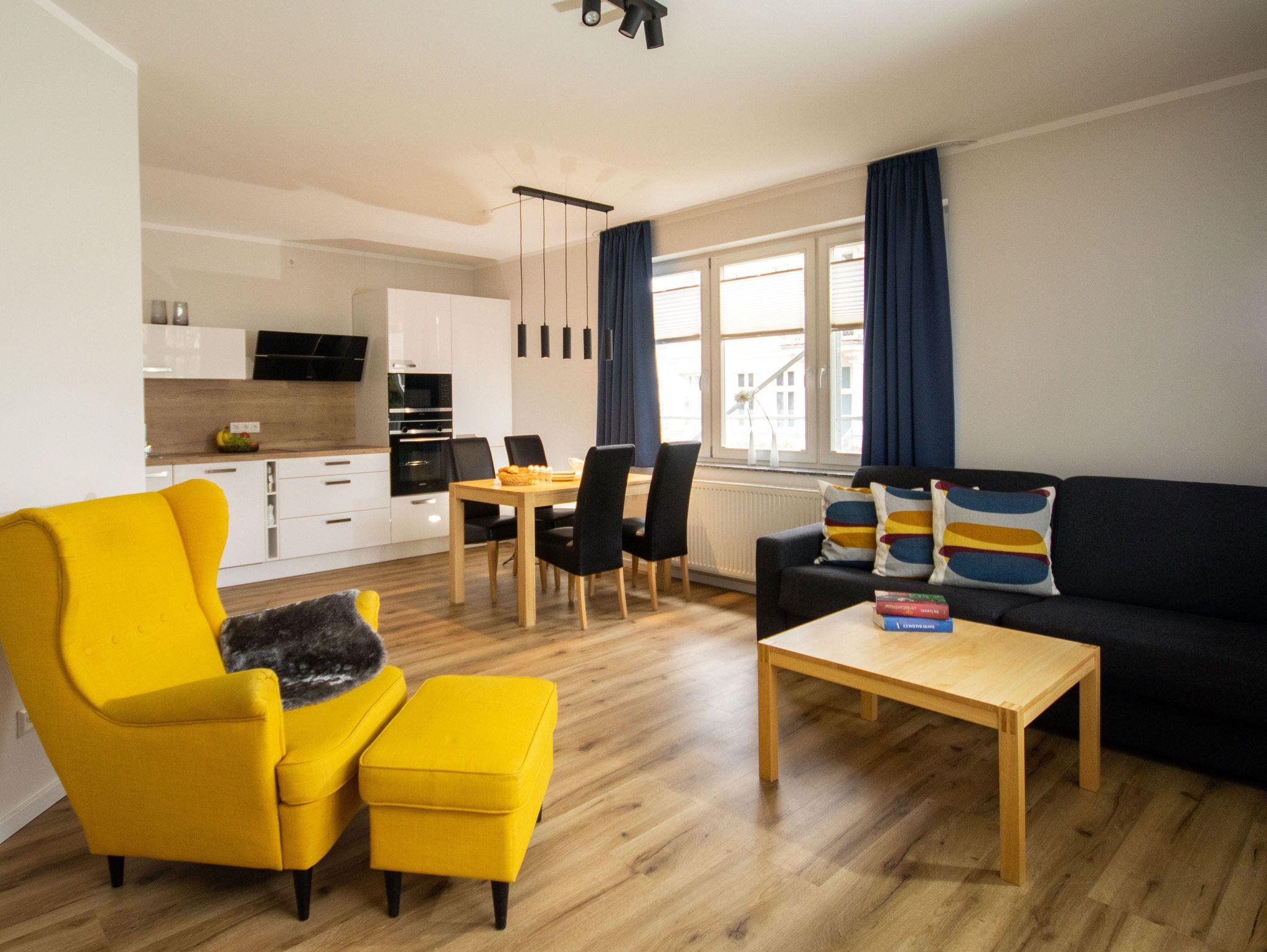 Auf 48qm bietet sie Platz für bis zu vier Personen und verfügt dabei über ein Wohnzimmer mit einer komfortablen Schlafcouch für die 3. und 4.Person, eine komplett ausgestattete Küchenzeile mit Geschirrspüler,