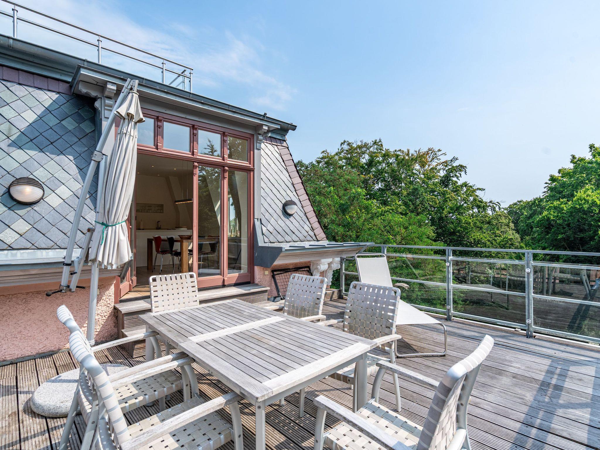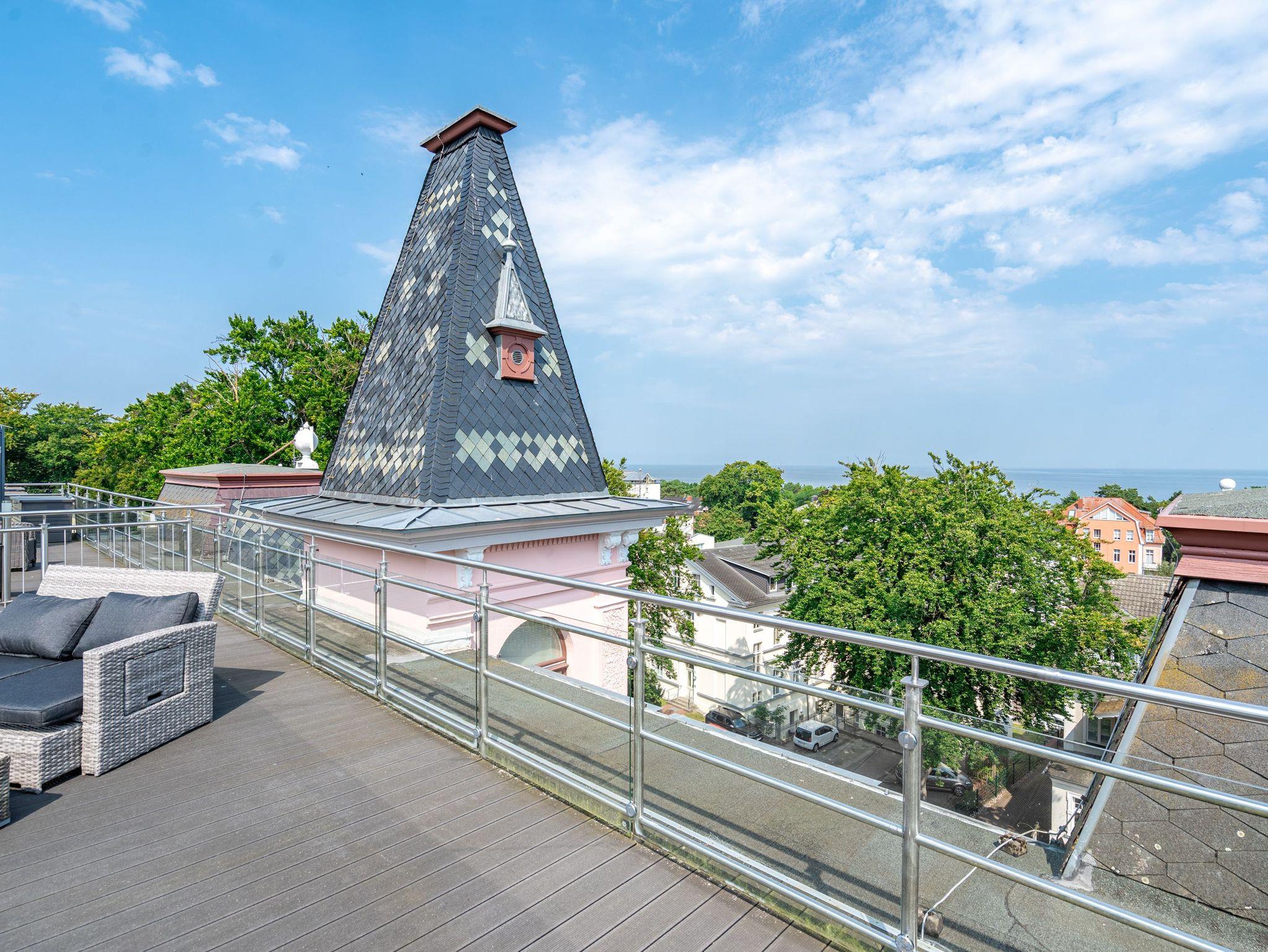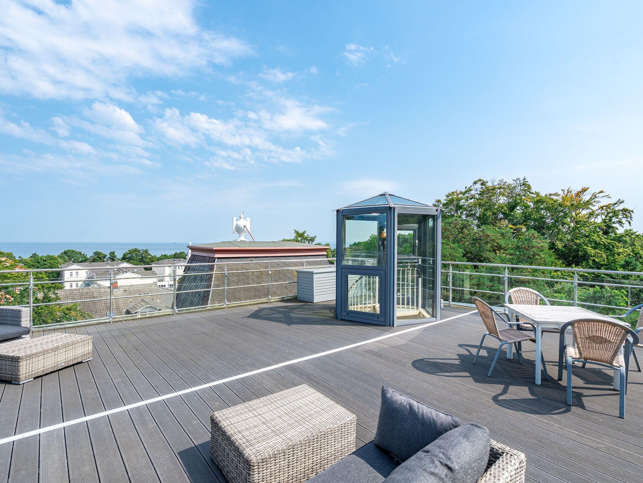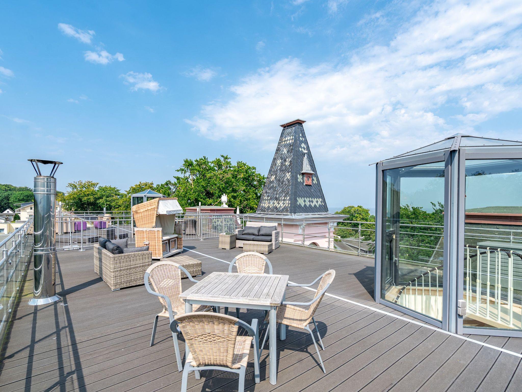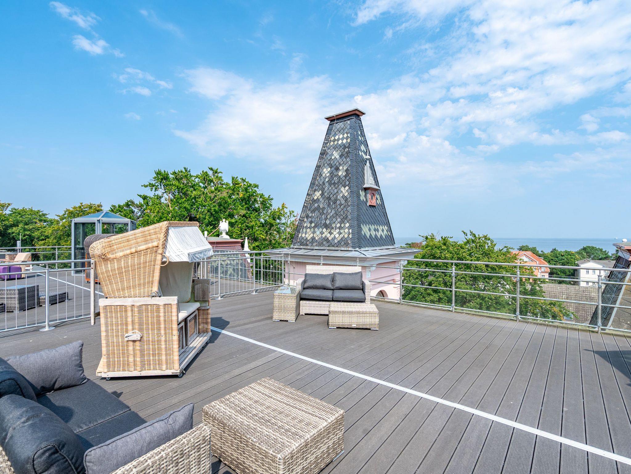 Im Dachgeschoss der Villa Hintze erwarten Sie großzügige 125 qm Luxus! Die neu gestaltete Ferienwohnung 13 (für maximal 4 Personen) offeriert Ihnen ein Wohnambiente der besonderen Art und jede Menge Ausblick auf die Ostsee! Helle, großzügige Räume, moderne Kunst und Möbel von bekannten Designern erfüllen auch anspruchsvolle Urlaubswünsche. Der Wohnbereich mit Sitzgruppe vor dem Kamin und Flat-TV wird ergänzt durch den exklusiven Küchenbereich mit schönem Essplatz. Von hier hat man Zugang zum sonnigen Südbalkon der mit Gartenmöbeln und Sonnenliege von Garpa ausgestattet ist. An den Masterbedroom mit Doppelbett und großem Einbauschrank ist ein wunderschönes Bad mit Badewanne, großer Echtglasdusche und Doppelwaschtisch angegliedert. Und das Beste - schon morgens beim Aufwachen blicken Sie von Ihrem Bett aus über die Dächer der ersten Reihe auf das Meer! Ein zweites, kleineres Schlafzimmer bietet ebenfalls ein Doppelbett (1,60m) und auch ein zweites Bad mit Dusche steht zur Verfügung. Ein ganz besonderes Highlight ist die riesige 100 qm Dachterrasse (über die wohnungseigene Wendeltreppe zu erreichen), die einen traumhaften Blick auf das Meer und Heringsdorf bietet. Hier schaffen die Sitzgruppe, der Strandkorb oder eine bequeme Liegewiese genug Auswahlmöglichkeiten zum Relaxen. In einem separaten Abstellraum auf dem Hausflur können Waschmaschine und Trockener genutzt werden. Für Ihren Komfort sind die Betten bei der Anreise bezogen und Handtücher liegen bereit. Ein Pkw-Stellplatz steht auf dem abgeschlossenen Grundstück zur Verfügung. Das WLAN in der Wohnung ist kostenlos nutzbar.