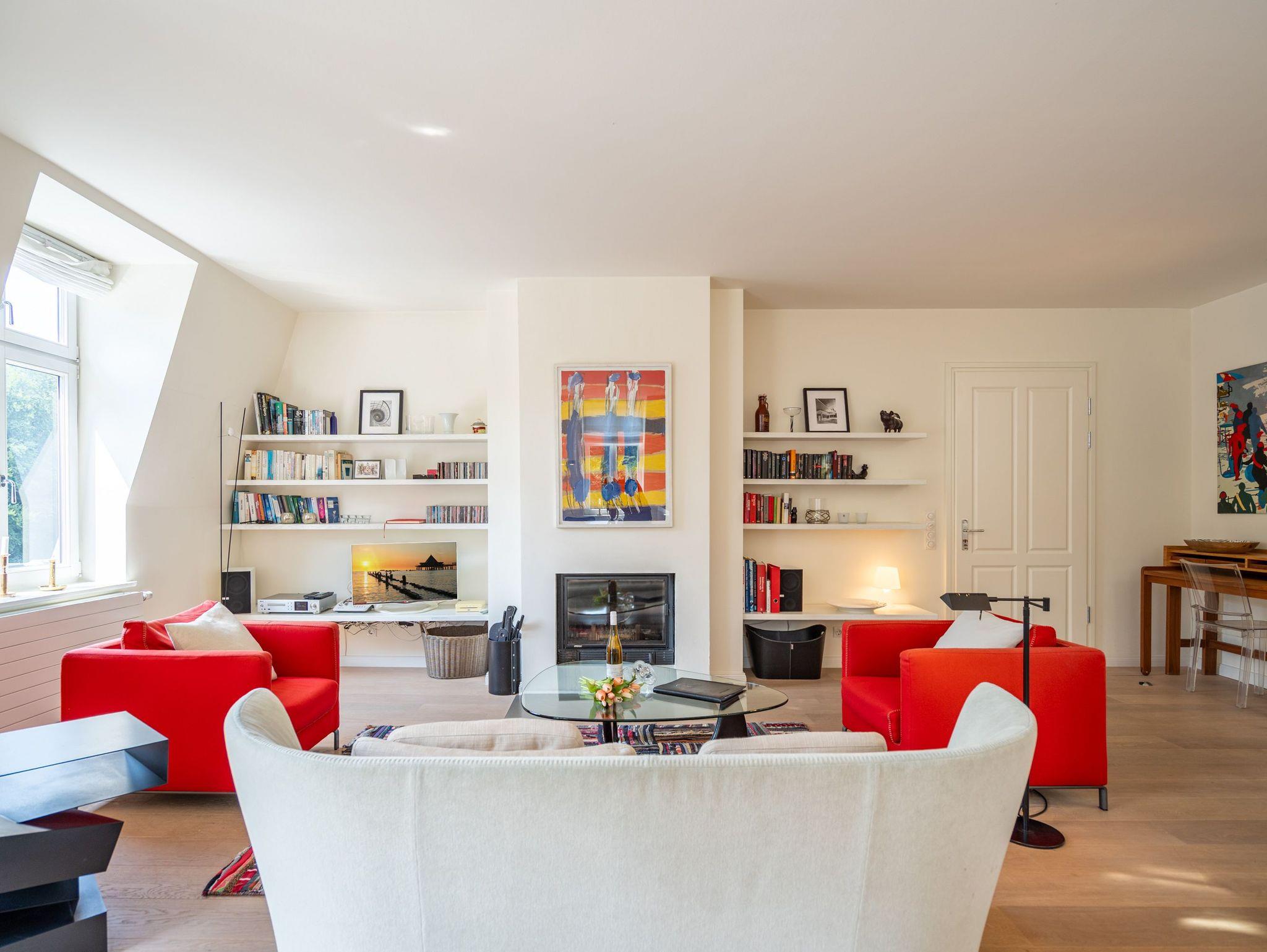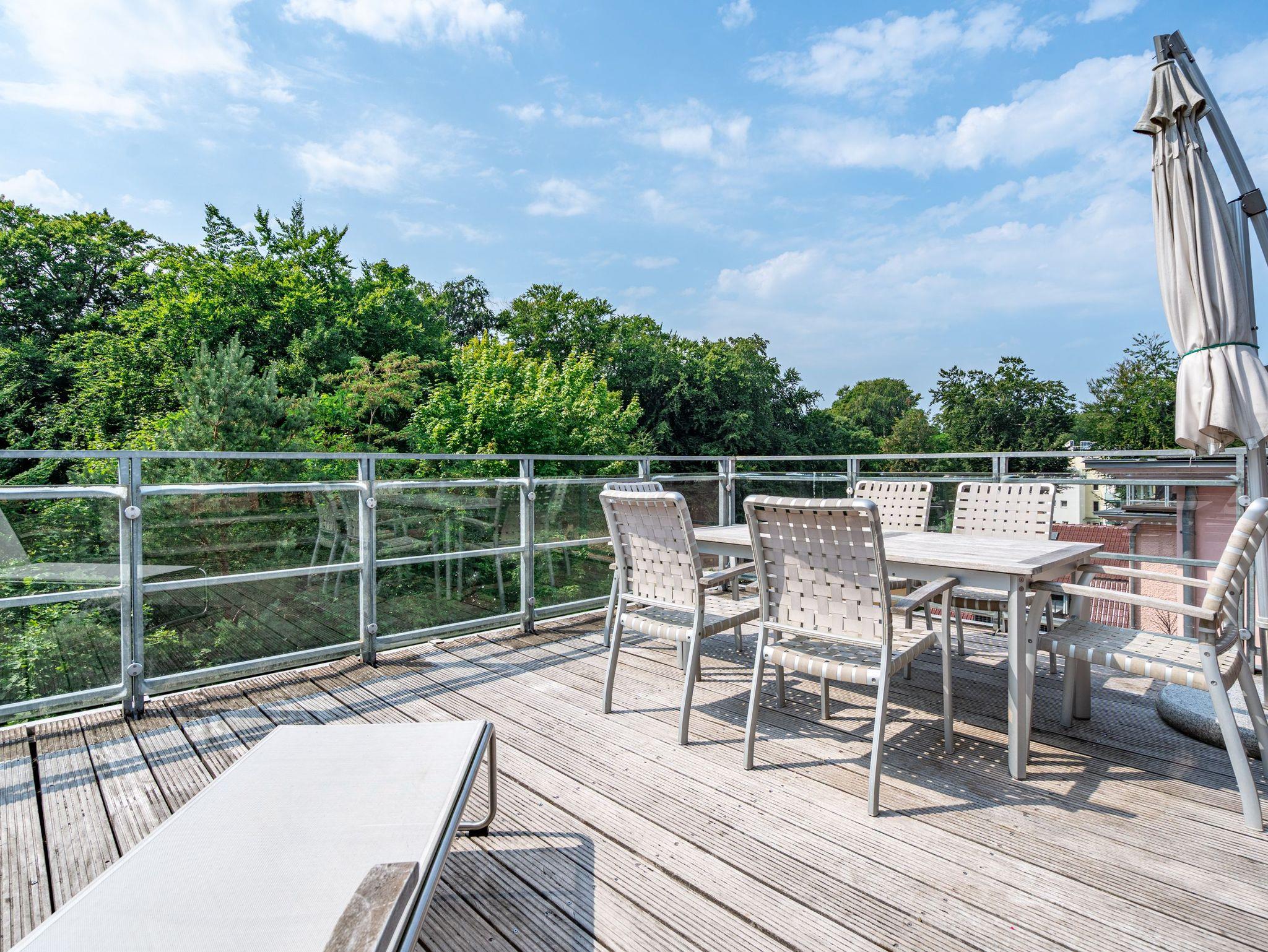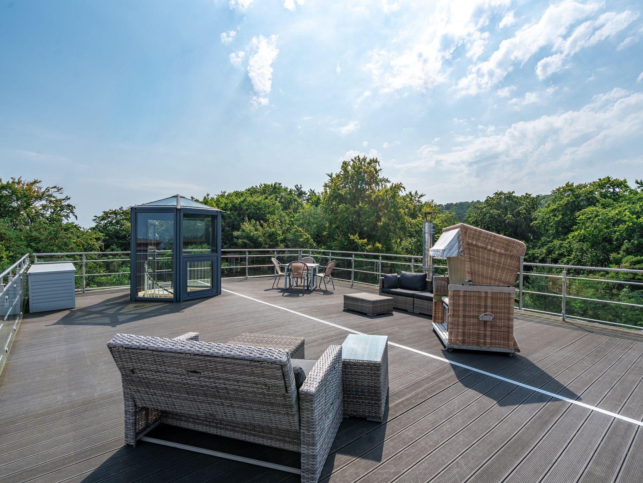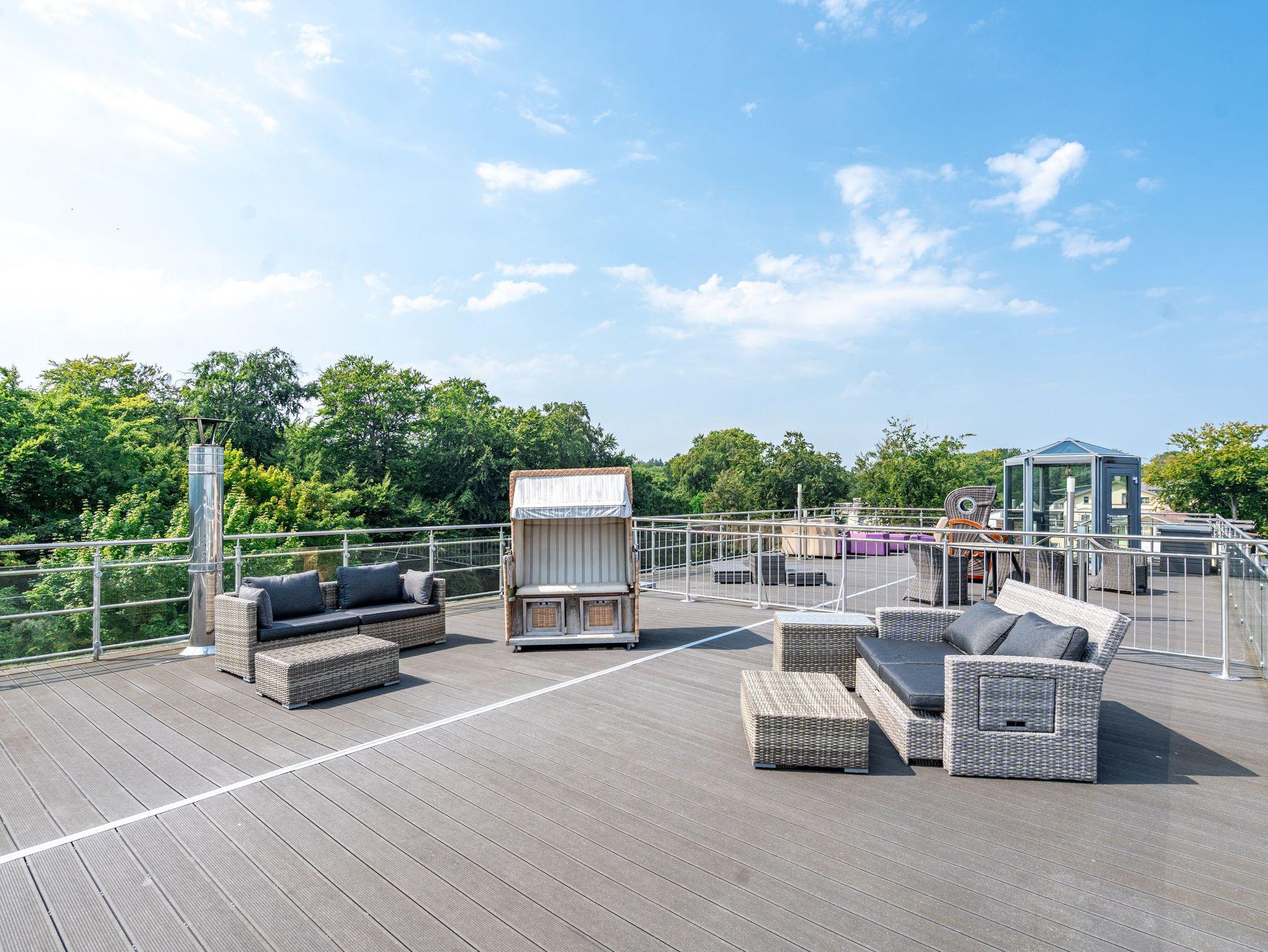 Im Dachgeschoss der Villa Hintze erwarten Sie großzügige 125 qm Luxus! Die neu gestaltete Ferienwohnung 13 (für maximal 4 Personen) offeriert Ihnen ein Wohnambiente der besonderen Art und jede Menge Ausblick auf die Ostsee! Helle, großzügige Räume, moderne Kunst und Möbel von bekannten Designern erfüllen auch anspruchsvolle Urlaubswünsche. Der Wohnbereich mit Sitzgruppe vor dem Kamin und Flat-TV wird ergänzt durch den exklusiven Küchenbereich mit schönem Essplatz. Von hier hat man Zugang zum sonnigen Südbalkon der mit Gartenmöbeln und Sonnenliege von Garpa ausgestattet ist. An den Masterbedroom mit Doppelbett und großem Einbauschrank ist ein wunderschönes Bad mit Badewanne, großer Echtglasdusche und Doppelwaschtisch angegliedert. Und das Beste - schon morgens beim Aufwachen blicken Sie von Ihrem Bett aus über die Dächer der ersten Reihe auf das Meer! Ein zweites, kleineres Schlafzimmer bietet ebenfalls ein Doppelbett (1,60m) und auch ein zweites Bad mit Dusche steht zur Verfügung. Ein ganz besonderes Highlight ist die riesige 100 qm Dachterrasse (über die wohnungseigene Wendeltreppe zu erreichen), die einen traumhaften Blick auf das Meer und Heringsdorf bietet. Hier schaffen die Sitzgruppe, der Strandkorb oder eine bequeme Liegewiese genug Auswahlmöglichkeiten zum Relaxen. In einem separaten Abstellraum auf dem Hausflur können Waschmaschine und Trockener genutzt werden. Für Ihren Komfort sind die Betten bei der Anreise bezogen und Handtücher liegen bereit. Ein Pkw-Stellplatz steht auf dem abgeschlossenen Grundstück zur Verfügung. Das WLAN in der Wohnung ist kostenlos nutzbar.