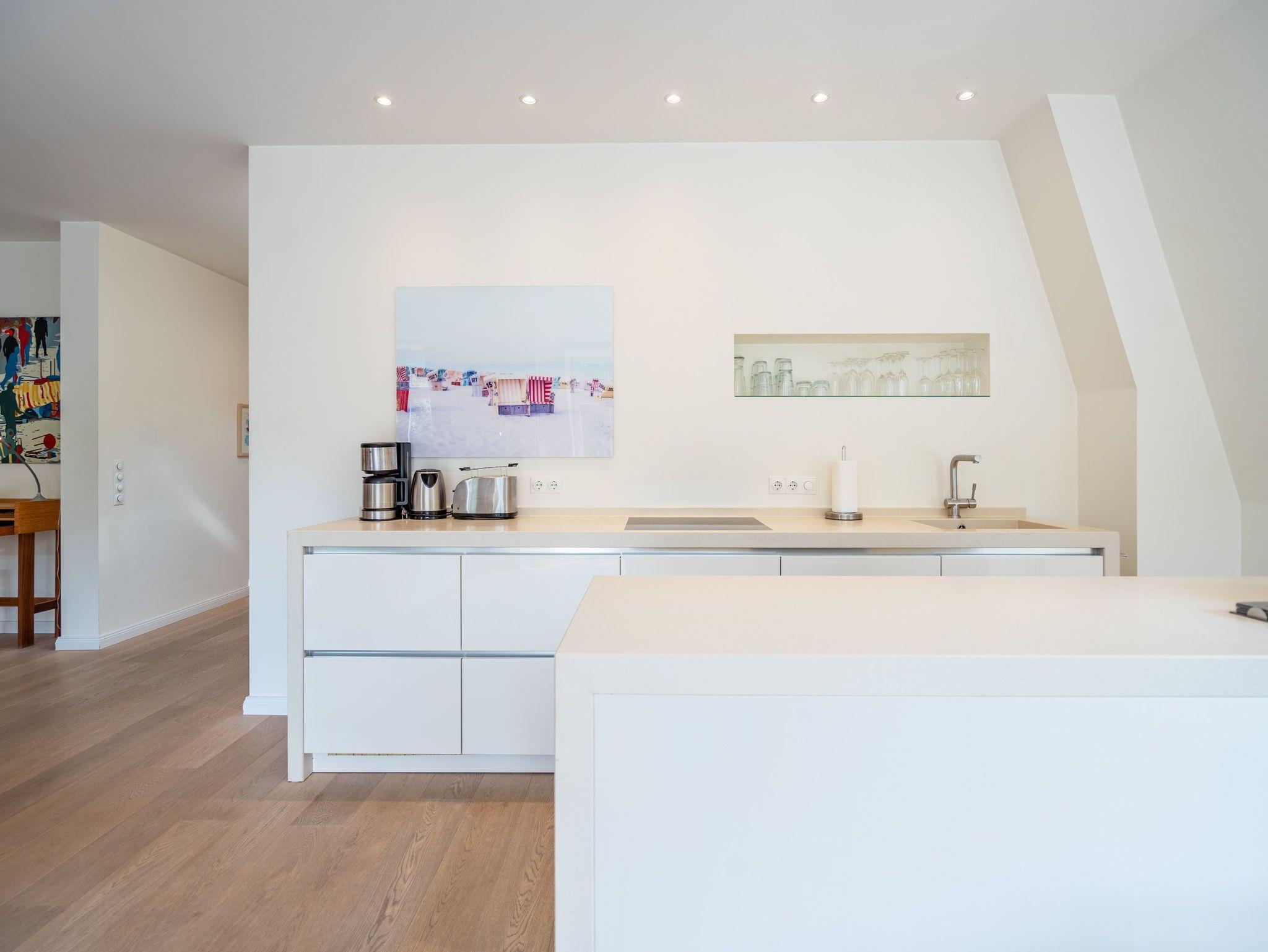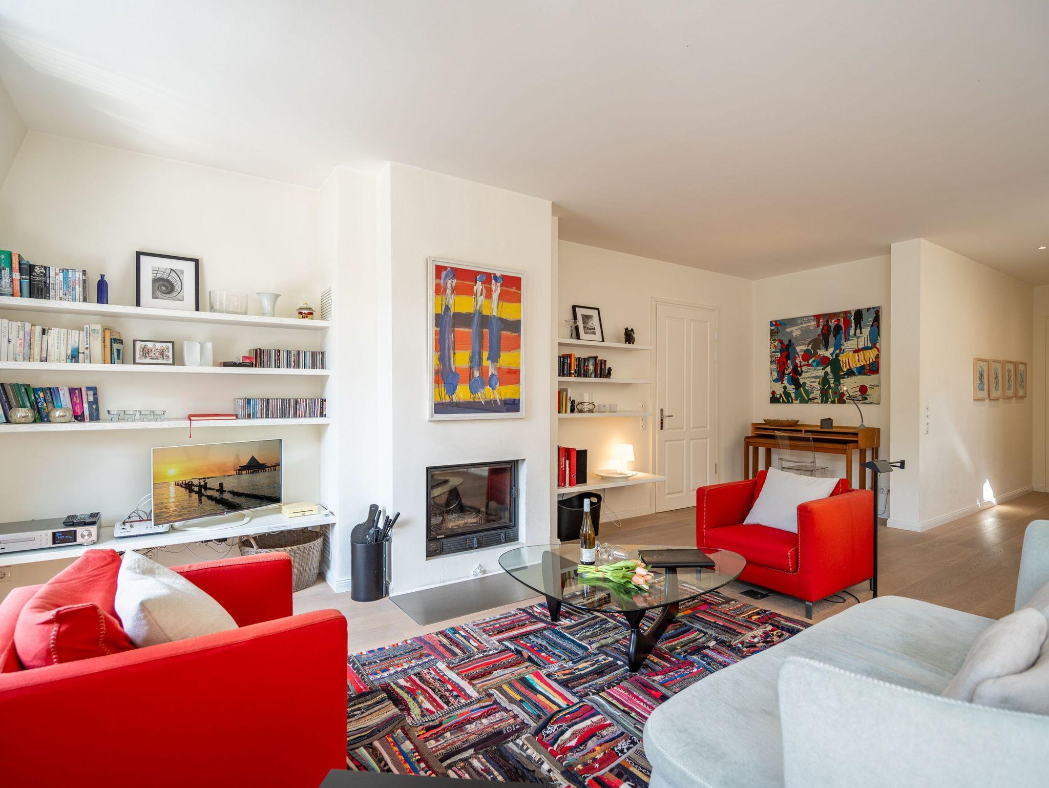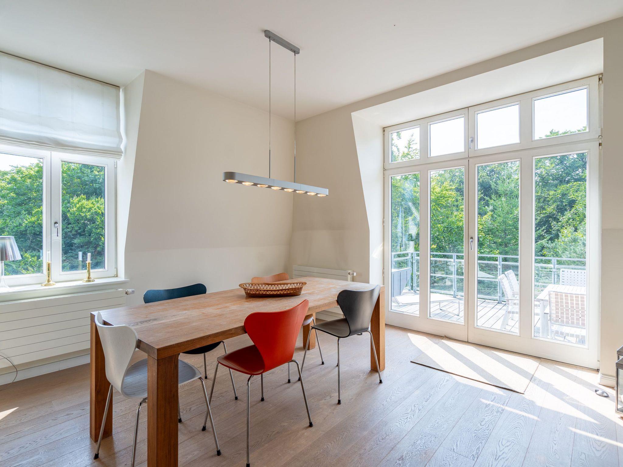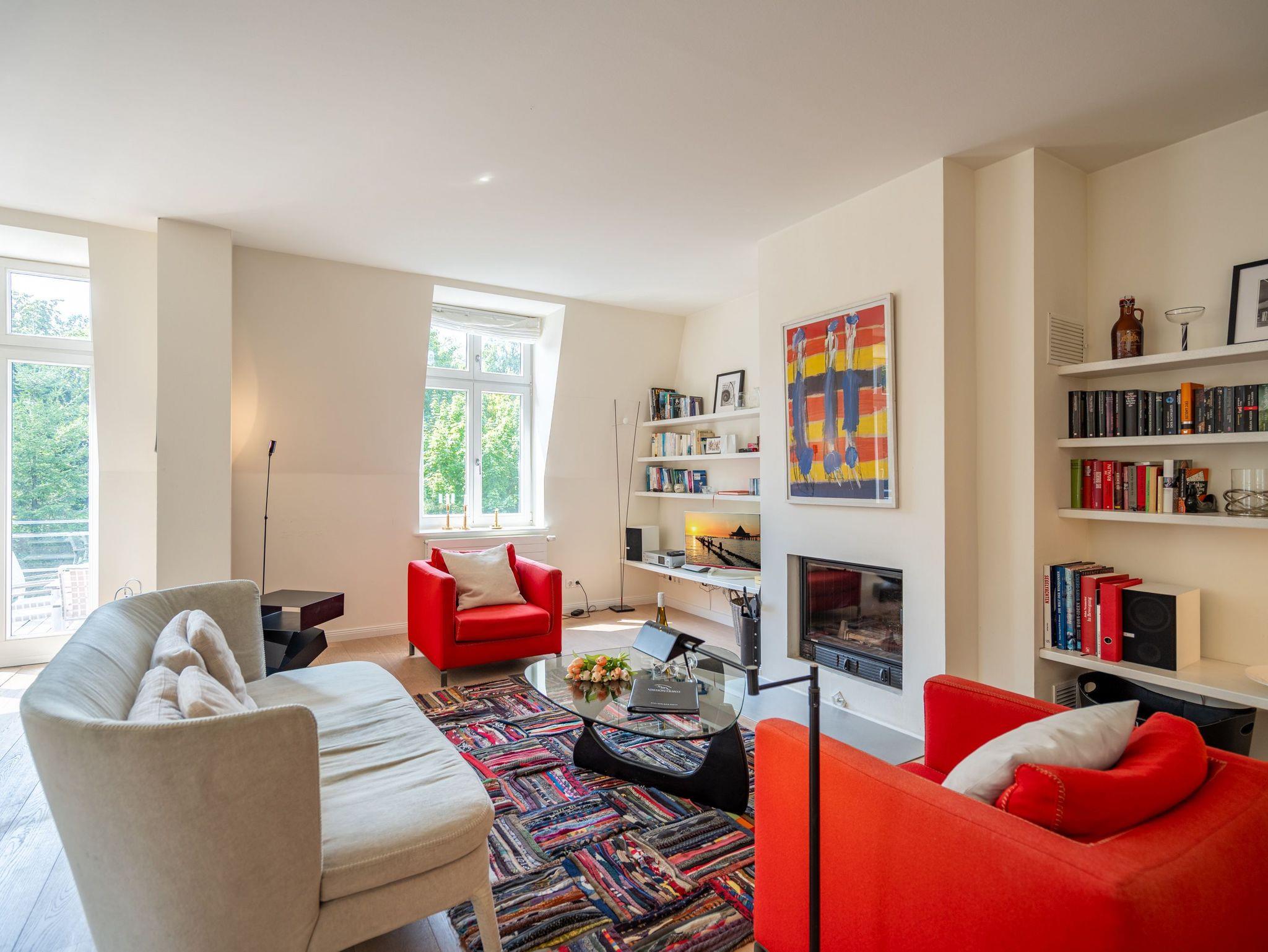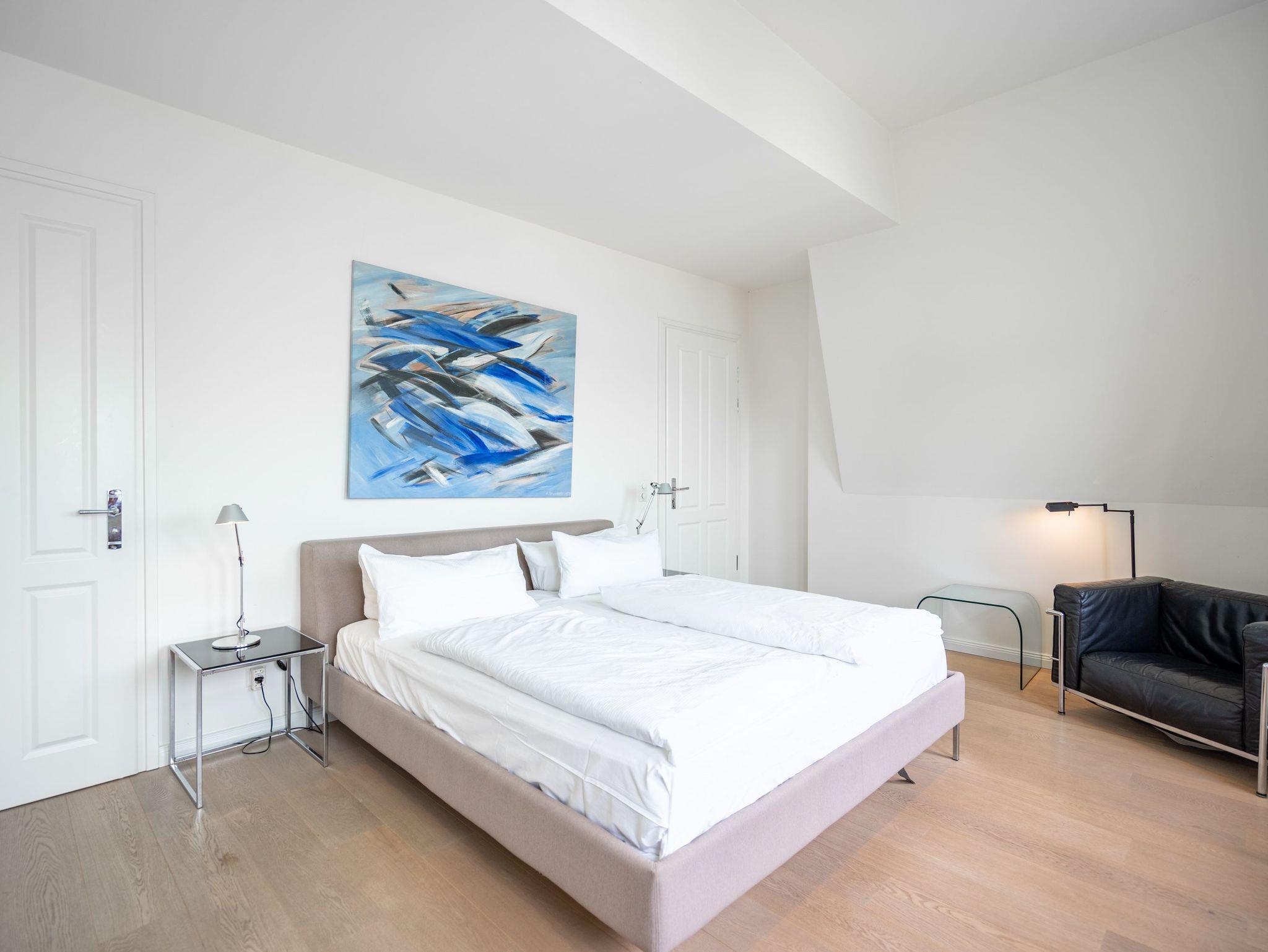 Im Dachgeschoss der Villa Hintze erwarten Sie großzügige 125 qm Luxus! Die neu gestaltete Ferienwohnung 13 (für maximal 4 Personen) offeriert Ihnen ein Wohnambiente der besonderen Art und jede Menge Ausblick auf die Ostsee! Helle, großzügige Räume, moderne Kunst und Möbel von bekannten Designern erfüllen auch anspruchsvolle Urlaubswünsche. Der Wohnbereich mit Sitzgruppe vor dem Kamin und Flat-TV wird ergänzt durch den exklusiven Küchenbereich mit schönem Essplatz. Von hier hat man Zugang zum sonnigen Südbalkon der mit Gartenmöbeln und Sonnenliege von Garpa ausgestattet ist. An den Masterbedroom mit Doppelbett und großem Einbauschrank ist ein wunderschönes Bad mit Badewanne, großer Echtglasdusche und Doppelwaschtisch angegliedert. Und das Beste - schon morgens beim Aufwachen blicken Sie von Ihrem Bett aus über die Dächer der ersten Reihe auf das Meer! Ein zweites, kleineres Schlafzimmer bietet ebenfalls ein Doppelbett (1,60m) und auch ein zweites Bad mit Dusche steht zur Verfügung. Ein ganz besonderes Highlight ist die riesige 100 qm Dachterrasse (über die wohnungseigene Wendeltreppe zu erreichen), die einen traumhaften Blick auf das Meer und Heringsdorf bietet. Hier schaffen die Sitzgruppe, der Strandkorb oder eine bequeme Liegewiese genug Auswahlmöglichkeiten zum Relaxen. In einem separaten Abstellraum auf dem Hausflur können Waschmaschine und Trockener genutzt werden. Für Ihren Komfort sind die Betten bei der Anreise bezogen und Handtücher liegen bereit. Ein Pkw-Stellplatz steht auf dem abgeschlossenen Grundstück zur Verfügung. Das WLAN in der Wohnung ist kostenlos nutzbar.
