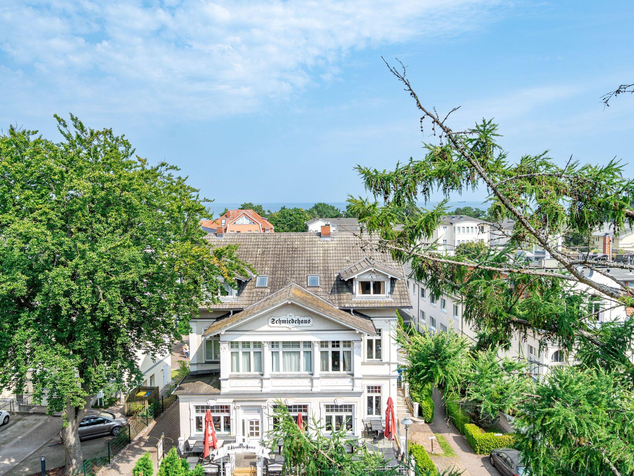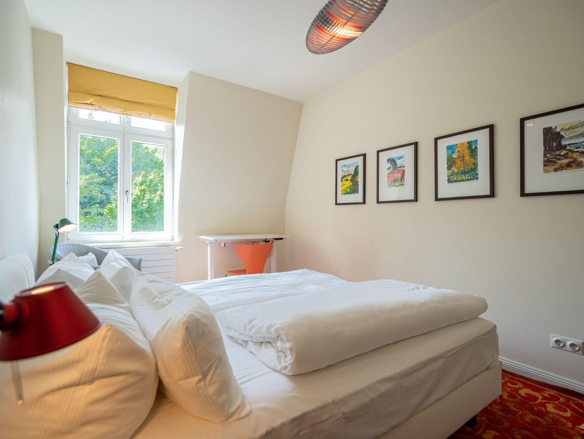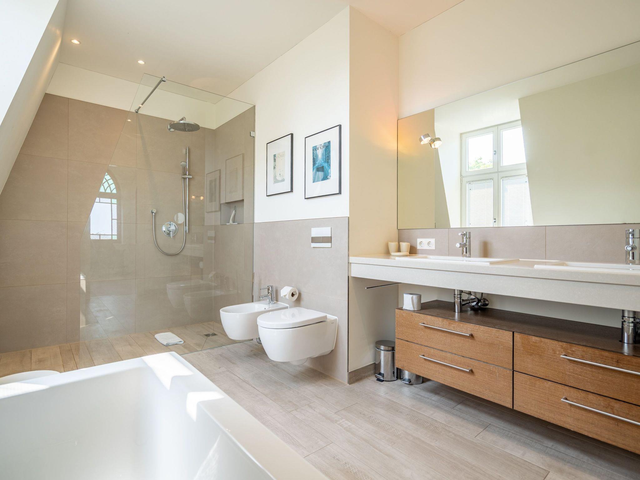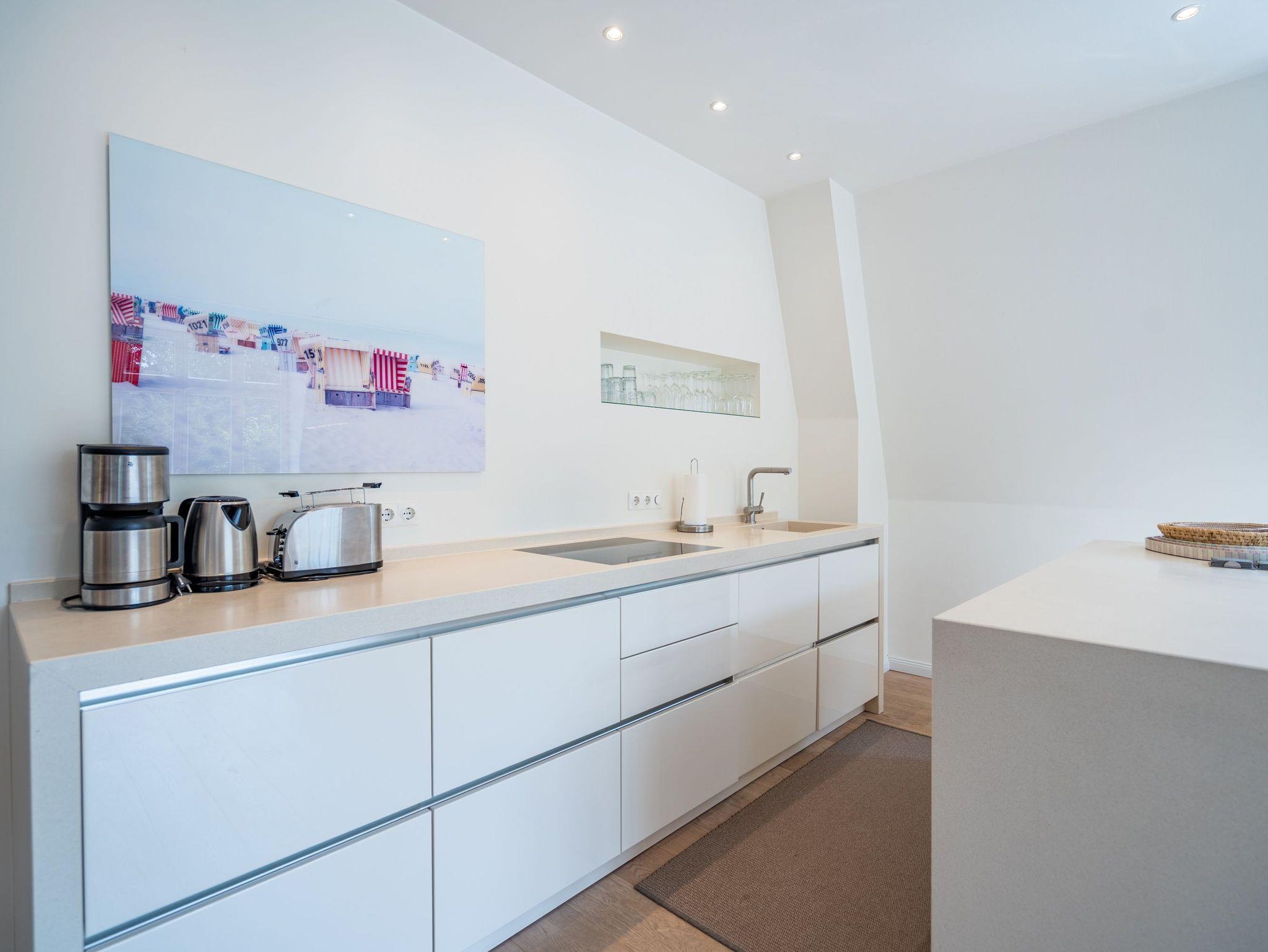 Im Dachgeschoss der Villa Hintze erwarten Sie großzügige 125 qm Luxus! Die neu gestaltete Ferienwohnung 13 (für maximal 4 Personen) offeriert Ihnen ein Wohnambiente der besonderen Art und jede Menge Ausblick auf die Ostsee! Helle, großzügige Räume, moderne Kunst und Möbel von bekannten Designern erfüllen auch anspruchsvolle Urlaubswünsche. Der Wohnbereich mit Sitzgruppe vor dem Kamin und Flat-TV wird ergänzt durch den exklusiven Küchenbereich mit schönem Essplatz. Von hier hat man Zugang zum sonnigen Südbalkon der mit Gartenmöbeln und Sonnenliege von Garpa ausgestattet ist. An den Masterbedroom mit Doppelbett und großem Einbauschrank ist ein wunderschönes Bad mit Badewanne, großer Echtglasdusche und Doppelwaschtisch angegliedert. Und das Beste - schon morgens beim Aufwachen blicken Sie von Ihrem Bett aus über die Dächer der ersten Reihe auf das Meer! Ein zweites, kleineres Schlafzimmer bietet ebenfalls ein Doppelbett (1,60m) und auch ein zweites Bad mit Dusche steht zur Verfügung. Ein ganz besonderes Highlight ist die riesige 100 qm Dachterrasse (über die wohnungseigene Wendeltreppe zu erreichen), die einen traumhaften Blick auf das Meer und Heringsdorf bietet. Hier schaffen die Sitzgruppe, der Strandkorb oder eine bequeme Liegewiese genug Auswahlmöglichkeiten zum Relaxen. In einem separaten Abstellraum auf dem Hausflur können Waschmaschine und Trockener genutzt werden. Für Ihren Komfort sind die Betten bei der Anreise bezogen und Handtücher liegen bereit. Ein Pkw-Stellplatz steht auf dem abgeschlossenen Grundstück zur Verfügung. Das WLAN in der Wohnung ist kostenlos nutzbar.