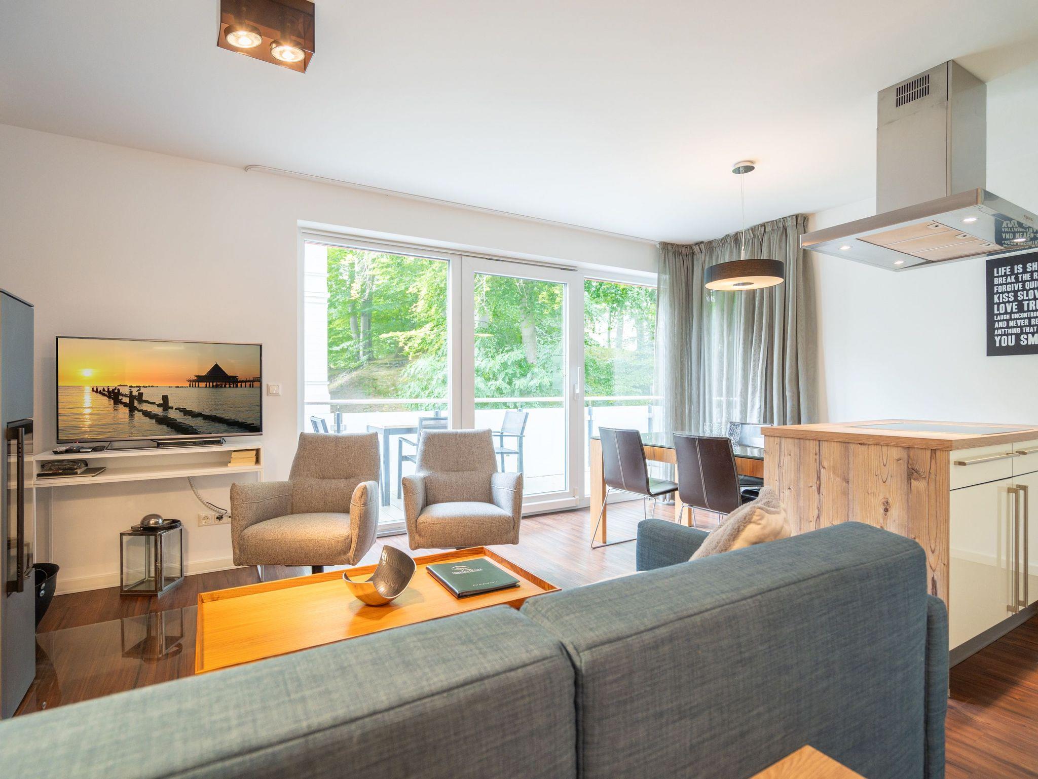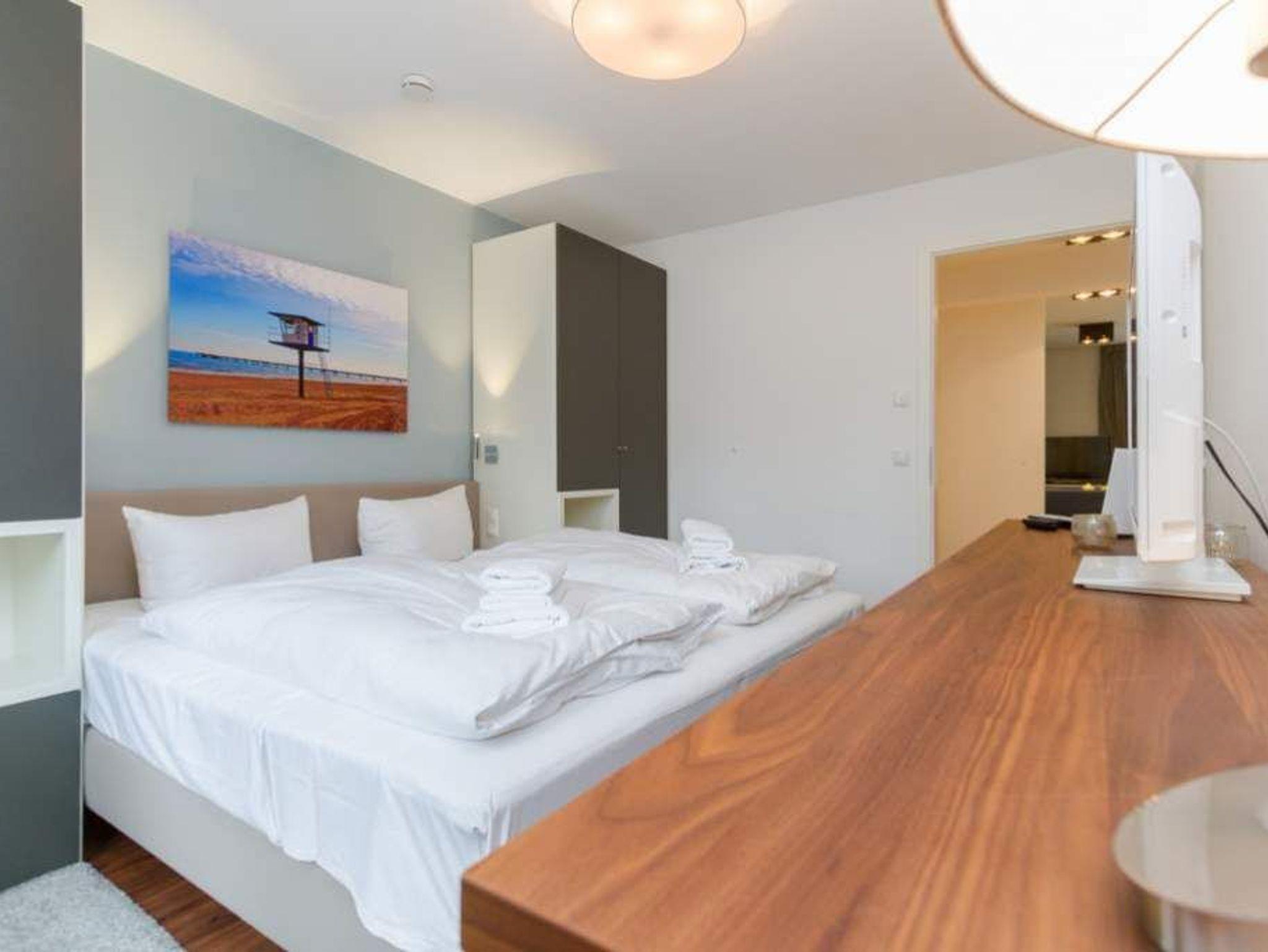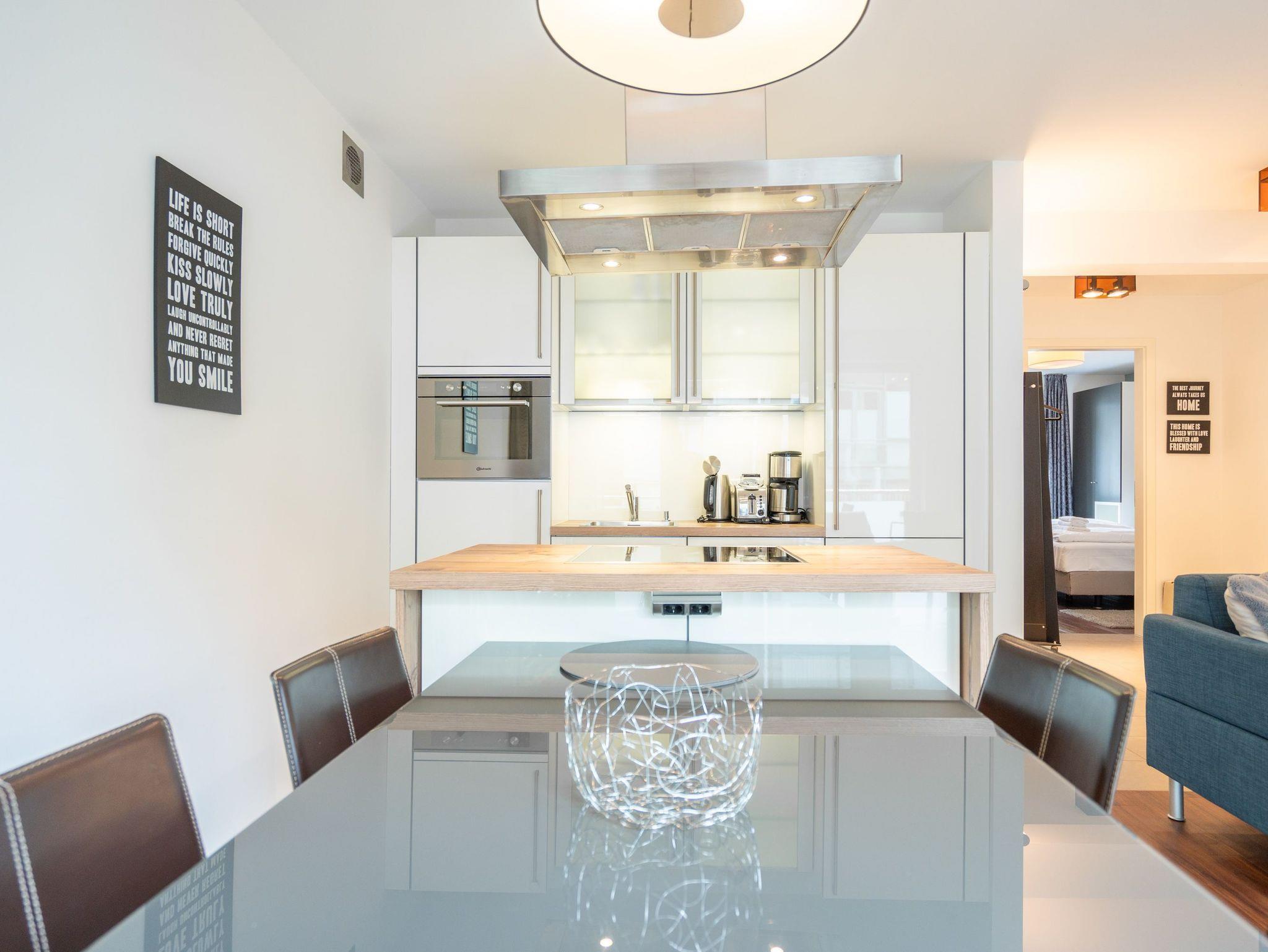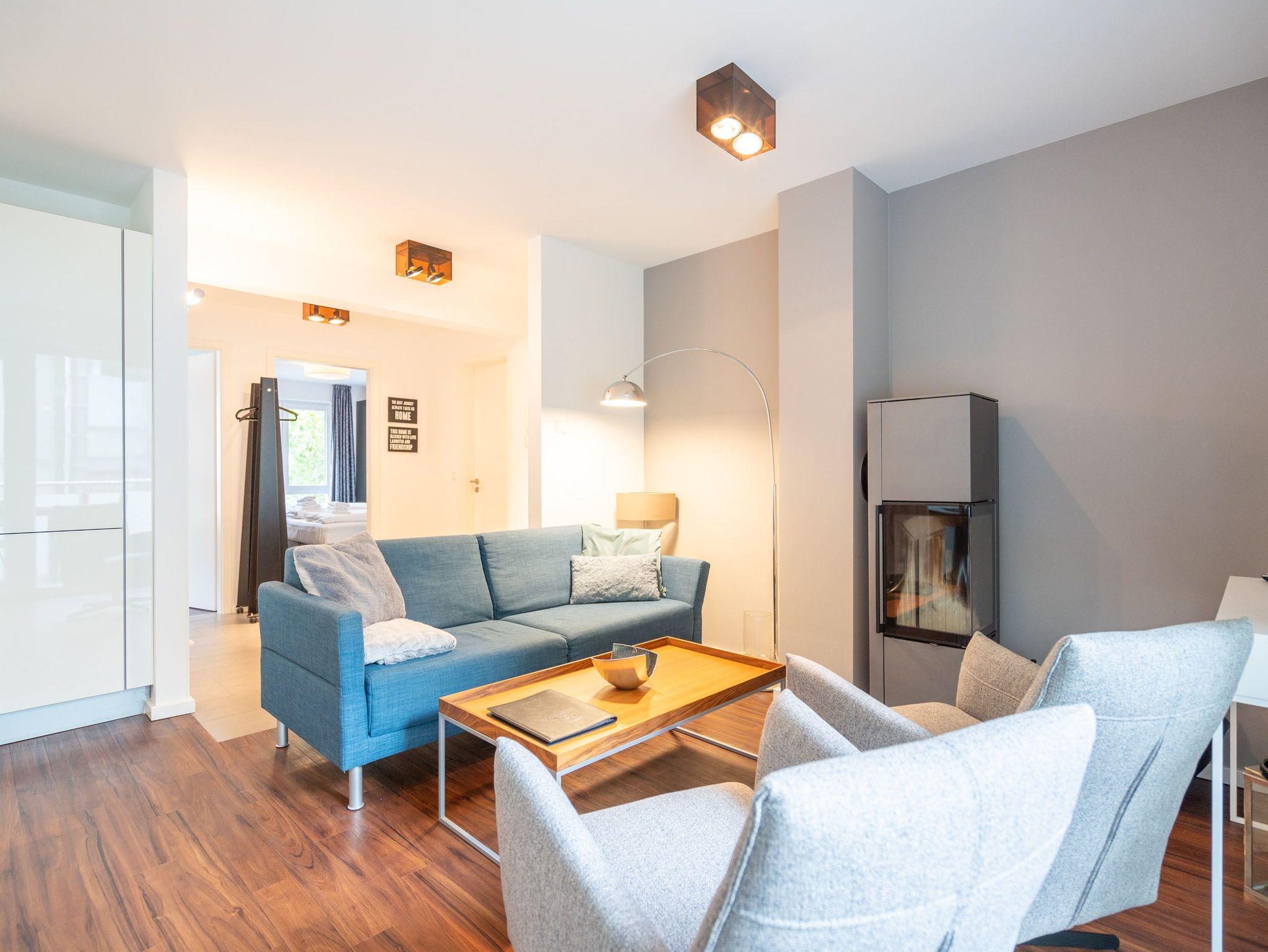 Stil gepaart mit wertigen Materialien und einer hochwertigen Ausstattung - willkommen in der Ferienwohnung 4. Im 1. Obergeschoss des Hauses, erwartet Sie ein modernes 3-Raum-Appartement (65 qm) für bis zu 4 Personen. Von einer Innenarchitektin designt, finden Sie hier einen gemütlichen Wohnbereich mit Sitzgruppe und Flat-TV, an den sich die offene, komplett ausgestattete Küche mit Essplatz anschließt. Zwei Schlafzimmer mit bequemen Boxspringbetten (1,80m x 2,00m) und jeweils eigenem Flat-TV sorgen für erholsamen Schlaf. Ein modernes Duschbad und ein Gäste-WC ergänzen die Wohnung. Ein besonderes Highlight ist der Kamin im Wohnbereich, der nicht nur im Winter für eine heimelige Atmosphäre sorgt. Auch der schöne, großzügige Süd-Balkon mit Gartenmöbel lädt zum Relaxen ein. In der Tiefgarage (Stellplatz 4) steht ein Pkw-Stellplatz zur Verfügung. Das WLAN-Netz im Haus kann kostenfrei genutzt werden.