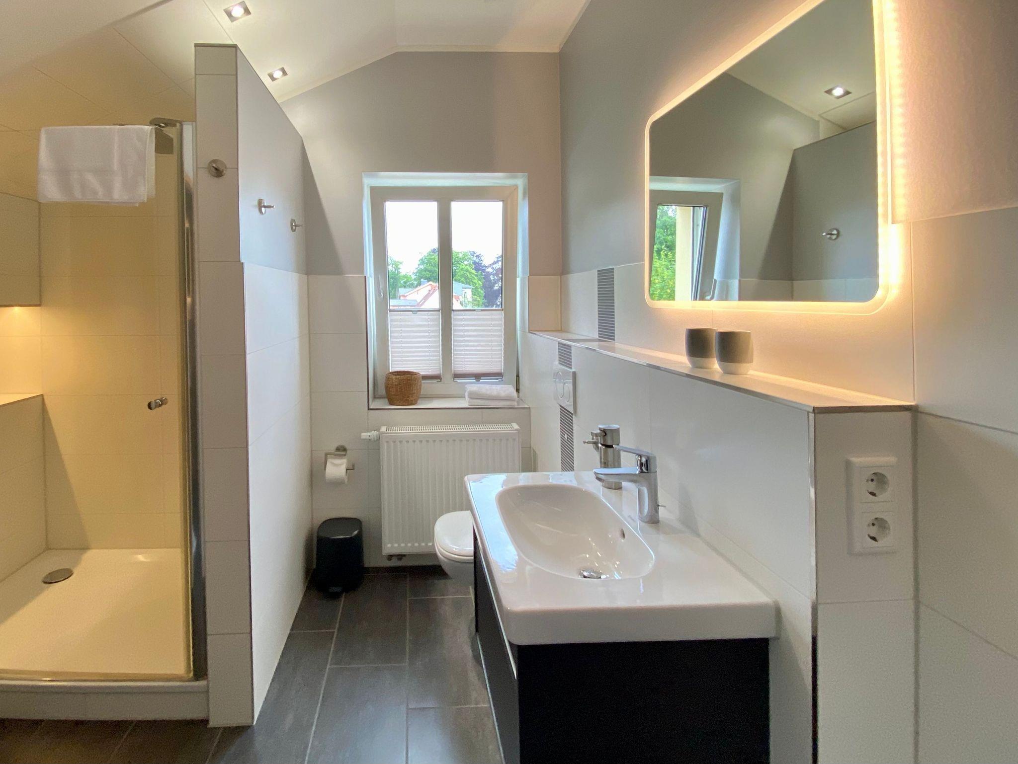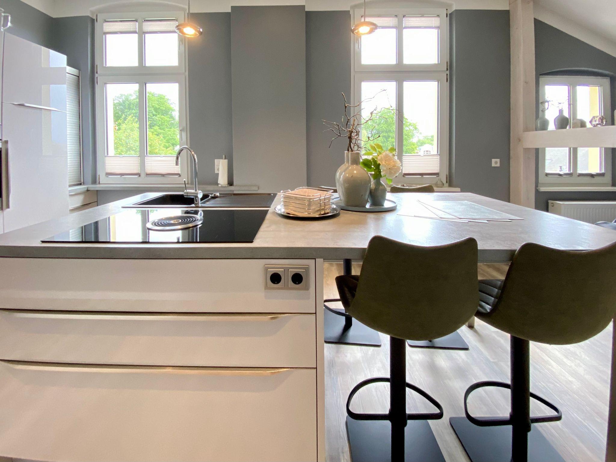 Auch der Anbau der Villa Anna wurde liebevoll saniert. Hier entstanden zwei schöne Ferienwohnungen, im Erdgeschoss die Kleine Anna, die ebenso modern und stilsicher eingerichtet wurde. Auf dem Grundstück gibt es pro Ferienwohnung einen Stellplatz und eine Aufladestation für E-Autos inklusive.