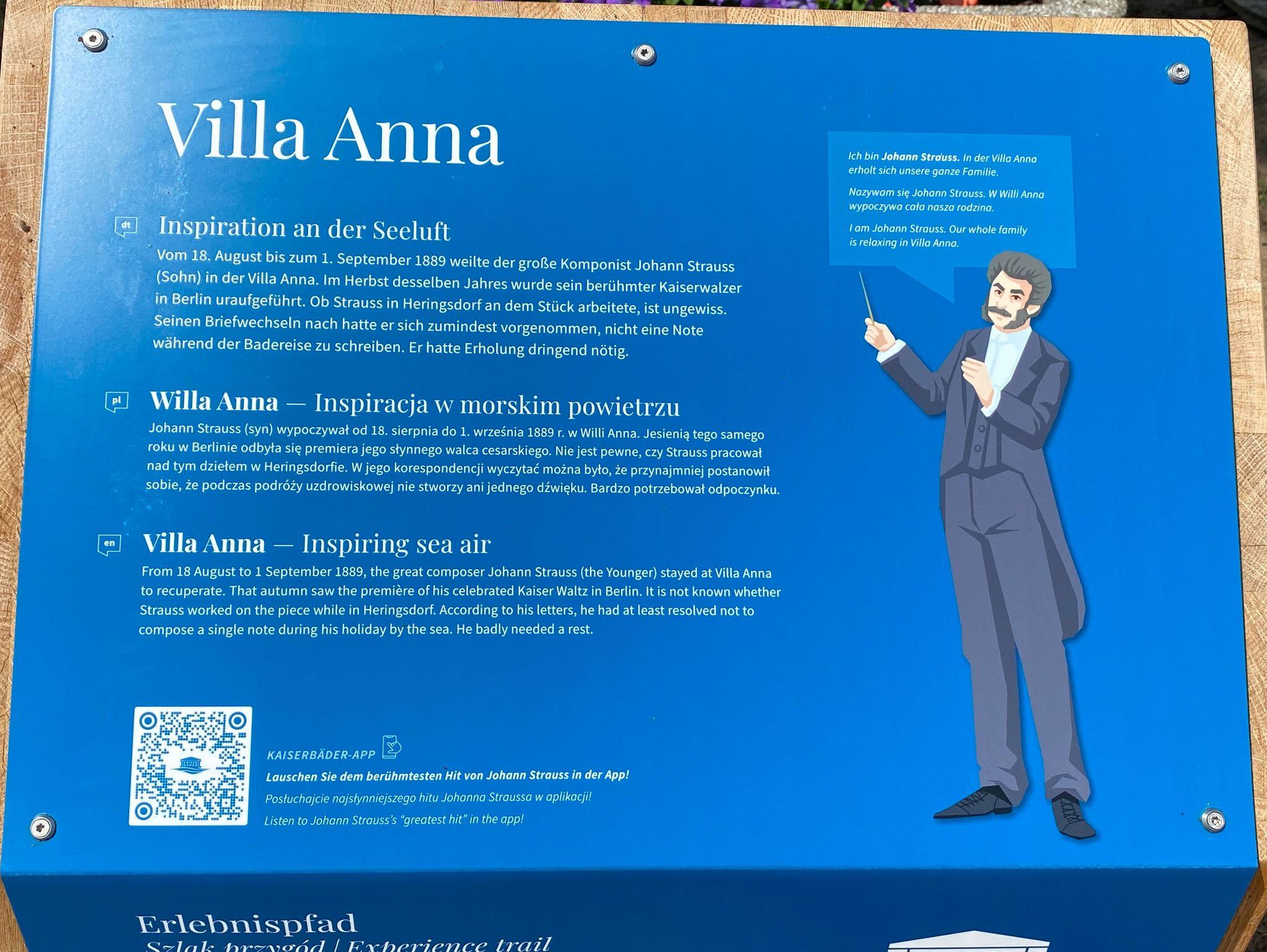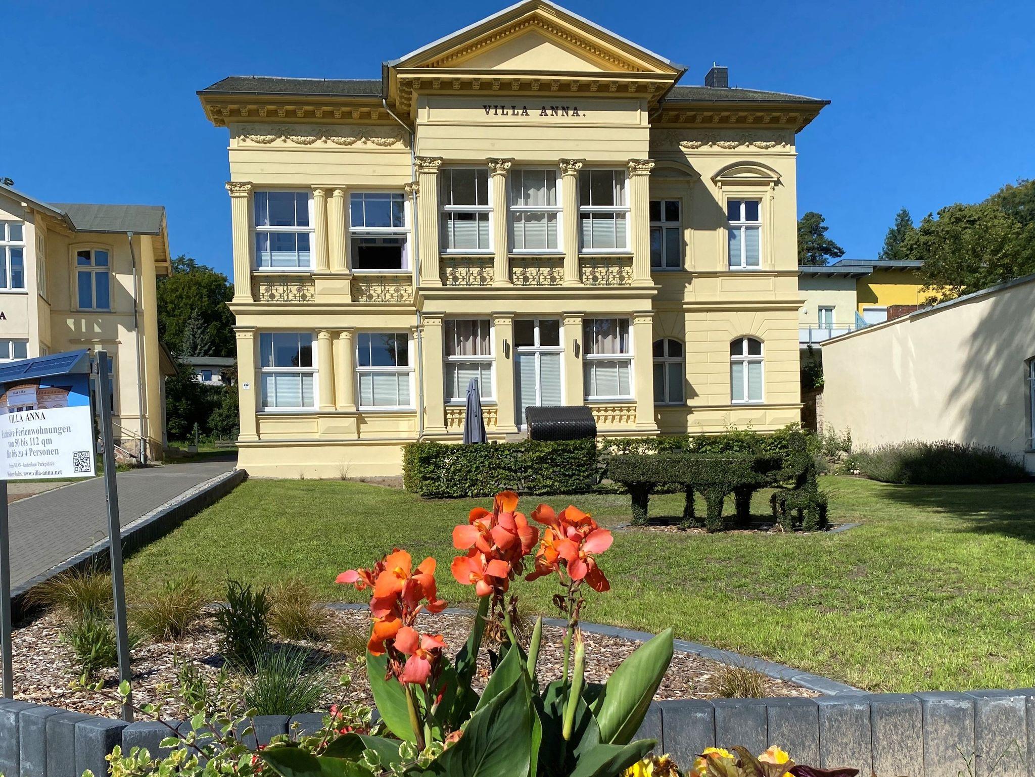 Die Villa Anna ist eine der repräsentativsten Bäderstilvillen im Seebad Heringsdorf in der Seestr. 18 mit 7 exklusiven Ferienwohnungen. Im Jahre 2018 wurde die Sanierung des Haupthauses abgeschlossen und es entstanden hochmoderne Ferienwohnungen der Superlative, stilvoll eingerichtet in den ehrwürdigen Mauern der Villa.