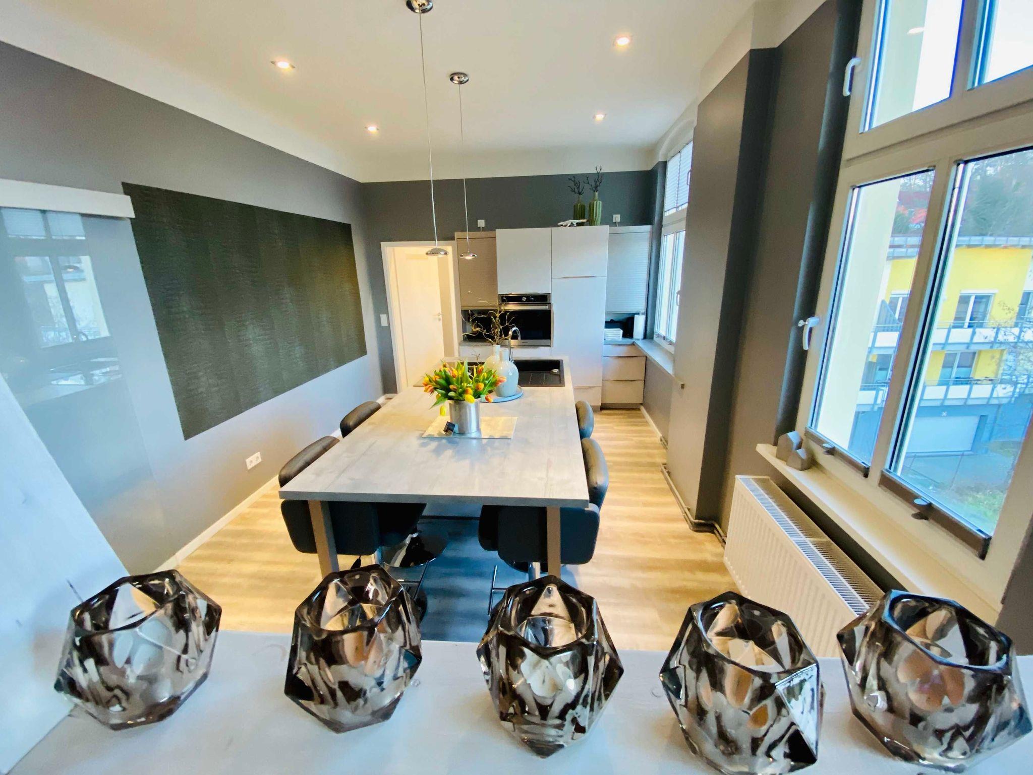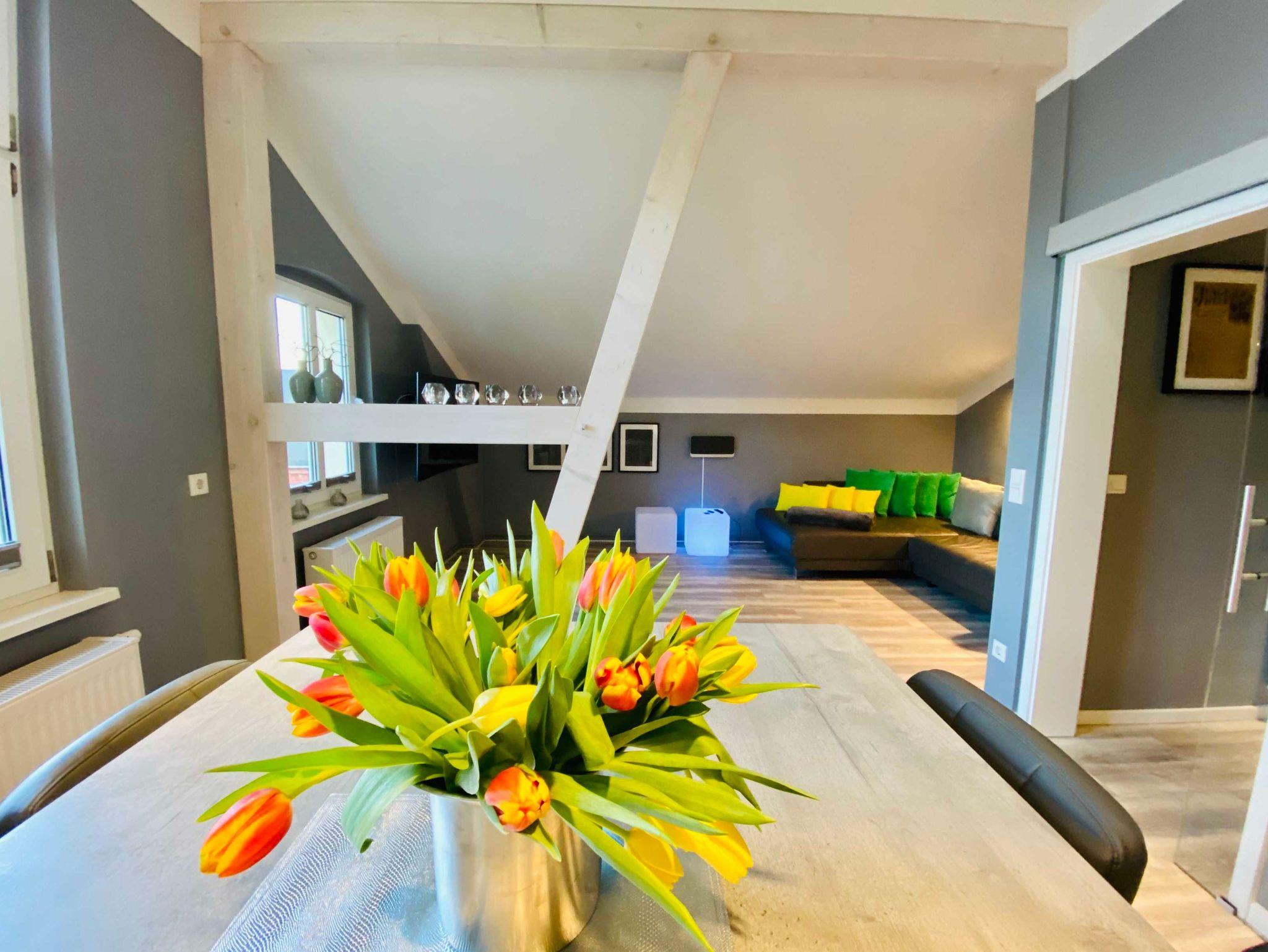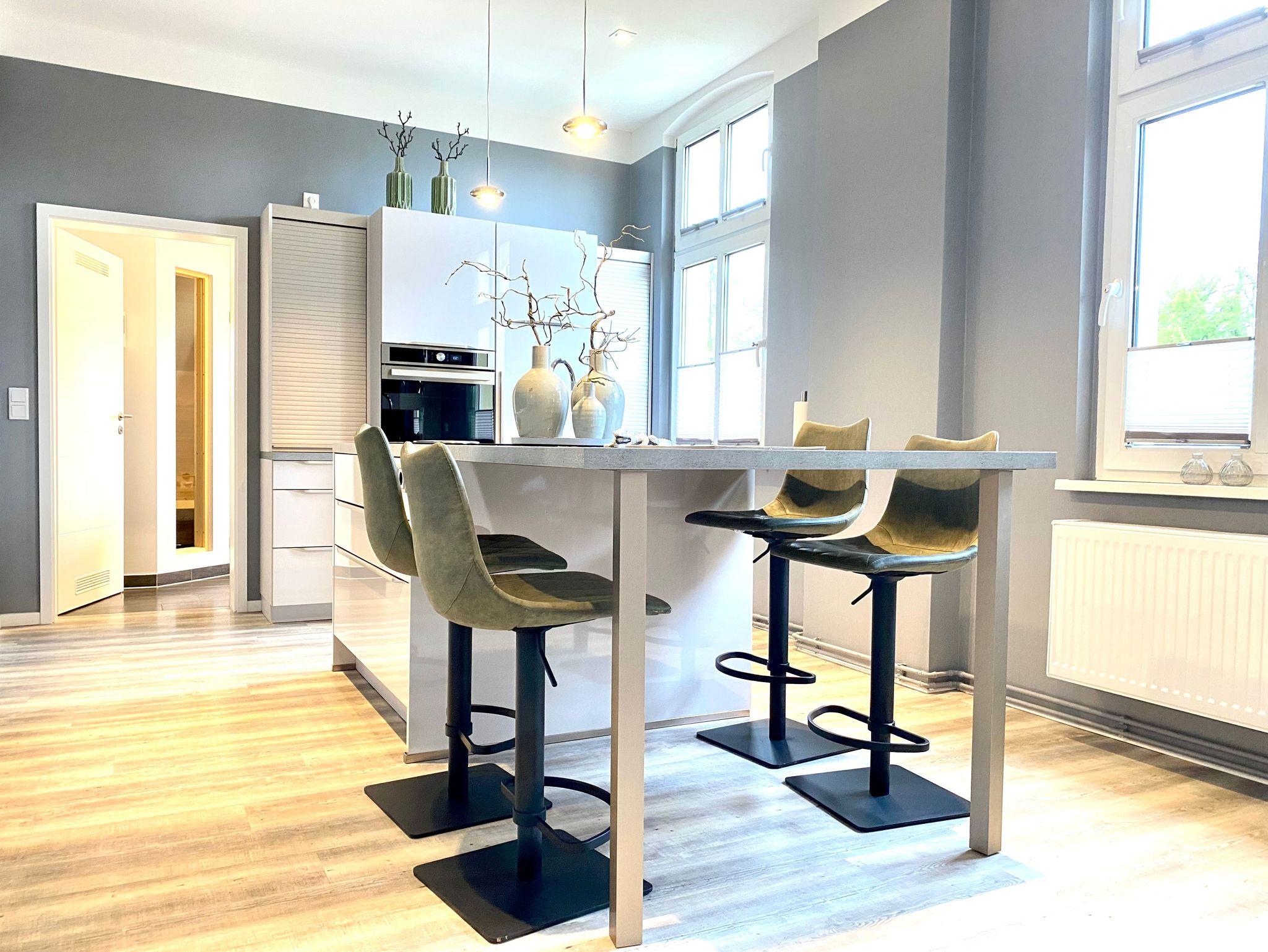 Die Ferienwohnung 3/4 Takt empfängt Sie im Dachgeschoss (2. Etage) der Villa Anna und ist über das historische Treppenhaus zu erreichen. Schon im Flur spüren Sie das moderne Flair und öffnen eine schicke Glatür, um in das Herzstück der Wohnung zu gelangen, der Kombination aus Küche und Wohnzimmer. Hier können Sie gemeinsam kochen, essen, lesen, fernsehen oder einfach nur entspannen. Freiliegende Dachbalken schaffen eine tolle Atmosphäre und dienen zugleich als Raumteiler. Zwei gleichwertige Schlafzimmer mit großem Boxspringbett, Kleiderschrank und TV vervollständigen das Angebot. Im Bad erwartet Sie nicht nur eine schicke Dusche, sondern eine eigene kleine Sauna. Die gesamte Wohnung ist mit noblem Designbelag ausgelegt.