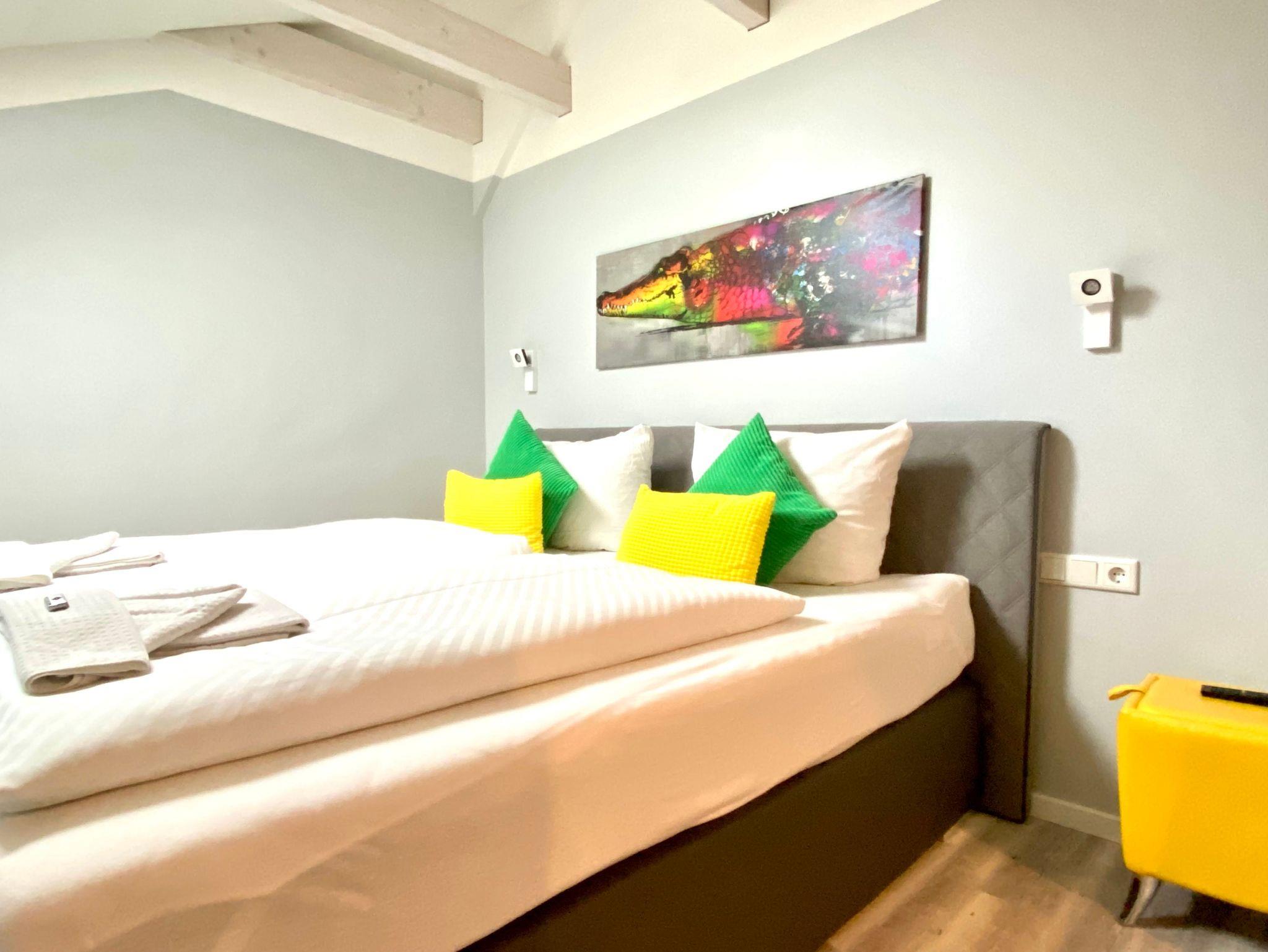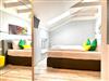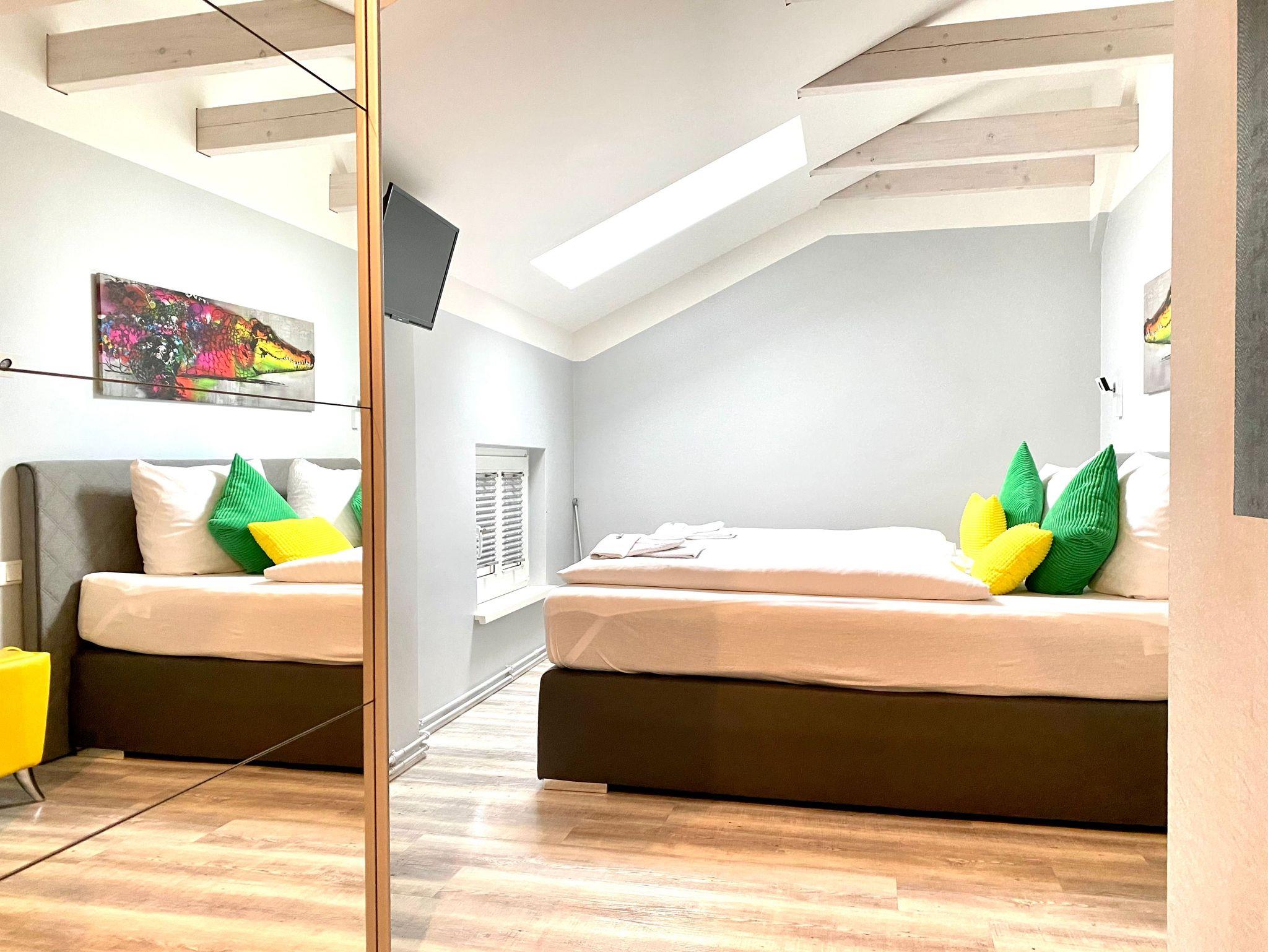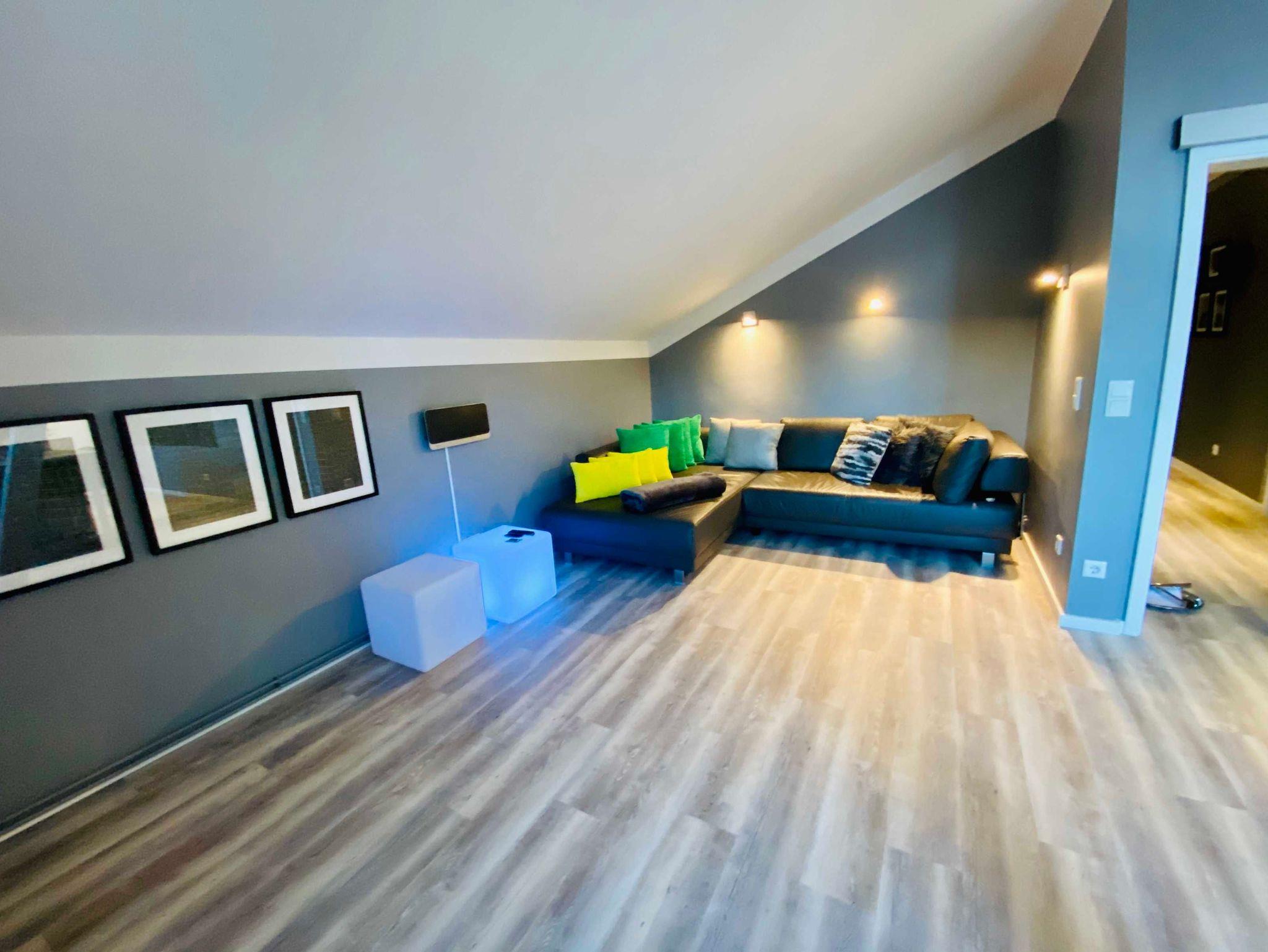 Die Ferienwohnung 3/4 Takt empfängt Sie im Dachgeschoss (2. Etage) der Villa Anna und ist über das historische Treppenhaus zu erreichen. Schon im Flur spüren Sie das moderne Flair und öffnen eine schicke Glatür, um in das Herzstück der Wohnung zu gelangen, der Kombination aus Küche und Wohnzimmer. Hier können Sie gemeinsam kochen, essen, lesen, fernsehen oder einfach nur entspannen. Freiliegende Dachbalken schaffen eine tolle Atmosphäre und dienen zugleich als Raumteiler. Zwei gleichwertige Schlafzimmer mit großem Boxspringbett, Kleiderschrank und TV vervollständigen das Angebot. Im Bad erwartet Sie nicht nur eine schicke Dusche, sondern eine eigene kleine Sauna. Die gesamte Wohnung ist mit noblem Designbelag ausgelegt.