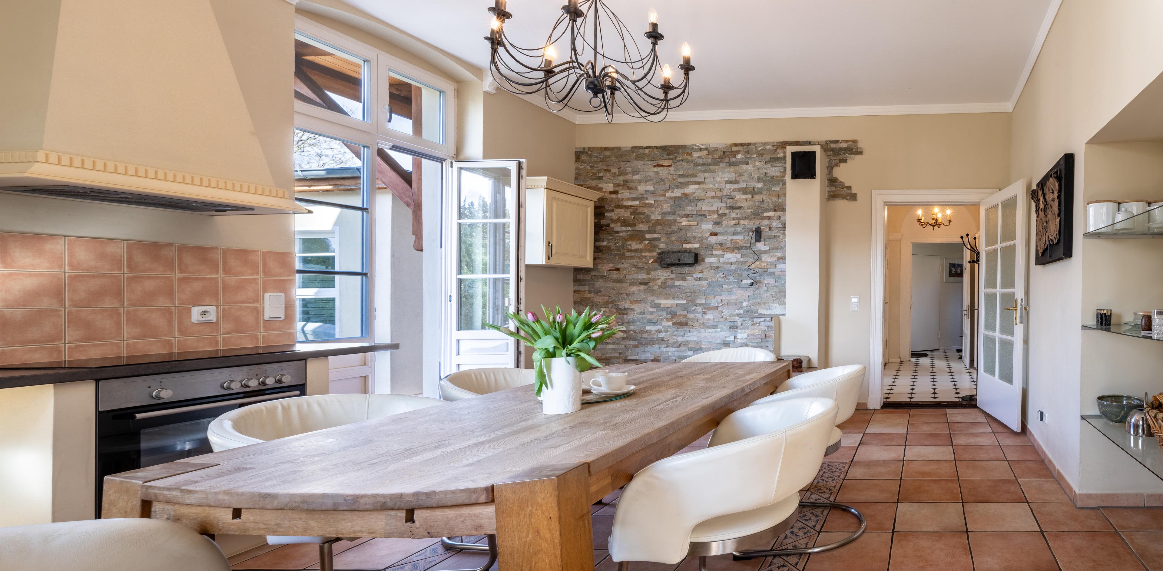 Sie wohnen im Erdgeschoß in einer liebevoll sanierten Villa im Bäderarchitekturstil, in ruhiger und zentraler Lage. Zum Strand sind es nur ca. 100 Meter. Das Appartement ist 129 qm groß und ist mit rustikalen skandinavischen Möbeln ausgestattet. Es bietet insgesamt sechs Schlafplätze. Im Schlafzimmer befinden sich ein großes Doppelbett (200x200) und ein Etagenbett (2x 90x200). In der abgeschlossenen Veranda können Sie auf einem Doppelbett (140x200) ruhen. Ein großer Einbaukamin lädt zum Ausklang eines romantischen Abends ein. Die Böden sind mit rustikalen mediterranen Fliesen ausgelegt. Im modernen Bad sind eine Erlebnisdusche und ein Whirlpool zum Entspannen vorhanden. Weiterhin gibt es kleines separates Gäste-WC. Zwei lichtdurchflutete Veranden laden zum Verweilen ein. Auf zwei großzügigen Terrassen können Sie das weitläufige Grundstück genießen. Am großen Aussengrill kann Leckeres zubereitet werden. Einen separaten Stellplatz finden Sie hinter der Villa. Fahrräder können untergestellt Ausstattung der exklusiven Ferienwohnung Salon lässt keine Wünsche offen. Dazu zählen WLAN, Plasma-TV, DVD-Surroundanlage, DVD-Filme, Bücher, Einbauküche mit Geschirrspüler, Kühl-/Gefrierkombination, Backofen mit Ceranfeld, Mikrowelle, Kaffeemaschine, Senseo-Kaffeepadmaschine, Wassserkocher, Toaster, Föhn, Babybett, Babyhochstuhl, klappbare Wickelauflage und vieles mehr.