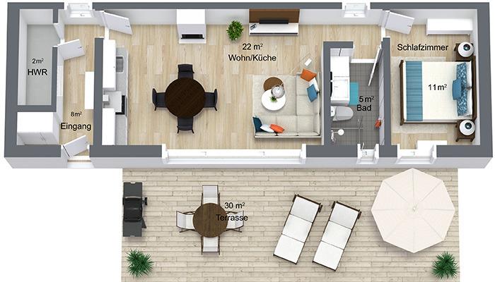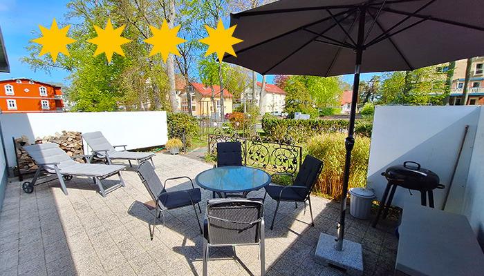 - mit Zugang auf die eigene Terrasse mit Garten, Grill, Sonnenliegen und Sitzgarnitur