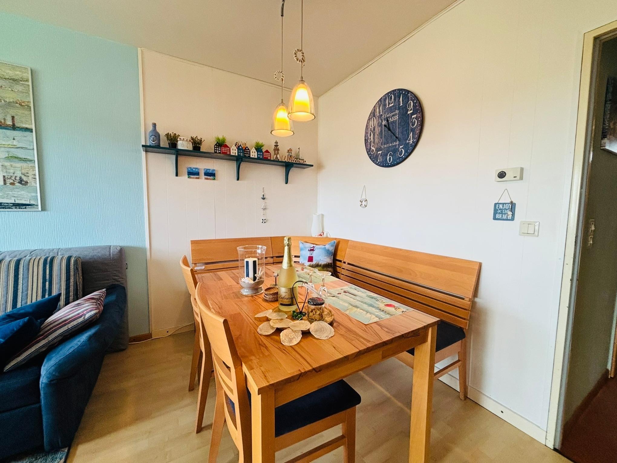 Im Wohnbereich finden Sie eine schöne Eßecke und ein gemütliches 2-er Sofa sowie ein Sessel für gemütliche Abende.