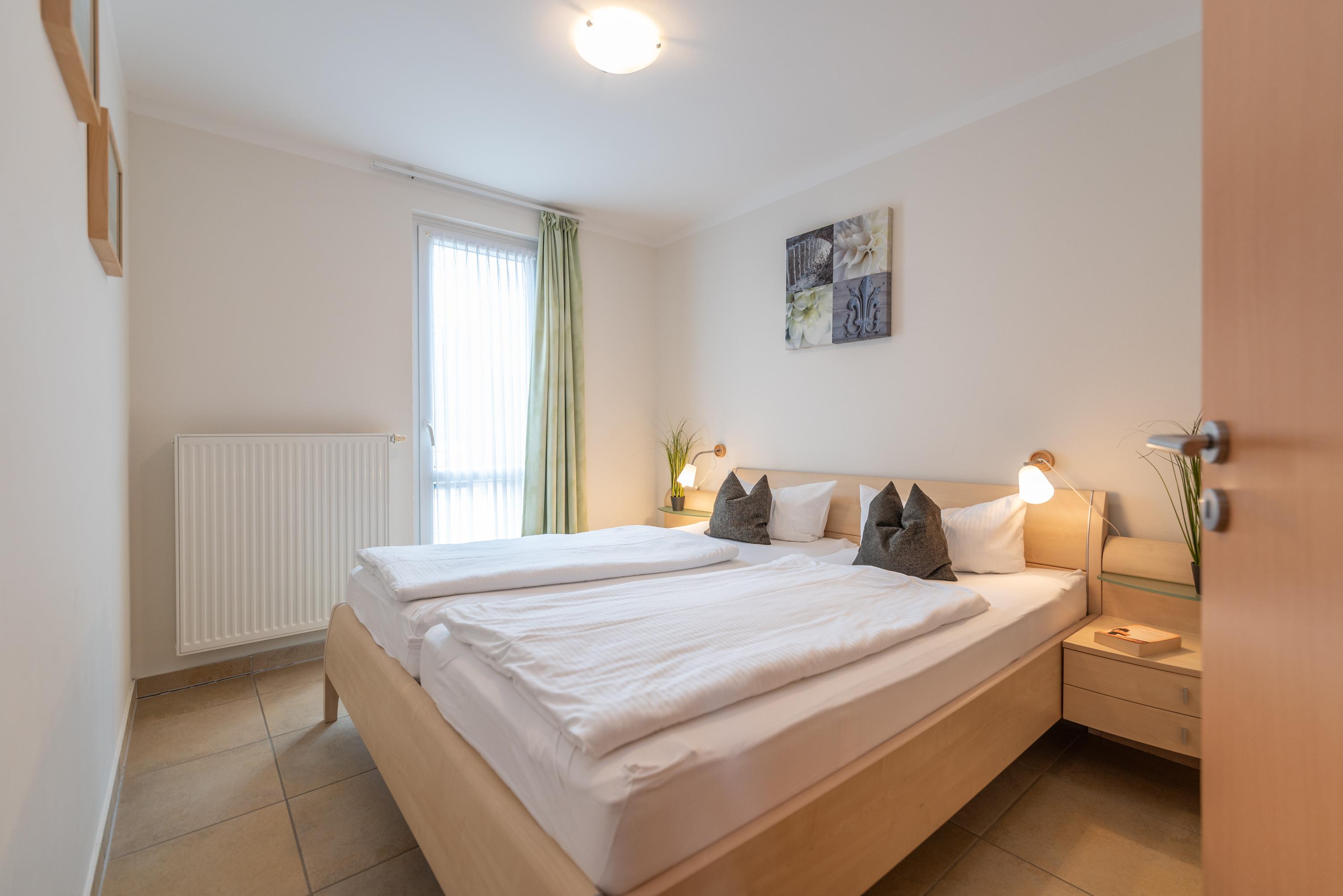 Die Unterkunft bietet zwei separate Schlafzimmer: eines mit einem komfortablen Doppelbett und ein weiteres mit zwei Einzelbetten. Im stilvoll gestalteten Wohnbereich finden Sie eine gemütliche Ledercouch, einen Esstisch für vier Personen, einen modernen Flachbildfernseher (Full-HD/LED) sowie ein CD-Radio. Die offene, komplett ausgestattete Küchenzeile ermöglicht Ihnen, Ihre Lieblingsgerichte bequem selbst zuzubereiten. Für den Zugang zum Internet steht Ihnen ein kostenfreier WLAN-Hotspot zur Verfügung.