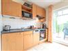 Der großzügige, geflieste Wohnraum ist freundlich gestaltet und verfügt über eine vollständig ausgestattete Küchenzeile, die alle wichtigen Utensilien für die Zubereitung eigener Mahlzeiten bereithält.