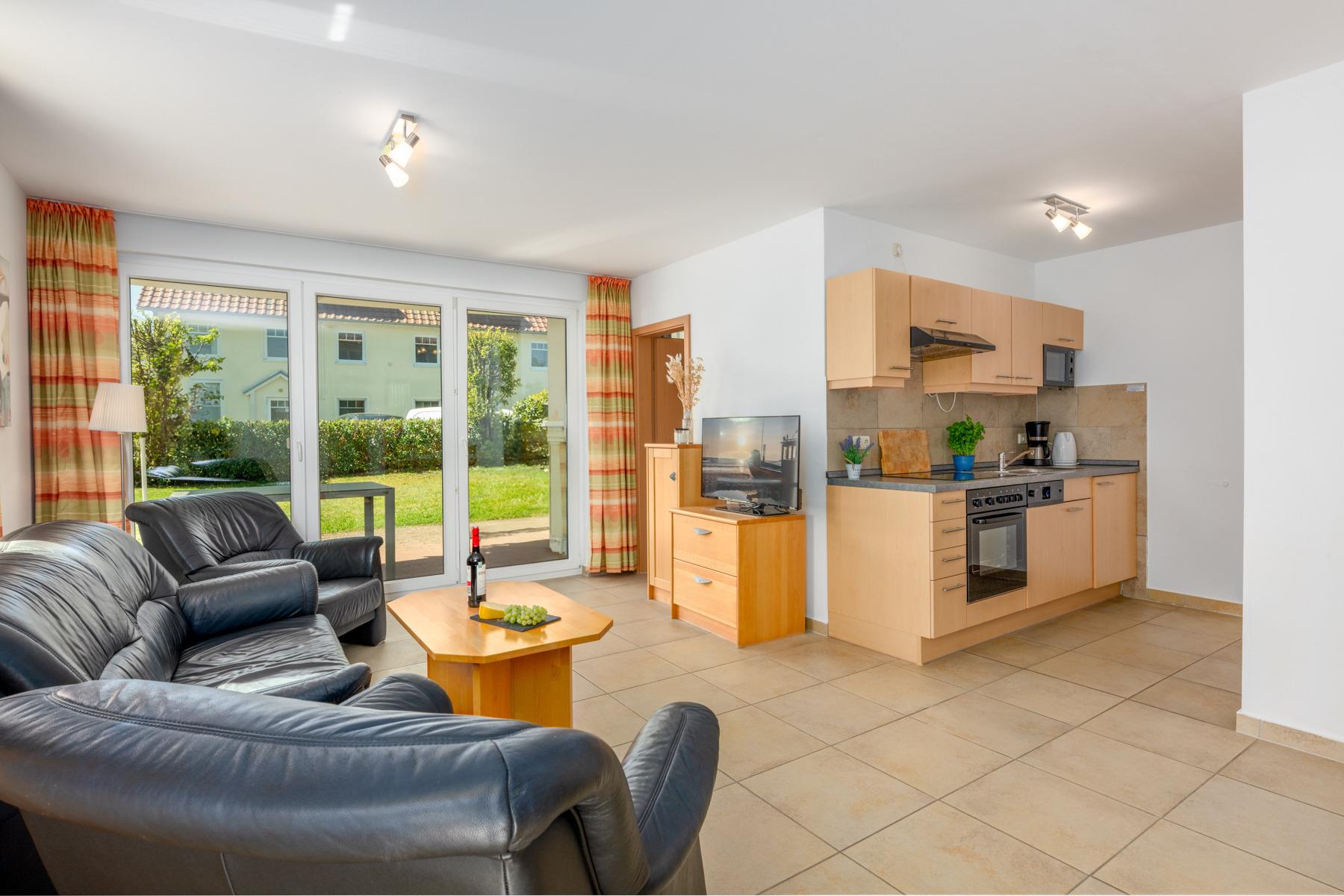 Die Erdgeschosswohnungen haben eine Größe von ca. 65 m² und bieten Platz für insgesamt 4 Personen. Sie sind mit 2 getrennten Schlafzimmern ausgestattet und verfügen über eine Terrasse mit Sitzmöglichkeiten für bis zu 4 Personen. In der Wohnküche befindet sich eine voll ausgestattete Küchenzeile mit Herd, Kühlschrank und Geschirrspüler. Das Badezimmer ist mit einer Dusche und einer Toilette ausgestattet. Die Wohnung ist barrierefrei zugänglich und verfügt über einen eigenen Parkplatz.