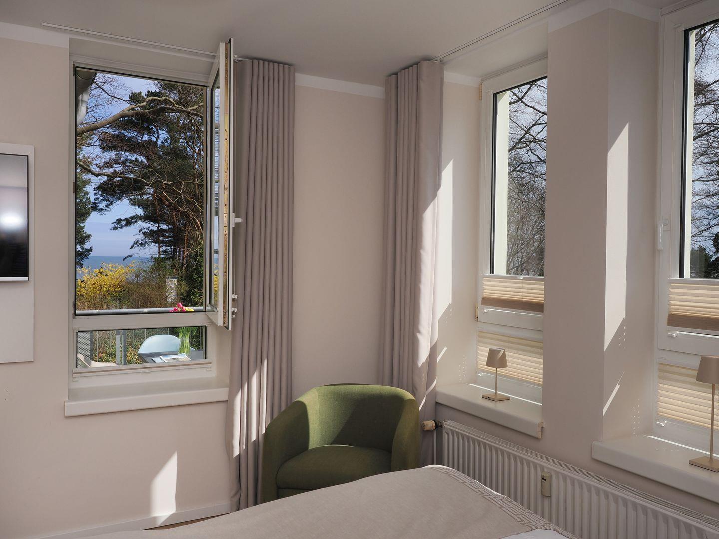 Die voll ausgestattete offene Küche mit Wasserkocher, Kaffeemaschine, Toaster, 4-Felder Ceranherd mit Backofen, Geschirrspüler, Mikrowelle und Kühlschrank mit Gefrierfach bietet alles für einen rundum gelungenen Urlaub. Der schöne Balkon in Nordost-Lage ist hell und verfügt über einen Blick bis zur Ostsee; schon am Morgen könnt ihr hier im Sonnenschein frühstücken. Der Balkon ist ausgestattet mit Gartenmöbeln und Sonnenschirm.