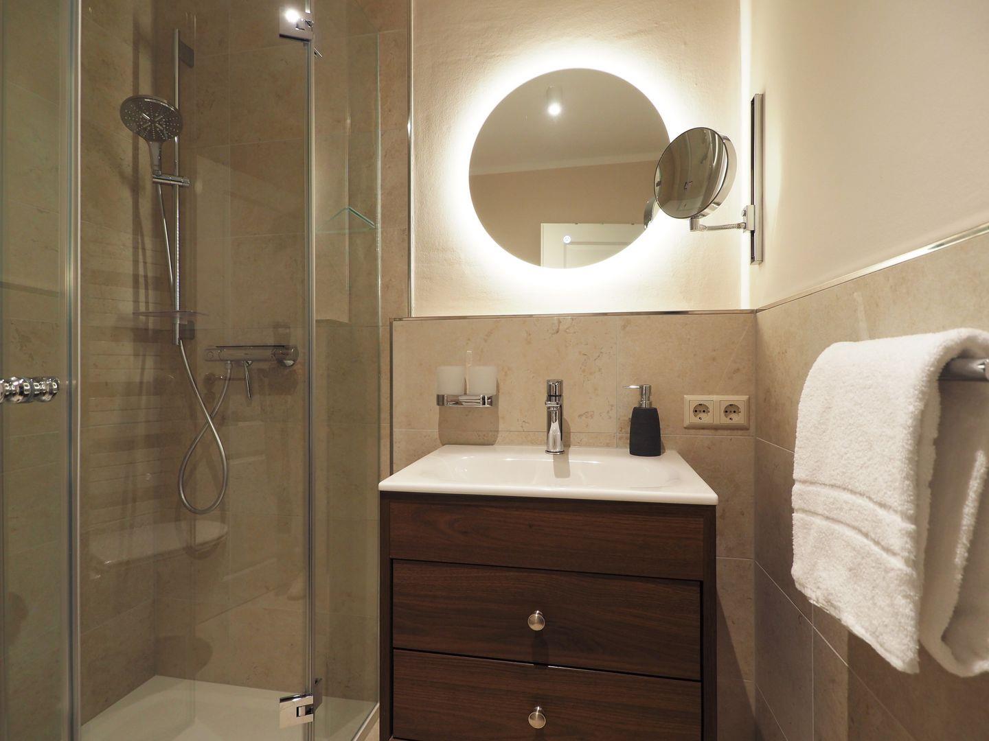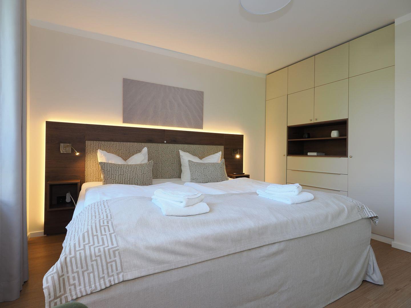 Ausgestattet ist die hervorragend gelegene Ferienwohnung mit kostenfreiem WLAN, einem modernen Duschbad mit bodengleicher Dusche, Kosmetikspiegel, Handtuchheizkörper und Föhn, einem stilvollen Schlafzimmer mit großem und komfortablem Doppelbett (2,00 x 2,10 m) und SMART-TV (43 Zoll), einem Wohnbereich mit Doppelschlafcouch (1,40 x 1,90 m) und einem großem SMART-TV (50 Zoll) sowie einem hellem Balkon mit Blick zum Meer und zur Strandpromenade.