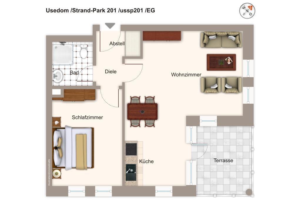 Das 45 qm große 2- Zimmer Apartment mit sonniger Terrasse, direkt an der Strandpromenade von Heringsdorf gelegen, bietet Platz für bis zu 2 Personen.