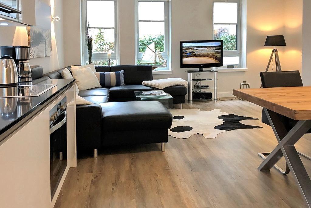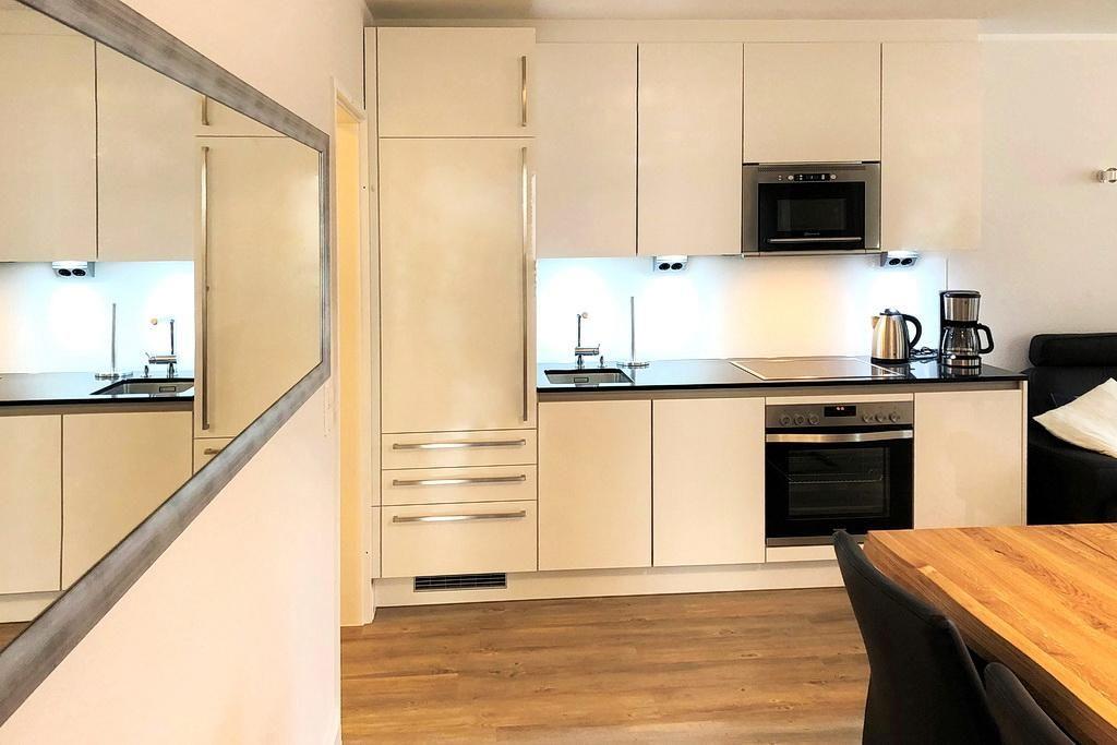 Die harmonisch eingerichtete Ferienwohnung verfügt über kostenfreies WLAN und zeichnet sich aus durch ein liebevolles Farbkonzept, kombiniert mit hochwertigem Mobiliar sowie einer individuellen Dekoration. Der helle Wohnbereich wird ergänzt durch einen behaglichen Essbereich mit einer offenen und voll ausgestatteten Küche mit Wasserkocher, Kaffeemaschine, Toaster, Eierkocher, Herd mit Ceranfeld und Backofen, Geschirrspüler, Mikrowelle und Kühlschrank mit Gefrierfach.