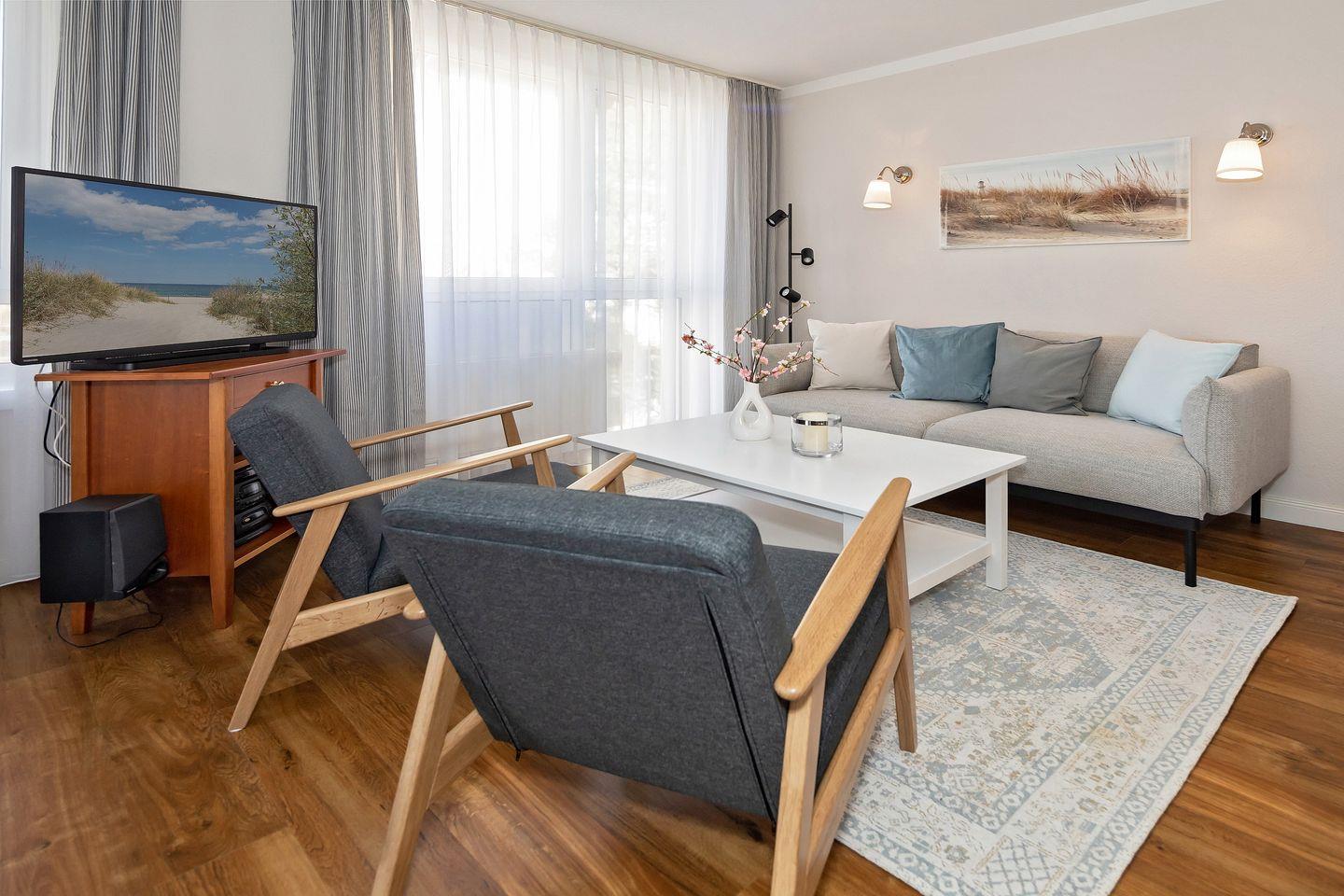 Strandnah und inmitten einer grünen Parkanlage und liegt dieses 56 qm große 3-Zimmer Apartment mit Balkon für bis zu 4 Personen.