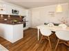 Zur Ausstattung des Apartments gehört eine voll ausgestattete offene Küche mit Wasserkocher, Kaffeemaschine, Toaster, Herd mit Backofen, Geschirrspüler, Mikrowelle und ein Kühlschrank mit Gefrierfach.