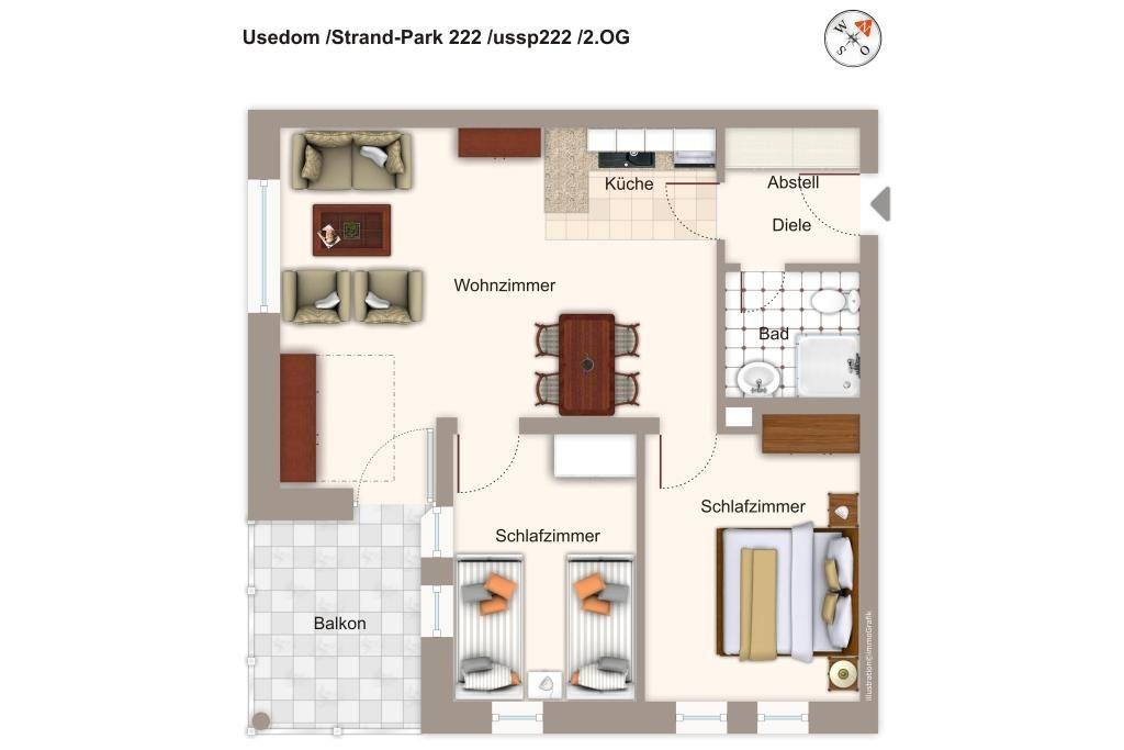 Die südwestlich gelegene Ferienwohnung befindet sich im 2. Obergeschoss von Haus 2 der Ferienanlage 'Strand-Park'. Die Strandpromenade und der feinsandige, kilometerlange Ostseestrand liegen praktisch vor eurer Haustür.