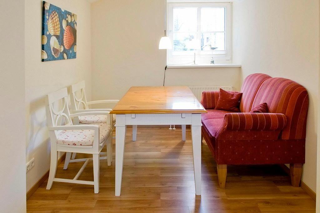 Die geräumige Nichtraucher-Ferienwohnung verfügt über kostenfreies WLAN und besteht aus zwei Schlafzimmern mit einem Doppelbett bzw. zwei Einzelbetten sowie aus einem Wohnbereich mit Flatscreen-TV, DVD-Player und HiFi-Anlage. Eine von außen zugängliche Terrasse gehört ebenso zur Wohnung wie die voll ausgestattete separate Küche mit Wasserkocher, Kaffeemaschine, Toaster, Herd mit Backofen, Geschirrspüler, Mikrowelle und einem Kühlschrank mit Gefrierfach. Das Apartment verfügt über ein Badezimmer mit Badewanne und Duschabtrennung, WC, Doppelwaschbecken, Föhn und Kosmetikspiegel.
