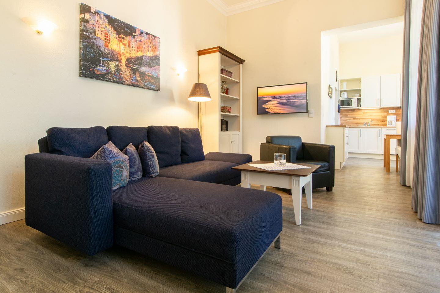 Die Nichtraucher-Ferienwohnung mit Duschbad verfügt über kostenfreies WLAN und besteht aus einem Schlafzimmer mit Doppelbett sowie dem Wohnbereich mit Doppelschlafcouch, Flatscreen-TV und HiFi-Anlage. Eine wunderschöne Loggia mit Rundbogen und Freitreppe mit Blick in den Park gehören ebenso zur Wohnung, wie die voll ausgestattete offene Küche mit Wasserkocher, Kaffeemaschine, Toaster, Herd mit Backofen, Geschirrspüler, Mikrowelle und einem Kühlschrank mit Gefrierfach.