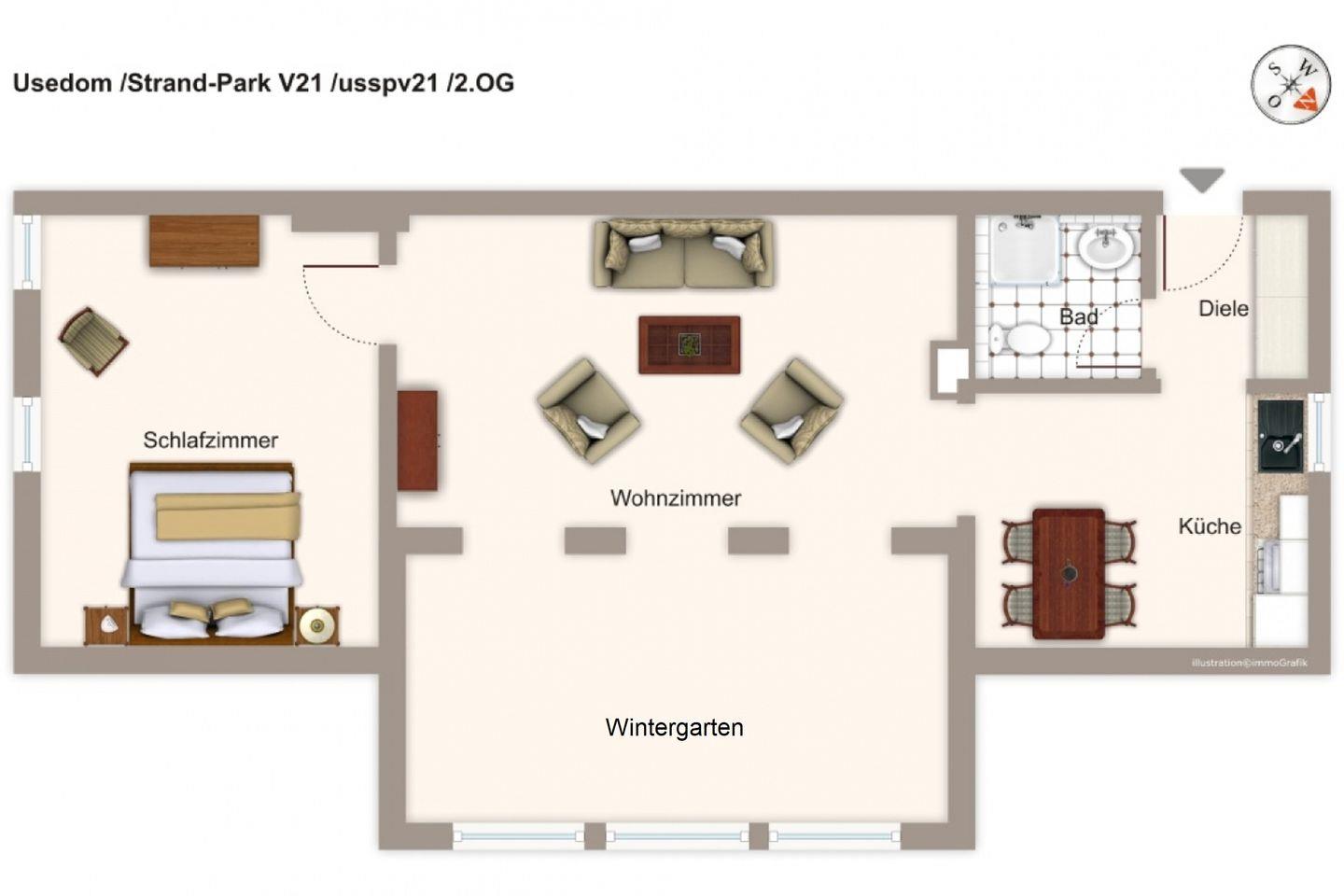 Die Ferienanlage „Strand-Park“ liegt direkt an der Strandpromenade von Heringsdorf. Das 70 qm große 2-Zimmer-Dachgeschoss-Apartment mit zur Ostsee gelegenem Wintergarten und Blick zur Strandpromenade ist für bis zu 4 Personen geeignet.