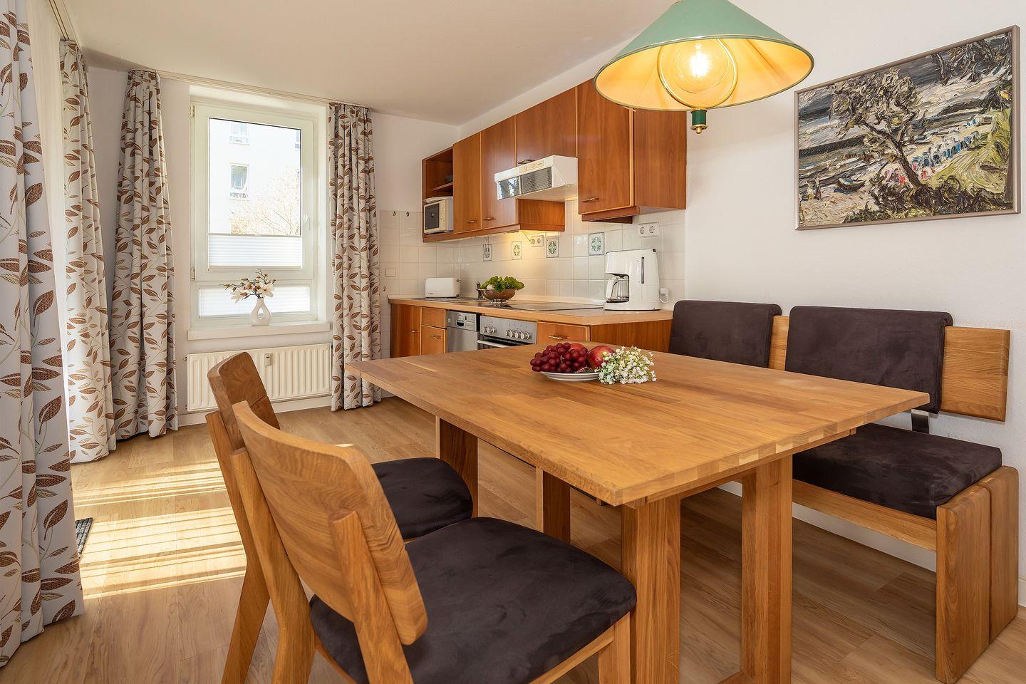 Das 45 m² große 2-Zimmer Apartment ist für bis zu 4 Personen geeignet. Besonders hervorzuheben ist der direkte Strandzugang und die schöne Terrasse in Süd-Ost-Lage mit Blick ins Grüne und auf die historische Villa des Strand-Parks.