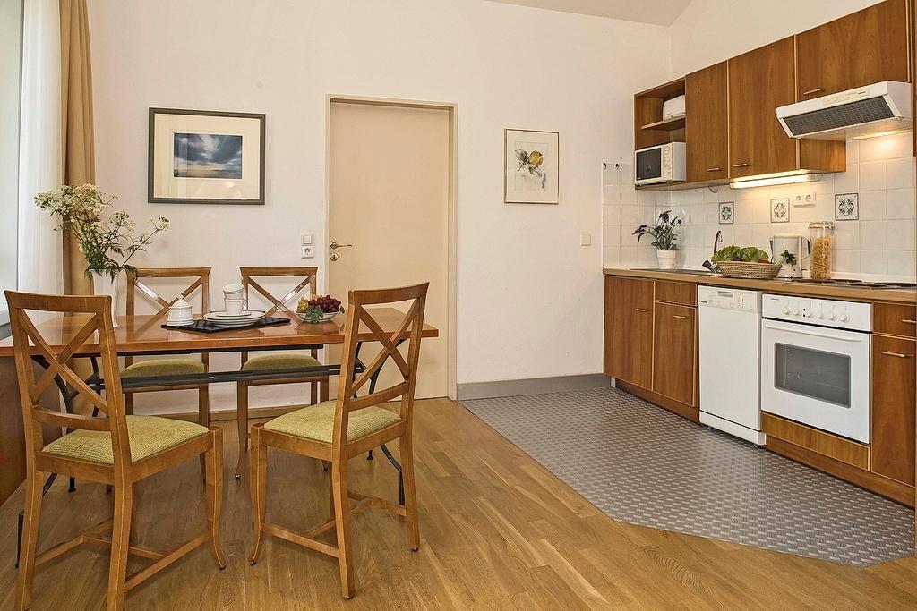 Das Apartment beinhaltet eine voll ausgestattete offene Küche mit Wasserkocher, Kaffeemaschine, Toaster, Herd mit Backofen, Geschirrspüler, Mikrowelle und einem Kühlschrank mit Gefrierfach.
