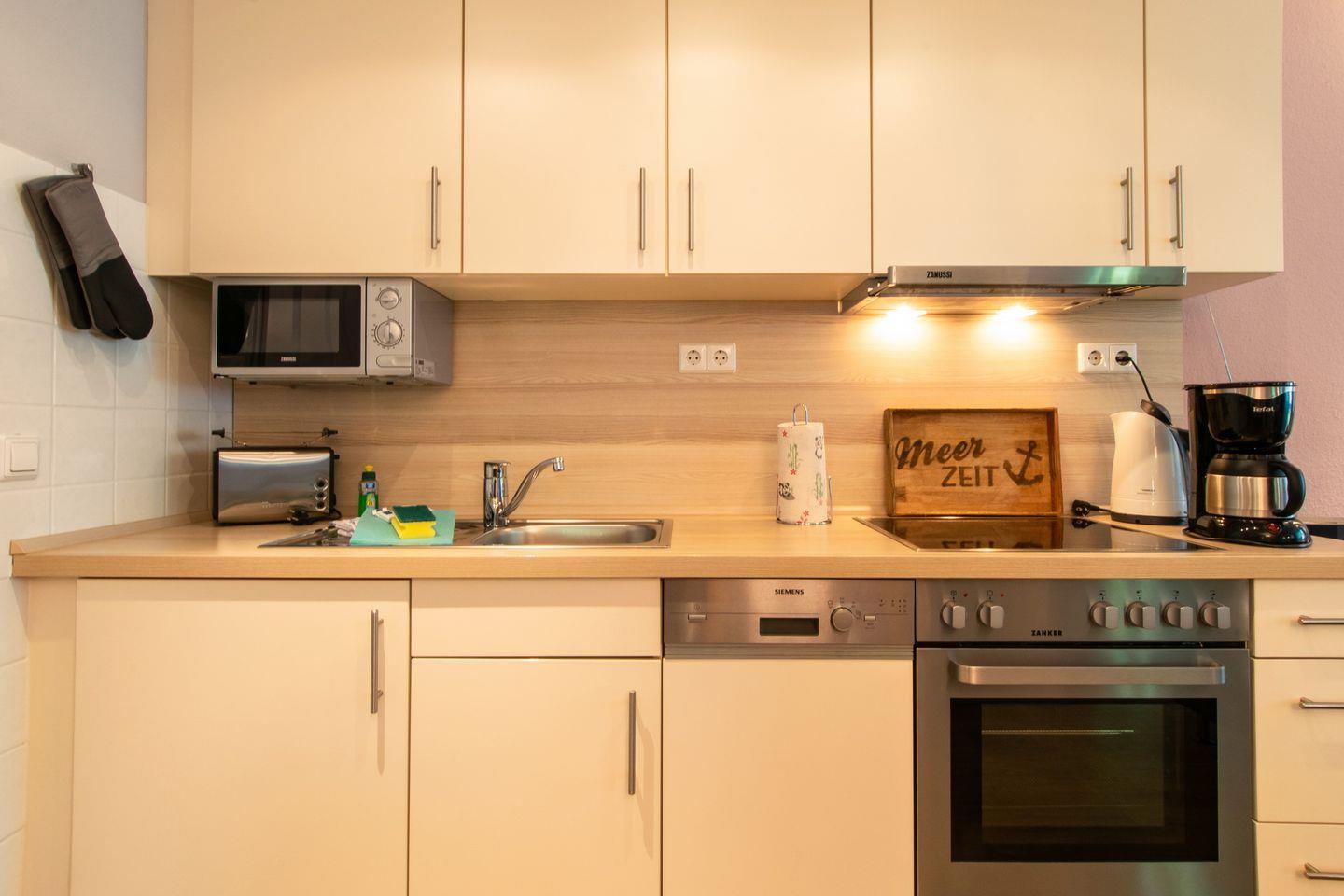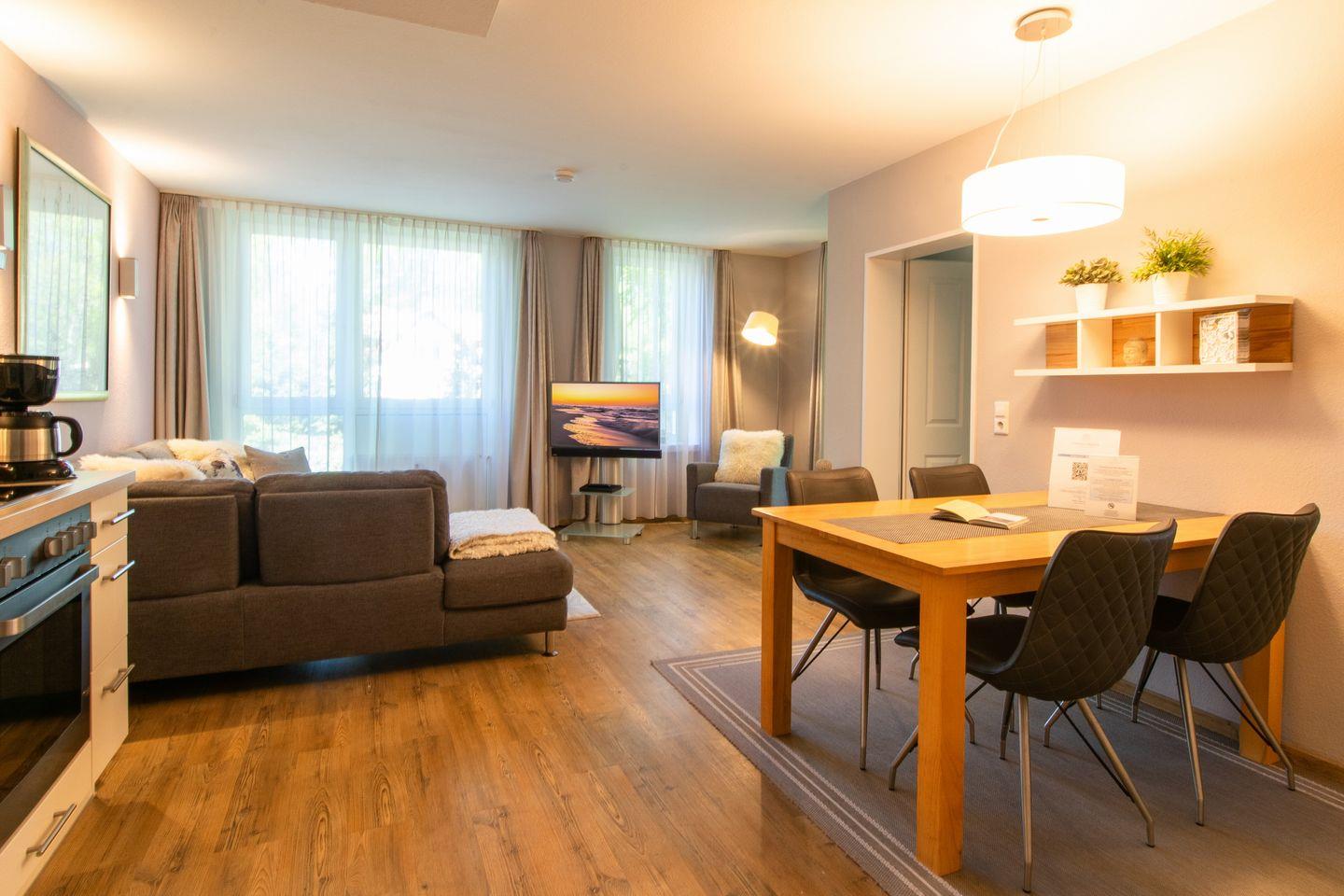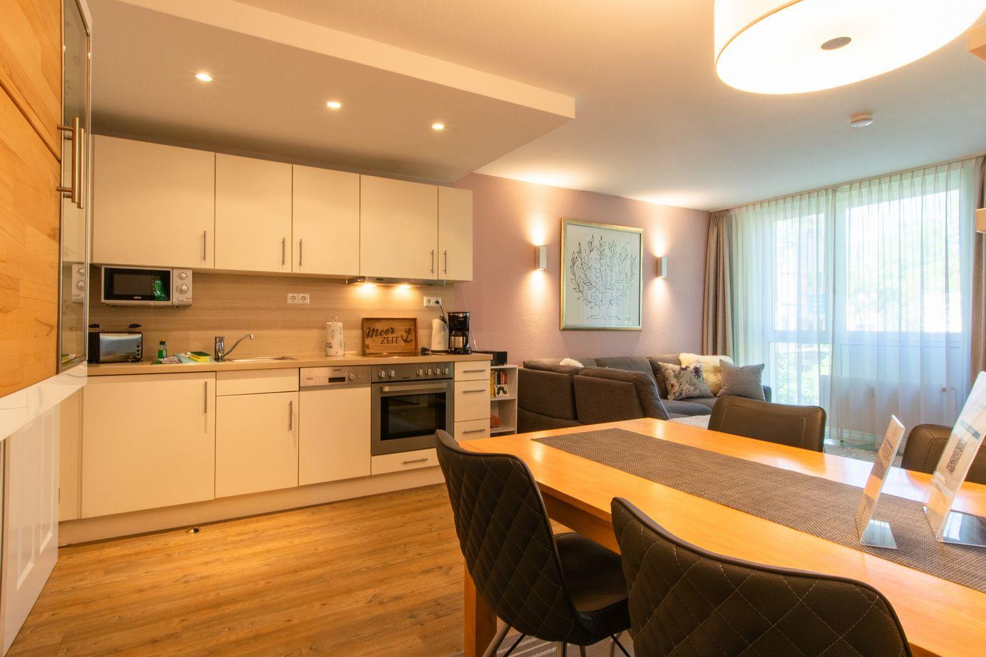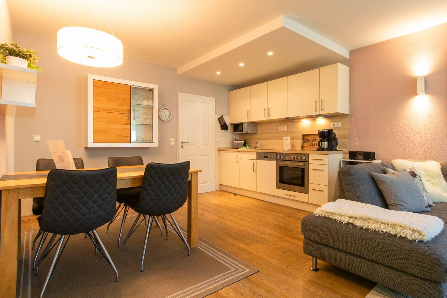 Das moderne Nichtraucher-Apartment ist liebevoll eingerichtet und verfügt über kostenfreies WLAN und eine voll ausgestattete offene Küche mit Geschirrspüler, Kühlschrank, Gefrierfach, Kaffeemaschine, Toaster, Wasserkocher, Mikrowelle, 4-Felder Ceranherd mit Backofen sowie über einen gemütlichen Wohn-Essbereich. Im Wohnbereich befindet sich eine Couchlandschaft und ein Flatscreen-TV mit Dolby Surround (40 Zoll), Blu-ray-Player, DAB-Radio mit Bluetooth, Bücher und Gesellschaftsspiele.