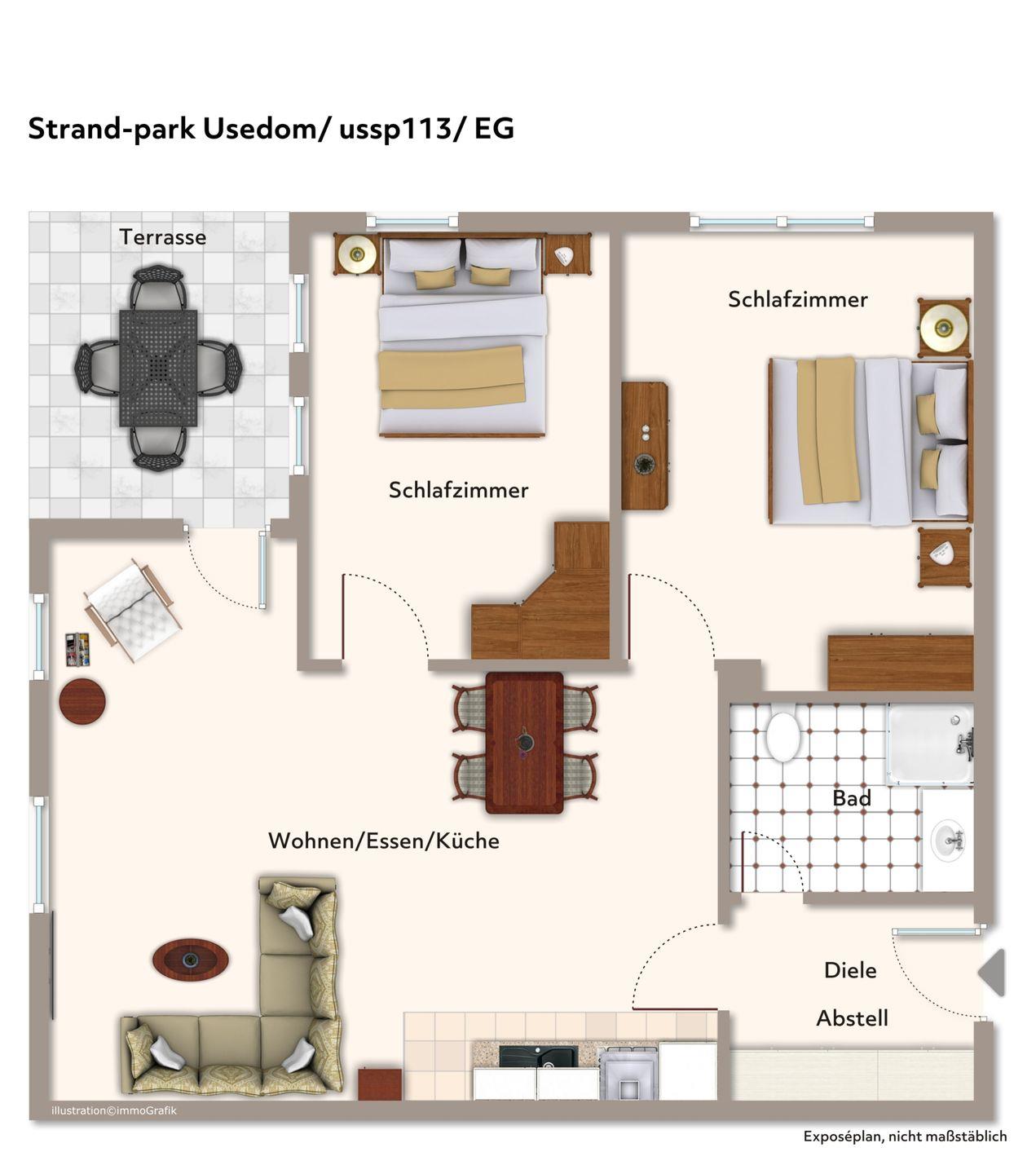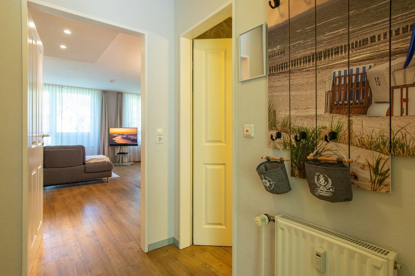 Das 56 m² große 3-Zimmer Apartment ist für bis zu 4 Personen geeignet. Besonders hervorzuheben ist die hervorragende Lage mit direktem Strandzugang und der schöne Balkon mit Blick ins Grüne und zur Meerseite gelegen.