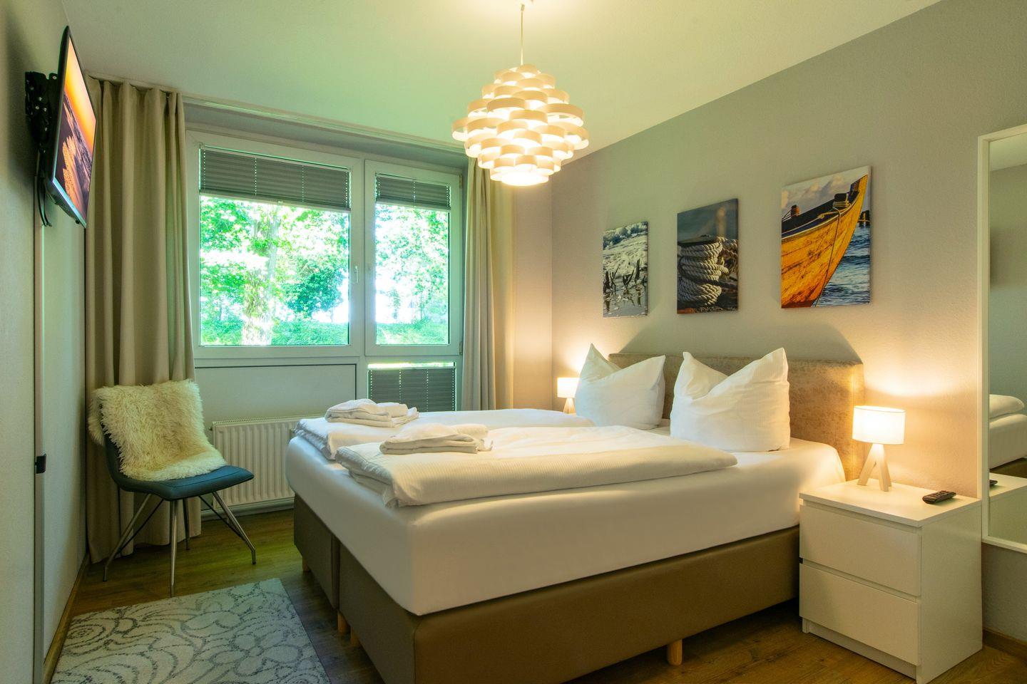 Beide separaten Schlafzimmer verfügen über ein Boxspringdoppelbett, Kleiderschrank und Flatscreen-TV (32 Zoll). Das Badezimmer beinhaltet eine Regendusche mit komfortablen niedrigem Einstieg, WC, Föhn, Kosmetikspiegel und Kindertritt.