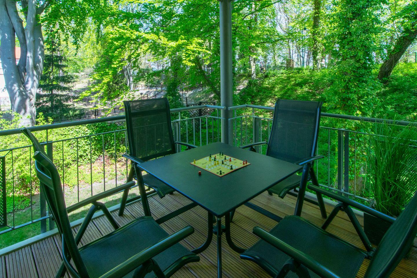 Entspannte Stunden im wohltuendem Meeresklima der Ostsee verbringt ihr auf dem überdachten und mit Gartenmöbeln ausgestatteten Balkon. Der Balkon ist vom Wohn-Essbereich aus zugänglich und befindet sich Nord-West-Lage - der Ostsee und der Strandpromenade zugewandt.