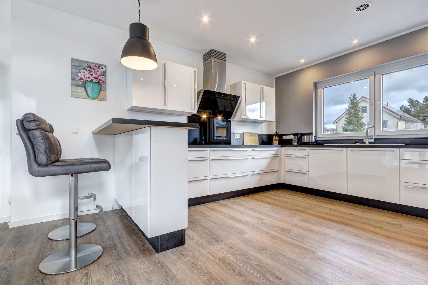 Der offen gestaltete, sehr großzügige Wohnbereich inklusive Küche bildet das Herzstück des Appartements und bietet Zugang zur überdachten Terrasse. Die großen, teilweise bodentiefen Fenster, die hohe Deckenhöhe bis zum Dachstuhl und die zwei-flügelige Tür zum Flur verleihen dem Raum zusätzliche Weite. Das Apartment verfügt unter anderem über: