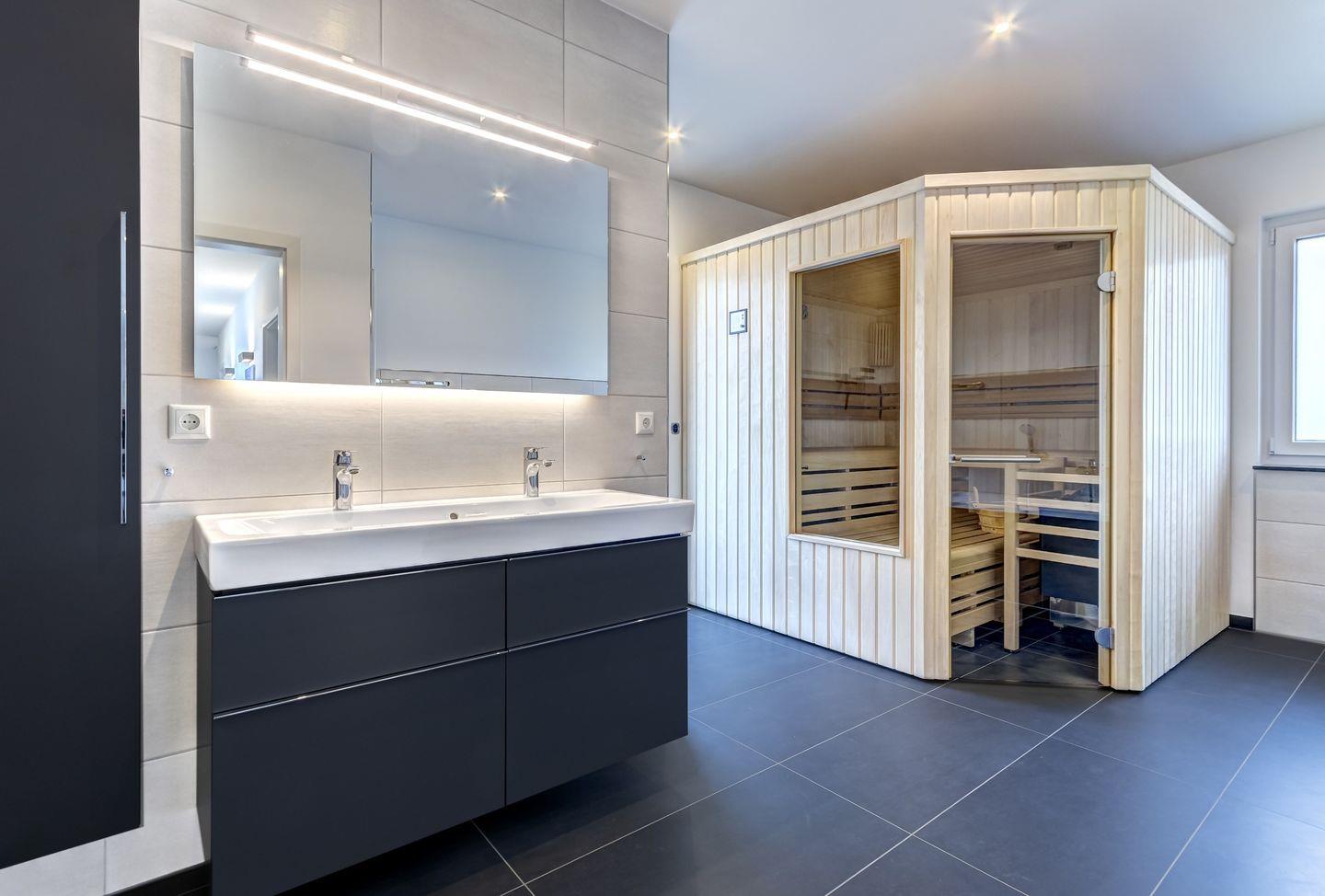 - ein Badezimmer mit WC, Badewanne und Walk-In-Dusche sowie Sauna,