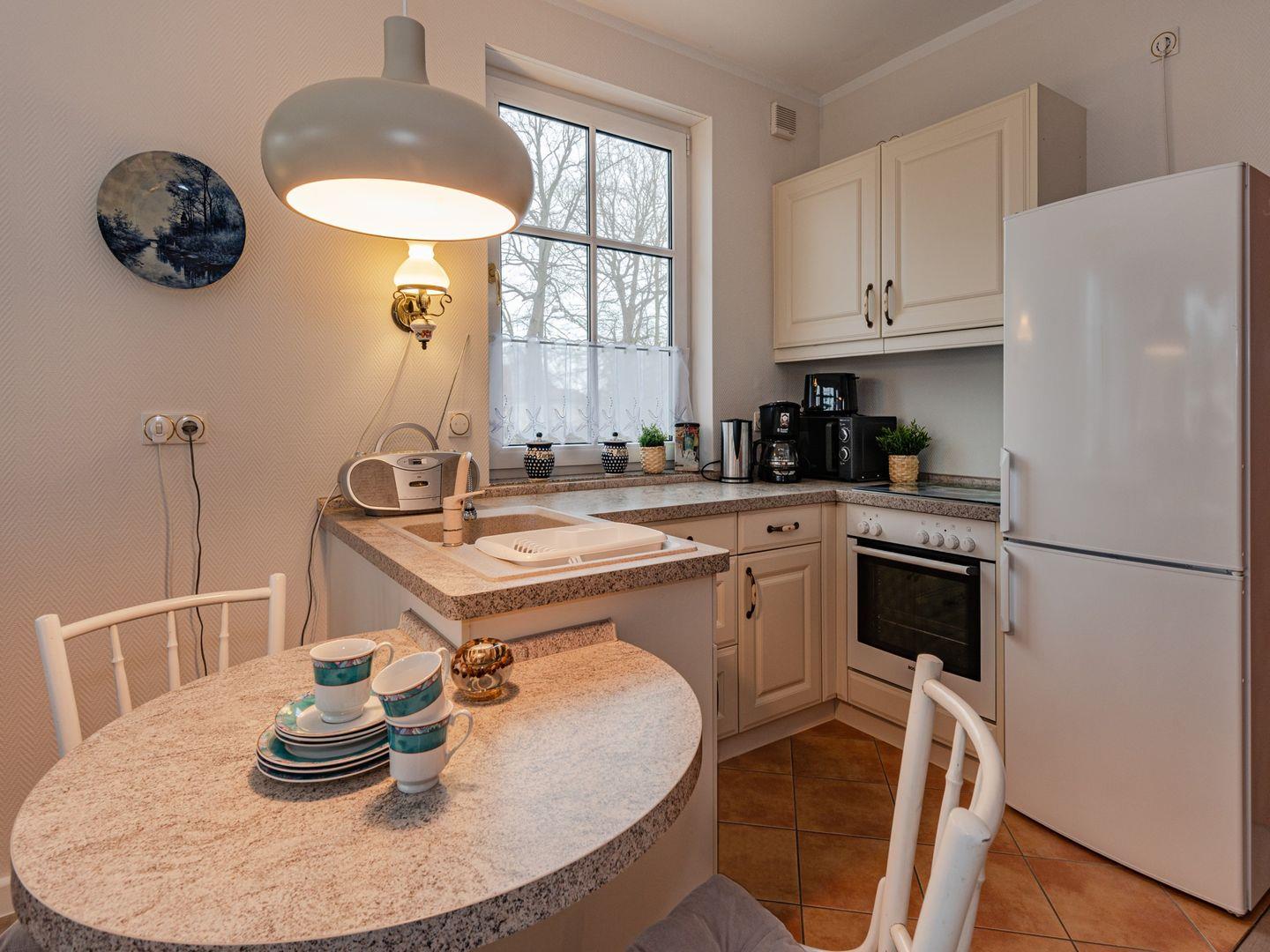 Nahe an der Promenade gelegenen begrüßt Sie das gemütliche Zwei-Raum-Appartement in der ersten Etage der Villa. Eine behagliche Sofalandschaft im Wohnzimmer, eine gut ausgestattete Küchenzeile mit einem integrierten Sitzplatz und das Schlafzimmer mit dem bequemen Doppelbett und dem zweiten Fernsehgerät lassen keine Wünsche offen. Ein sonniger Südbalkon, großzügige Einbauschränke, elektrische Rollläden und ein komfortables Badezimmer mit Badewanne werden Sie begeistern.