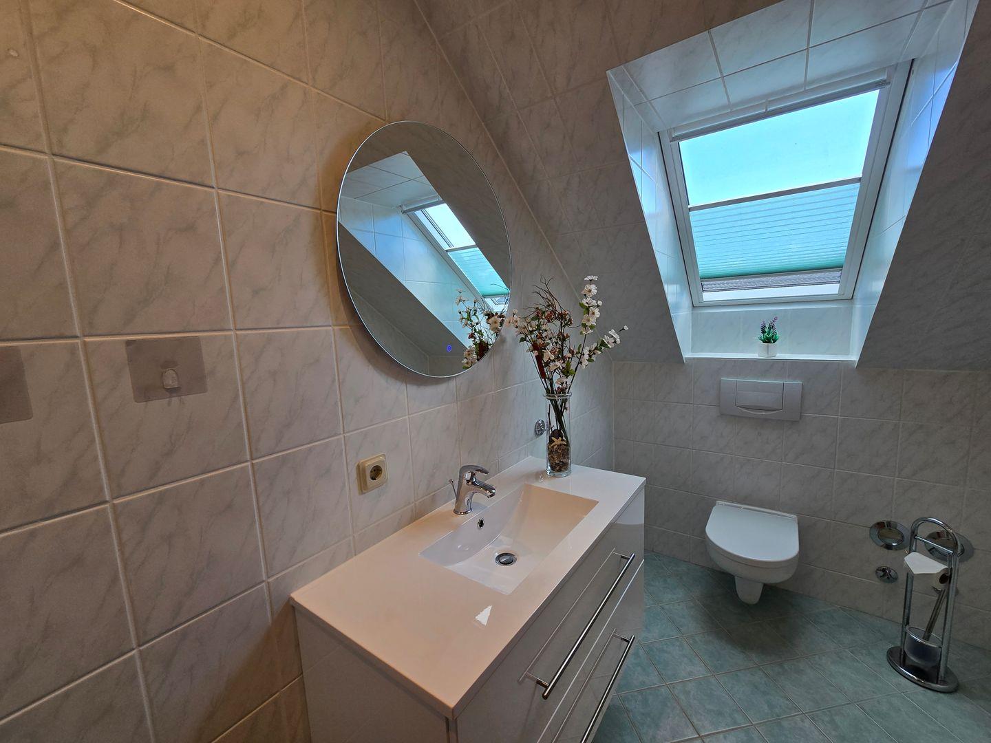 Das frisch renovierte Badezimmer, ausgestattet mit einem Fenster, bietet eine angenehme Atmosphäre. Hier erwartet Sie eine komfortable Dusche, die nach einem ereignisreichen Tag für erfrischende Momente sorgt.