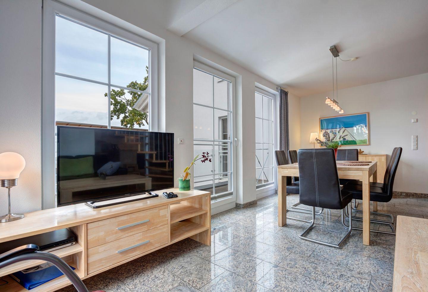 Im weitläufigen Wohn- und Essbereich können Sie die entspannte Atmosphäre genießen. Drei Schlafzimmer bieten Platz für bis zu 6 Personen.