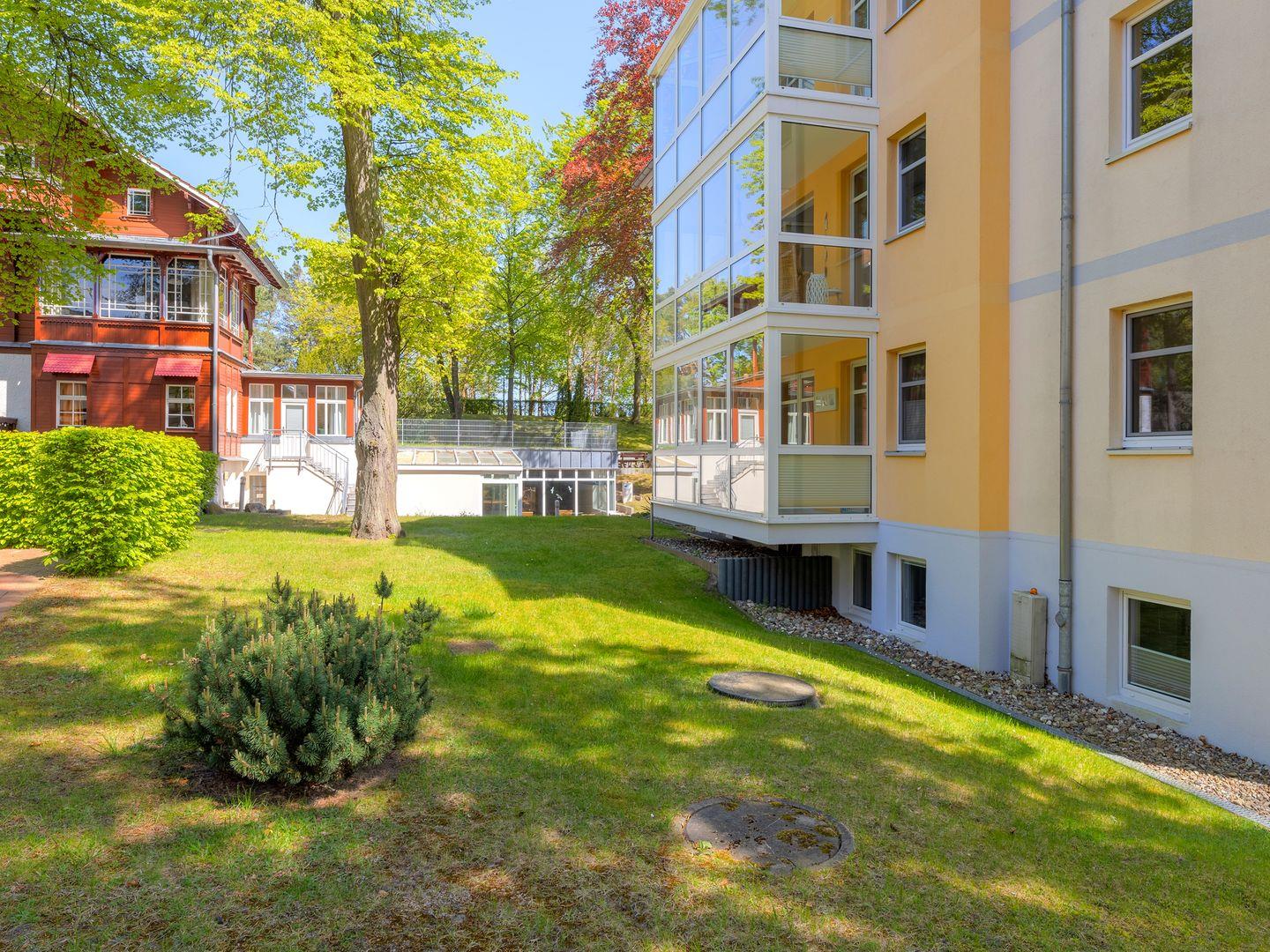 Das besondere Highlight dieser Ferienwohnung ist der gemütliche Wintergarten: Hier können Sie geschützt vor Wind und Wetter Ihr Frühstück genießen oder den Tag bei einem Glas Wein ausklingen lassen. Der Wintergarten bietet Ihnen einen herrlichen Blick auf das park ähnlich angelegte Grundstück und einen seitlichen Blick zur Strandpromenade – perfekt für entspannte Stunden unabhängig vom Wetter.