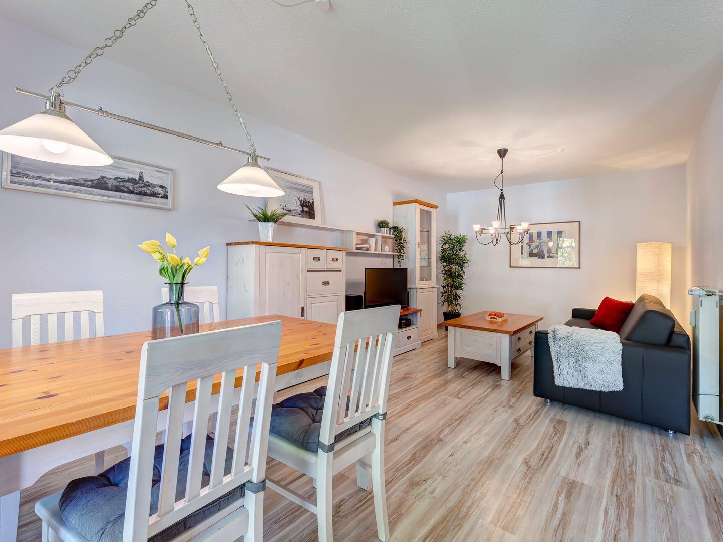 Auf insgesamt 62 m² im 1. Obergeschoss des Hauses Karavelle bietet diese helle Ferienwohnung großzügigen Raum für bis zu 4 Personen. Der Wohn- und Essbereich ist modern gestaltet und verfügt über eine komfortable Schlafcouch, die sich im Handumdrehen in ein vollwertiges Bett verwandeln lässt. Ein separates Schlafzimmer sorgt für zusätzlichen Komfort und Rückzugsmöglichkeit.