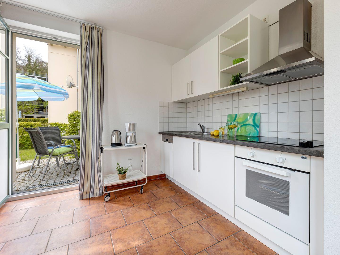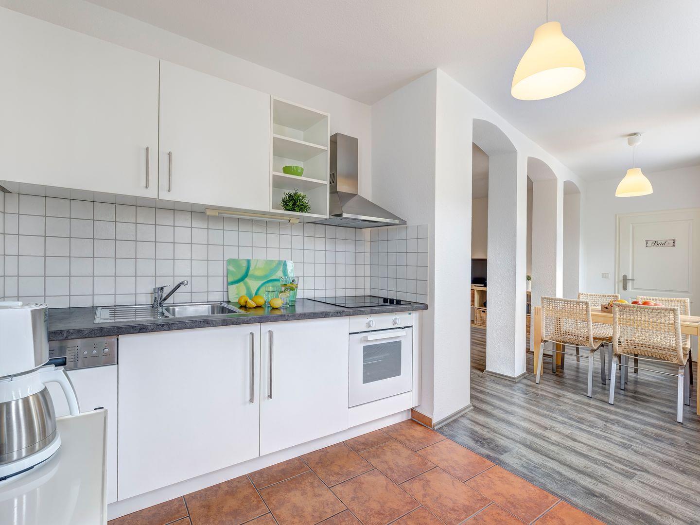 Die Ferienwohnung bietet Ihnen einen großzügigen, lichtdurchfluteten Wohn-Ess-Bereich, der keine Wünsche offenlässt. Eine bequeme Couchecke lädt zum Entspannen ein, der große Esstisch bietet Platz für gemeinsame Mahlzeiten, und die voll ausgestattete Küche macht das Kochen zum Vergnügen.