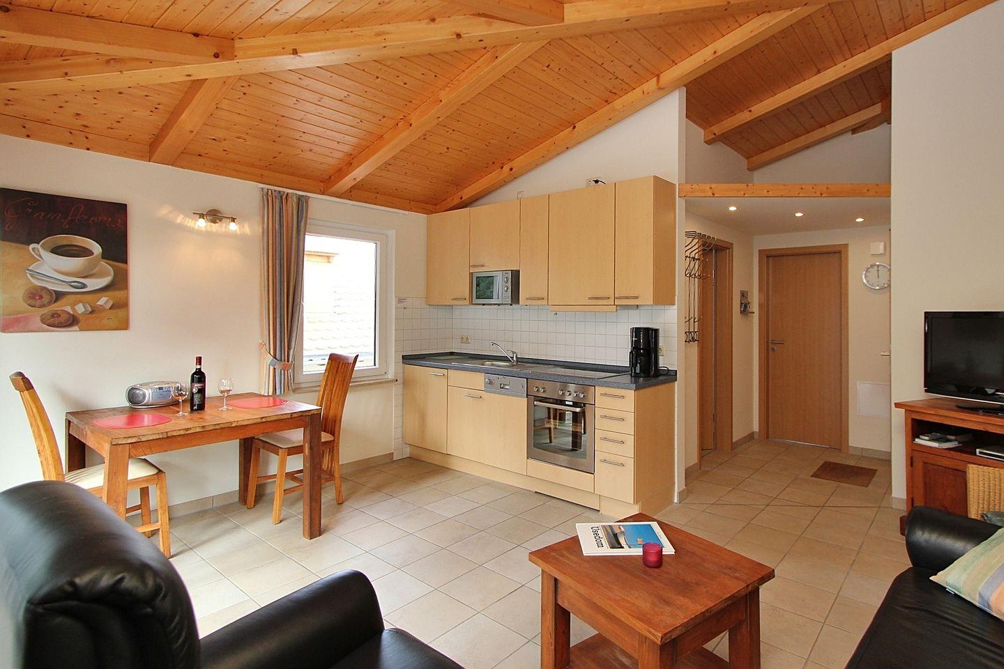 Die Ferienwohnung "Am Sonnenblick 6" bietet mit einem vollwertigen Schlafzimmer Platz für bis zu zwei Personen und ein Kleinkind. Im 2. Obergeschoss erwartet Sie ein einladender Wohnbereich mit Zugang zu einem schönen Balkon. Die moderne Küche ist vollständig ausgestattet und lässt keine Wünsche offen.
