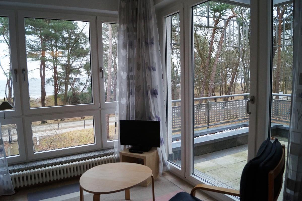 Der schöne Wohnbereich mit seinen bodentiefen Fenstern wurde aufgeteilt in einen Wohn- und einen Essbereich. Die separate Vollküche ist komplett mit hochwertigen Küchengeräten ausgestattet und lässt das Kochen auch im Urlaub zum Vergnügen werden. Das Wohnzimmer verfügt über ein hochwertiges Doppelbett, von dem man gleich beim Aufwachen einen wunderschönen Blick durch die Bäume auf die Ostsee genießen kann. Genau diesen Blick haben Sie auch von der verglasten Veranda und dem schönen großzügigen Balkon. Weitere Schlafmöglichkeiten befinden sich auf der Schlafcouch. Die schöne verglaste Veranda mit Blick durch die Bäume auf die Ostsee lädt zum Verweilen und Träumen ein.