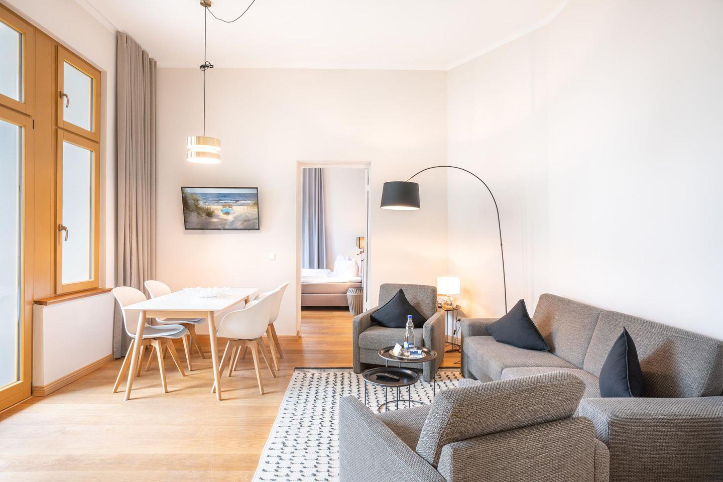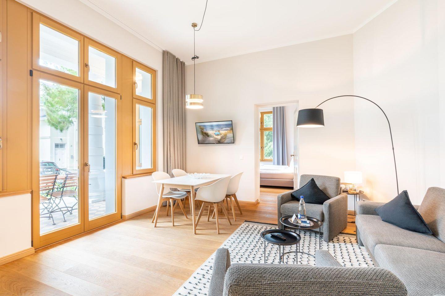 Die Ferienwohnung im Erdgeschoss verwöhnt Sie mit hellen und warmen Farbtönen. Moderne Möbel im nordischen Stil verleihen den lichtdurchfluteten hohen Wohnräumen eine nahezu unbeschwerte Leichtigkeit. Der aufwendig gearbeitete Holzfußboden unterstreicht die natürliche Wohnatmosphäre und lässt den Aufenthalt zu jeder Jahreszeit zum Wohlfühlerlebnis werden. Die im Wohnraum integrierte Einbauküche ist mit hochwertigen Markengeräten ausgestattet.