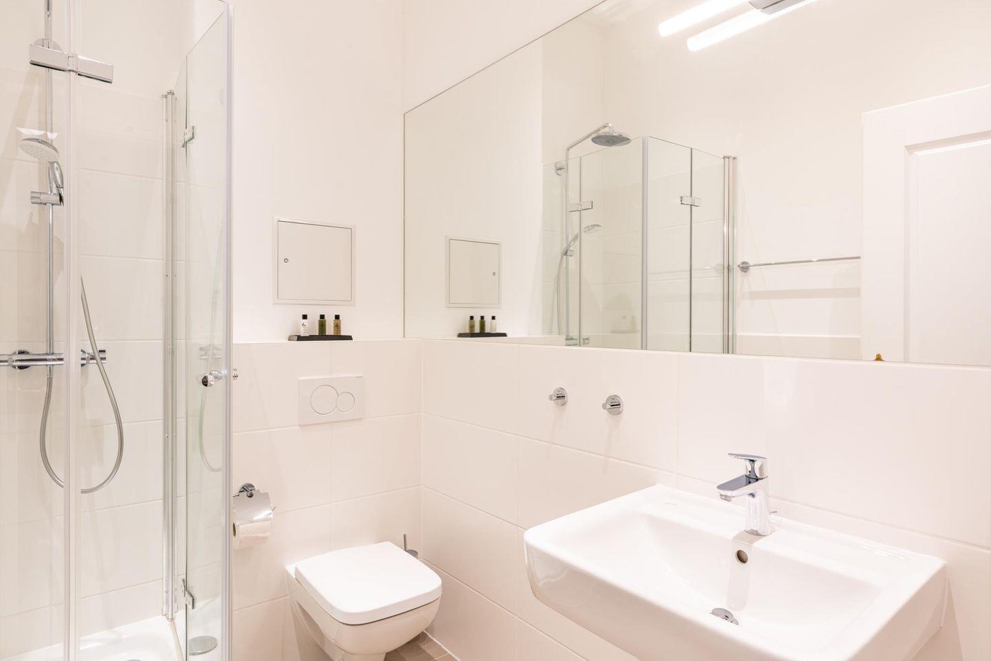 Das moderne Badezimmer verfügt über Dusche und WC sowie einen Heizkörper als Handtucherwärmer. Neben Handtüchern liegt auch eine kleine Auswahl an Pflegeprodukten bereit.