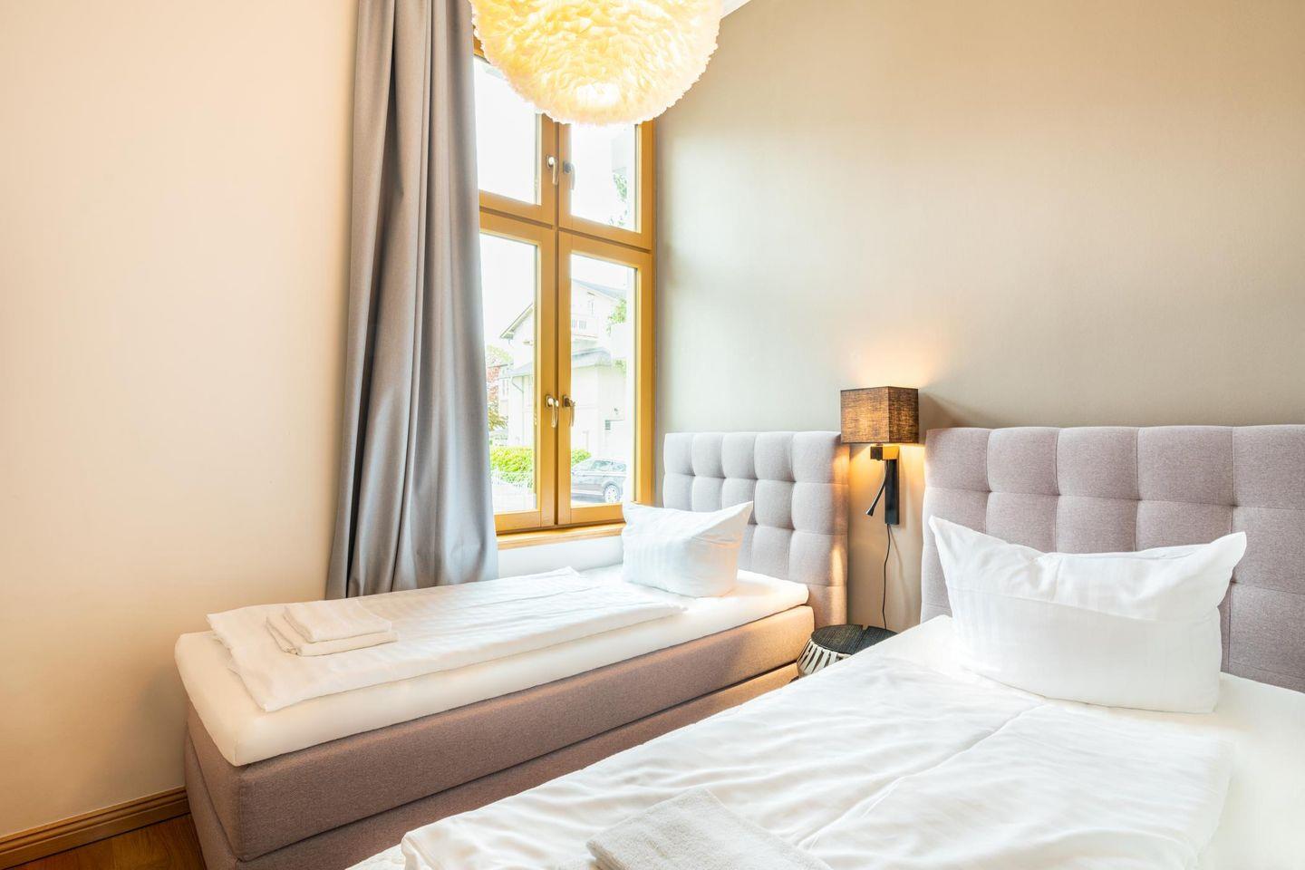 Es gibt zwei separate Schlafzimmer mit je einem Doppelbett bzw. zwei Einzelbetten. Beide versprechen mit hochwertigen Boxspring-Betten erholsamen Schlaf.